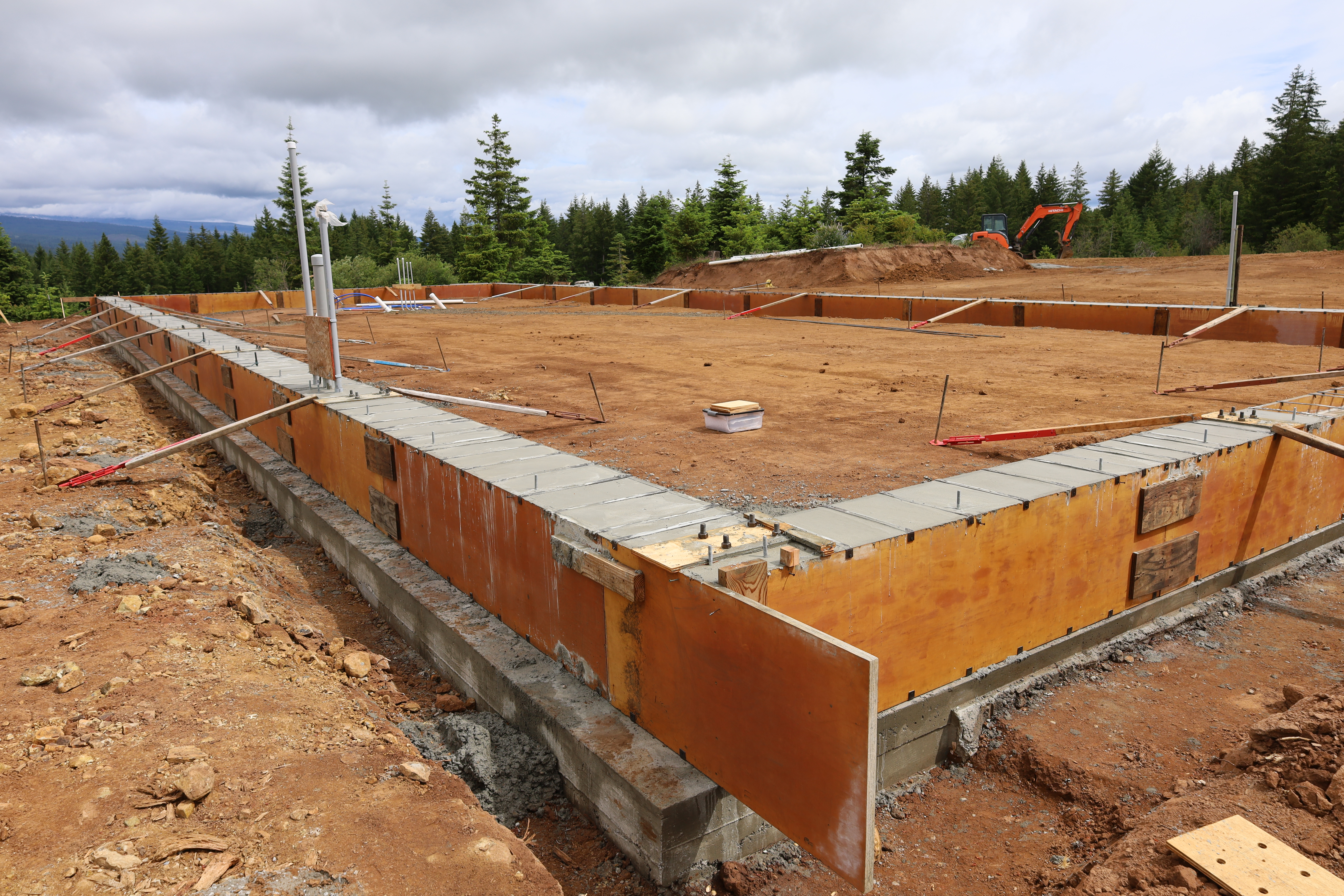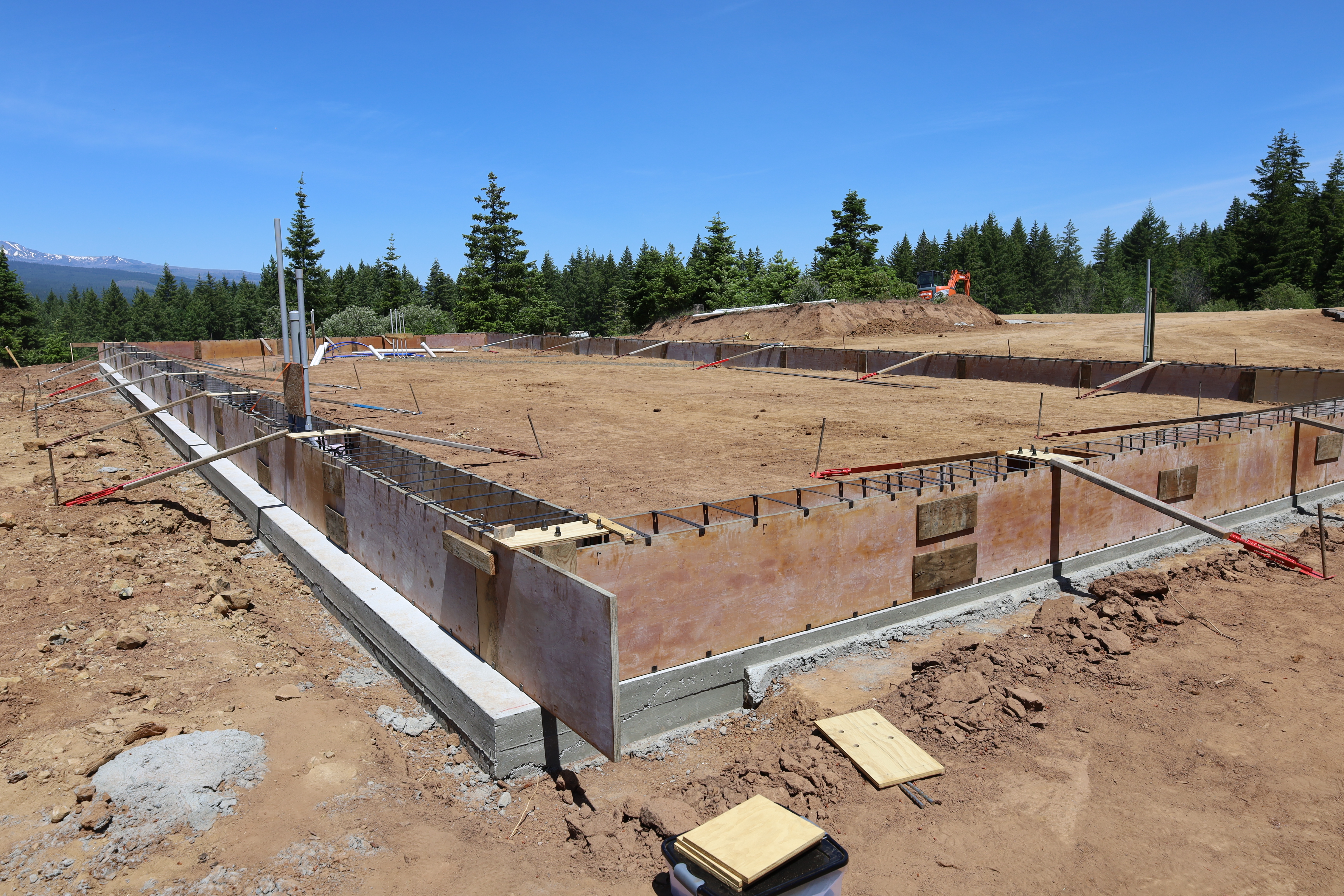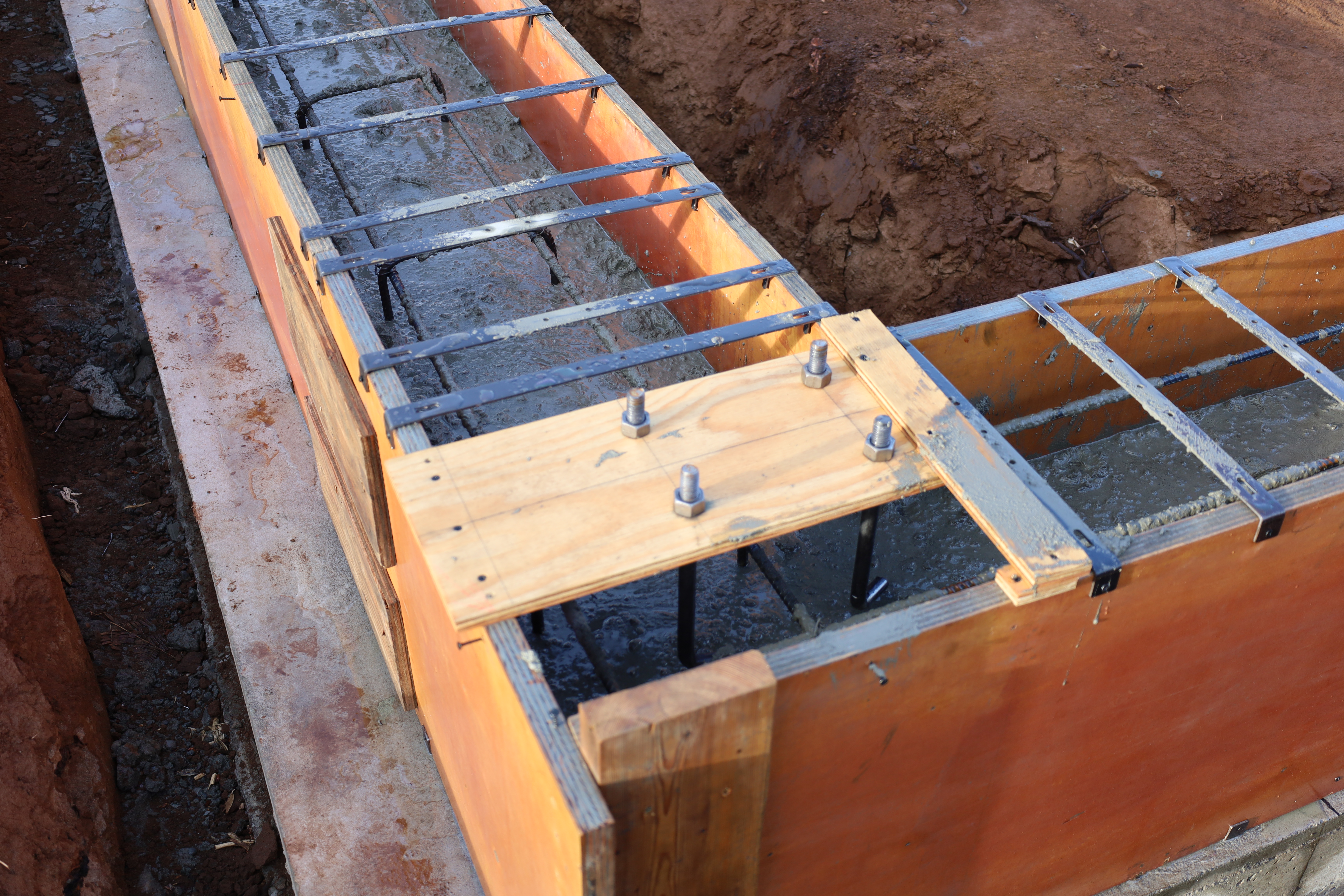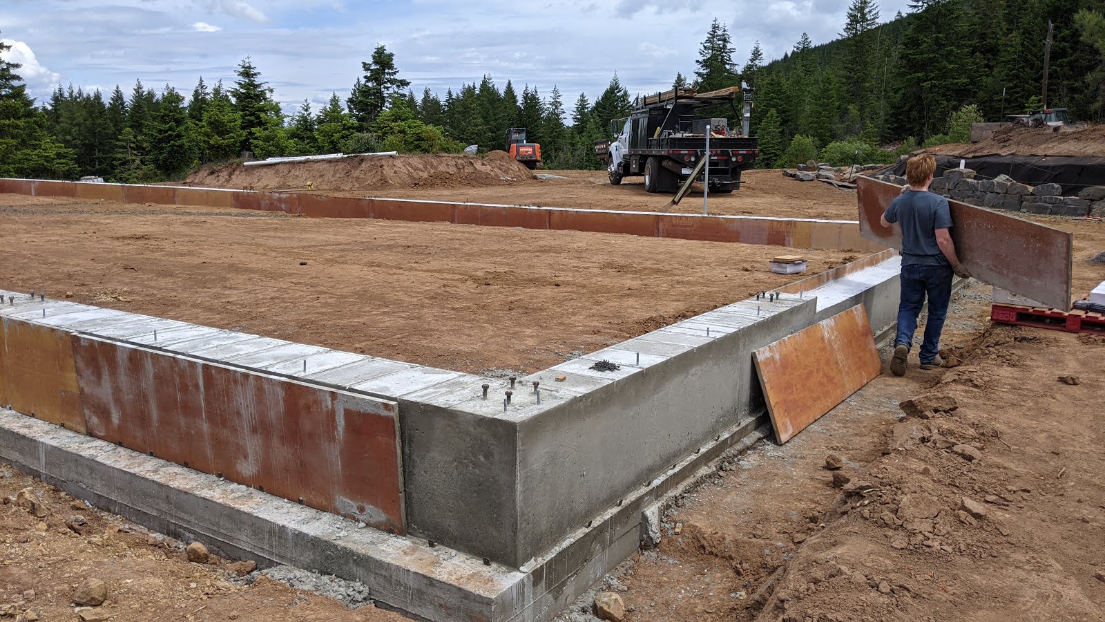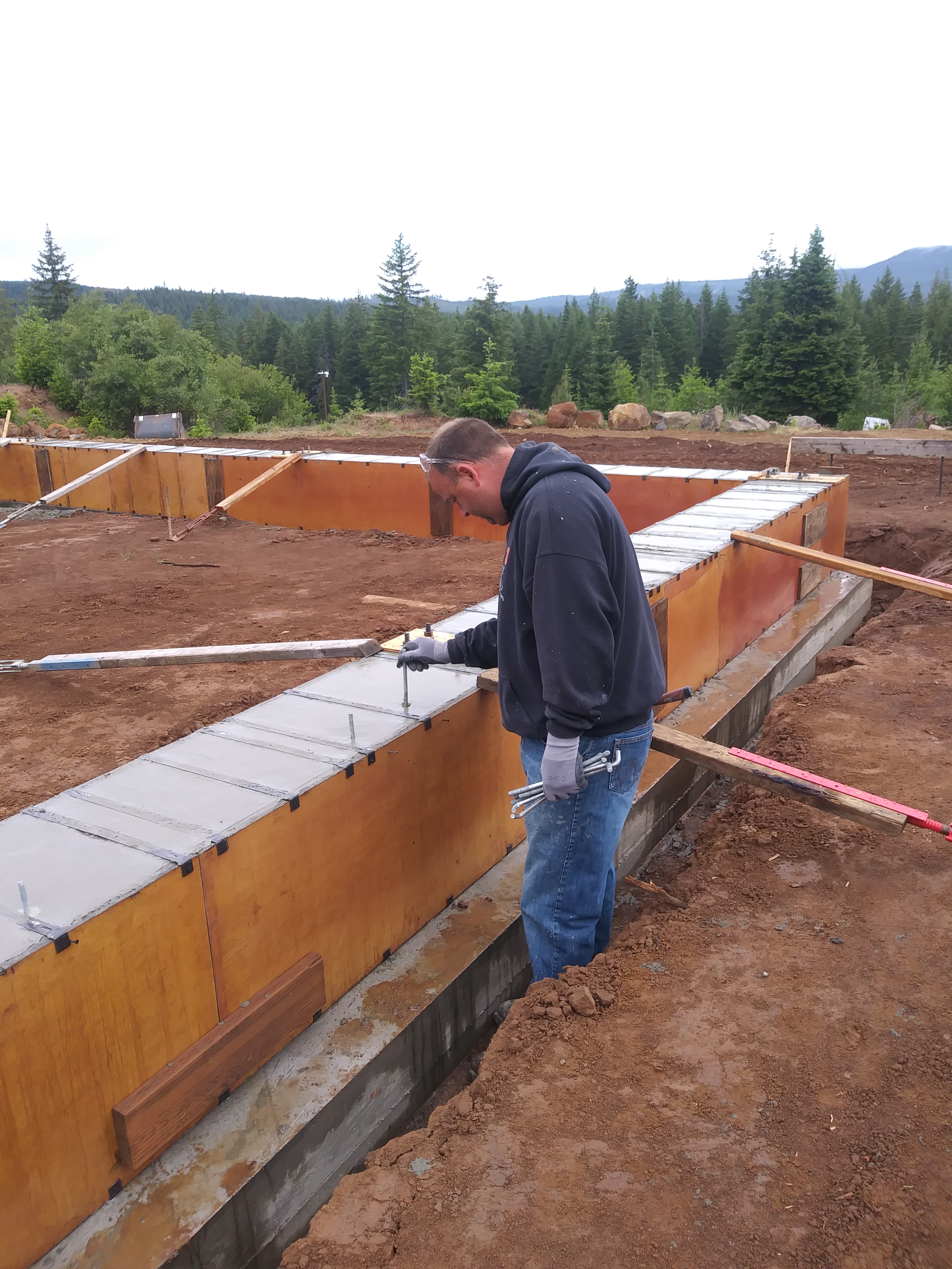 The crew returned the following day to remove the wood forms and to start preparing for the next pour – the stem wall. The stem wall sits on the footing and is tied to it with the hoops (those top hat things). It is 2 feet tall, 18 inches wide along the long sides, and 12 inches wide along the short sides. Spacers along the top and bottom edges of the forms help to hold the forms parallel.