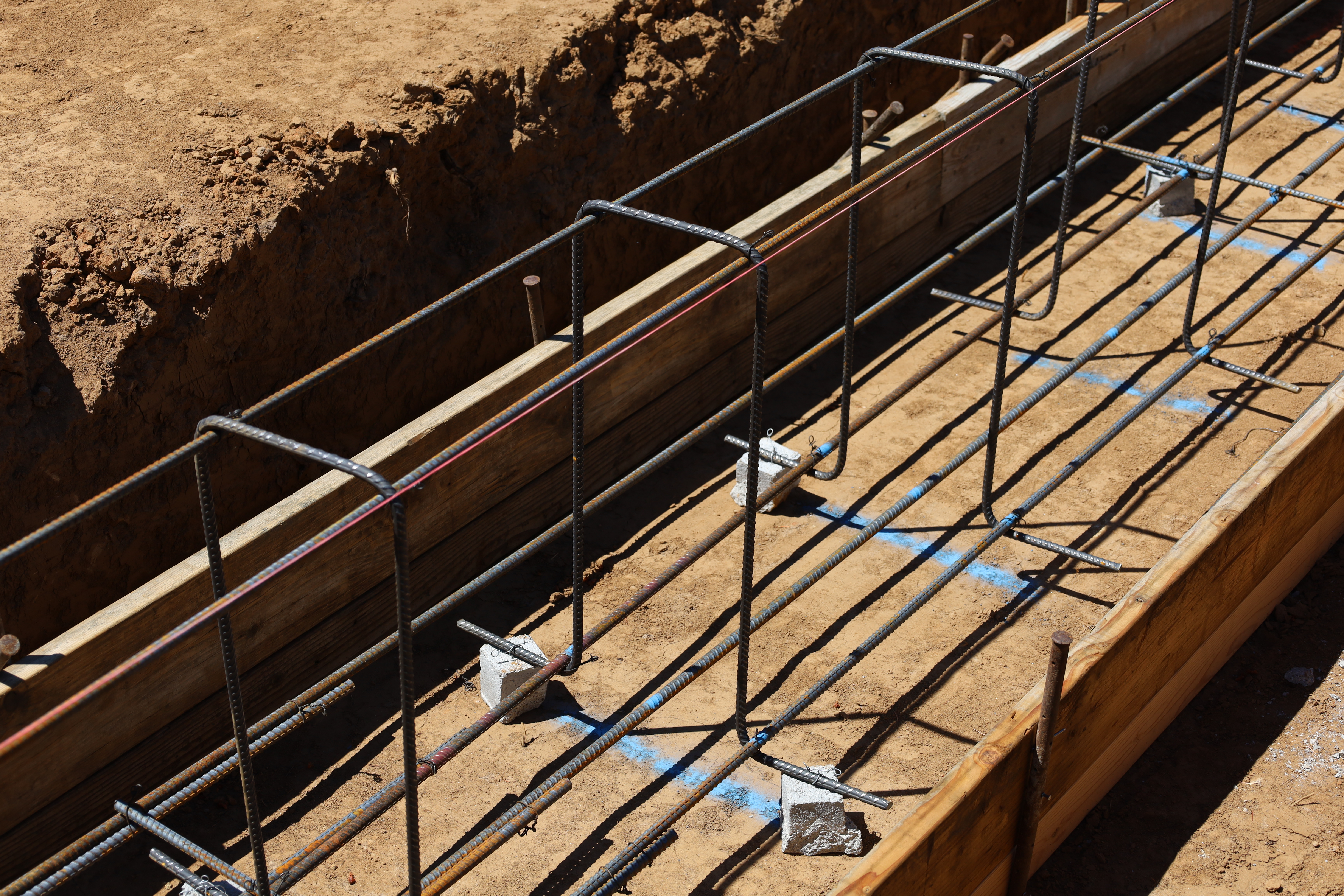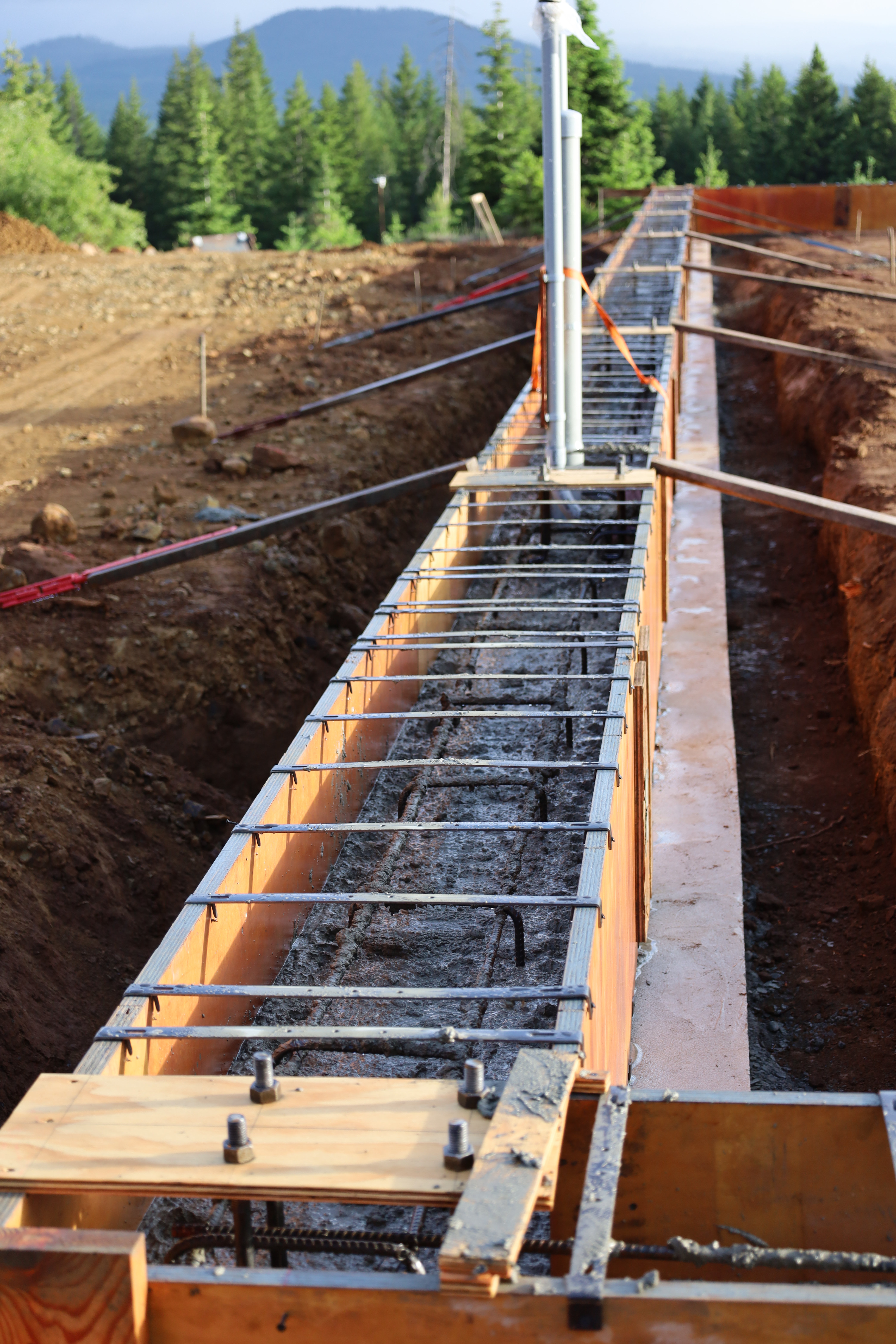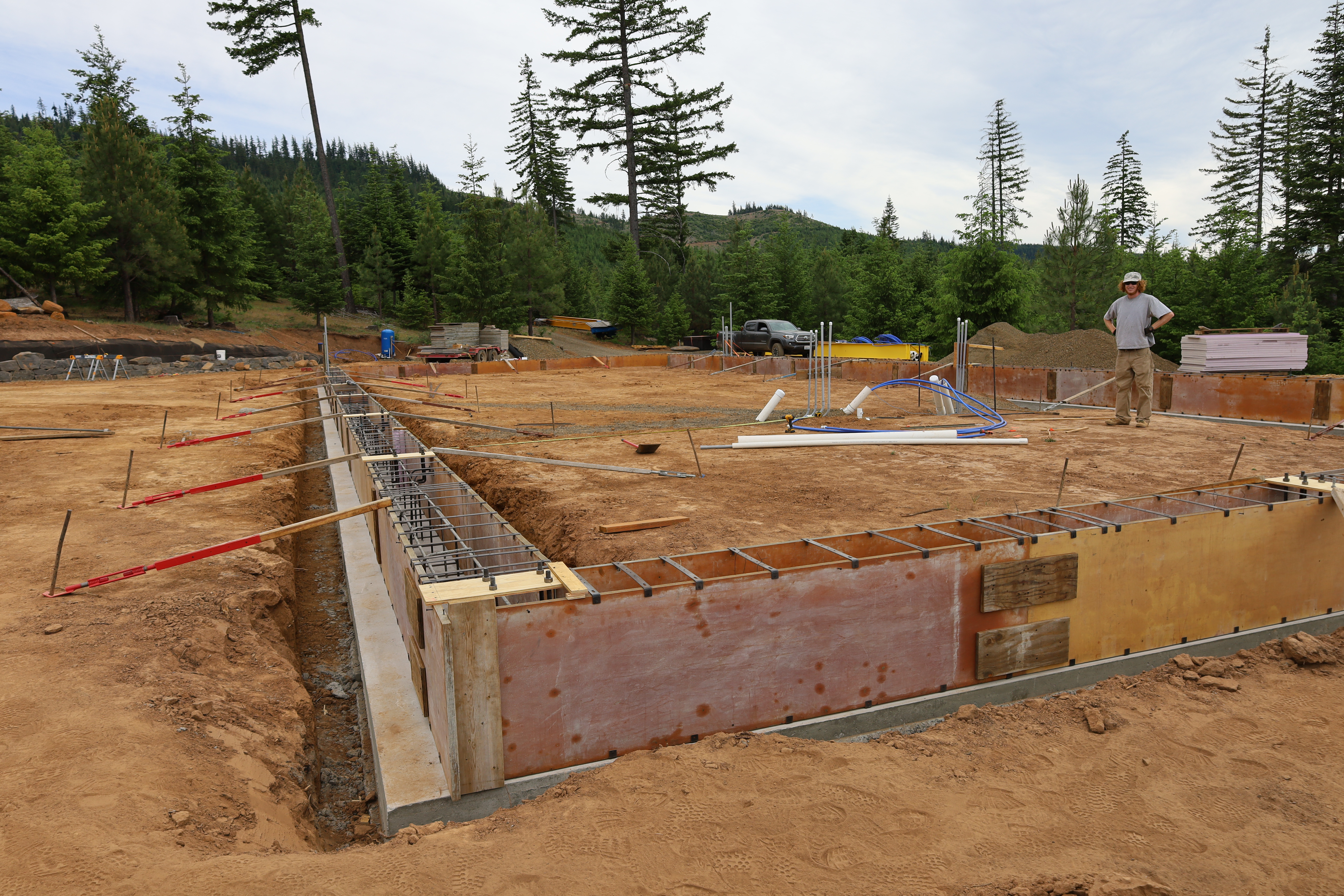 The excitement continues! Our concrete contractor, Matt, and his crew set up forms and a ton of rebar for the footing. There are rebar reinforcements running lengthwise around the perimeter, plus a ton of hoops (the things shaped like top hats). The lower halves of the hoops will be in the footing. The upper halves will be in the wall. The footing is 3 feet wide and about a foot deep.