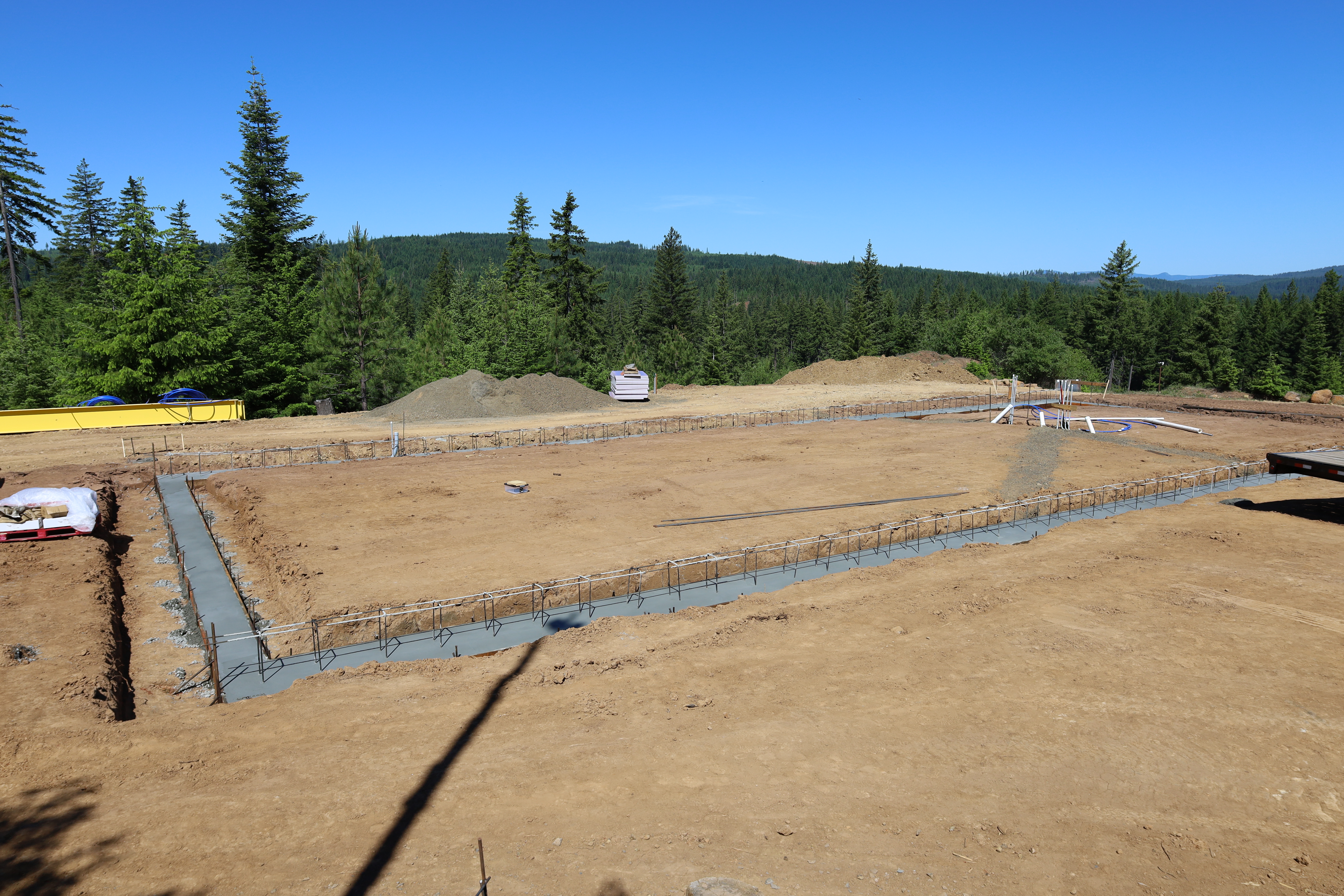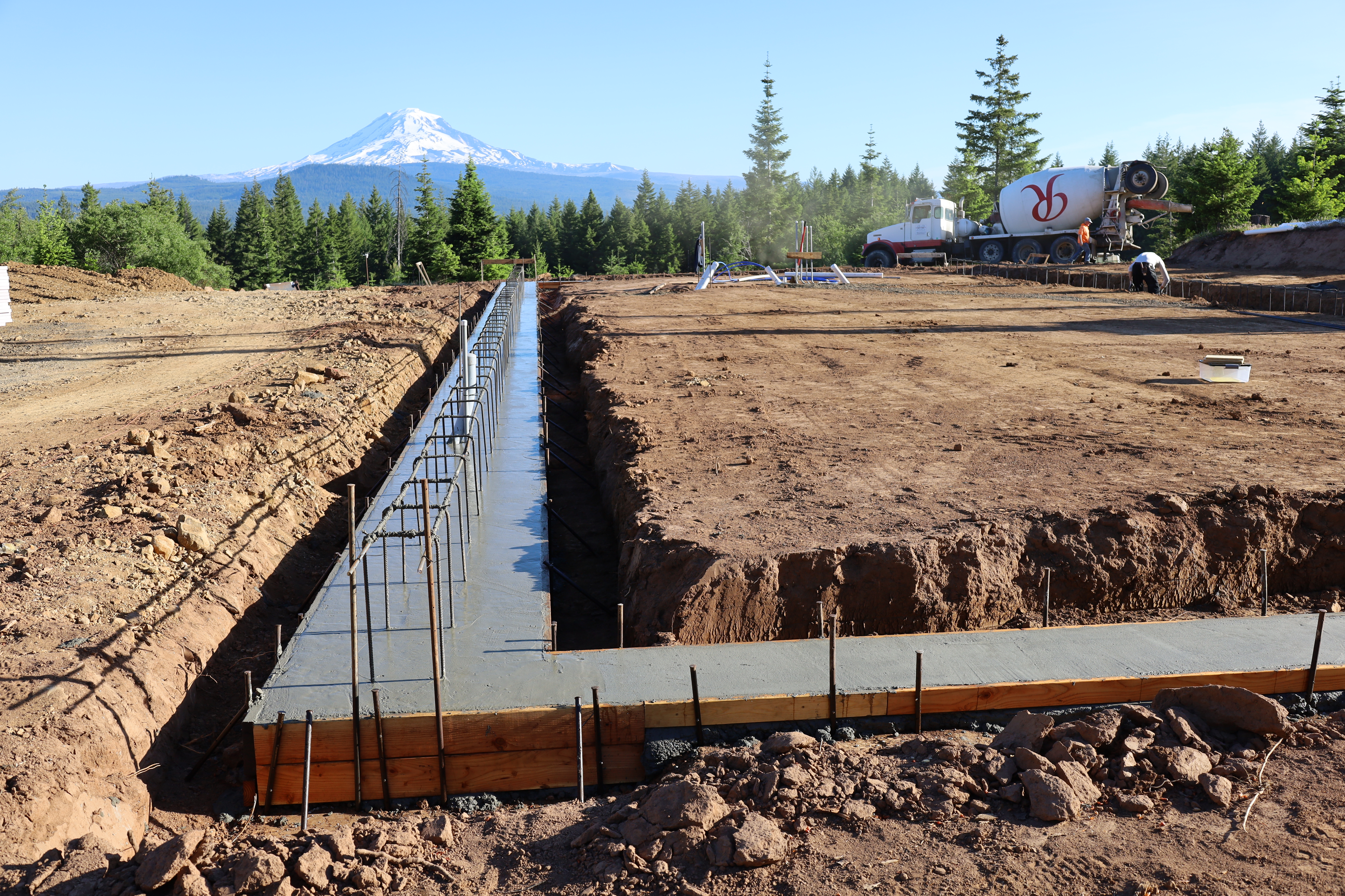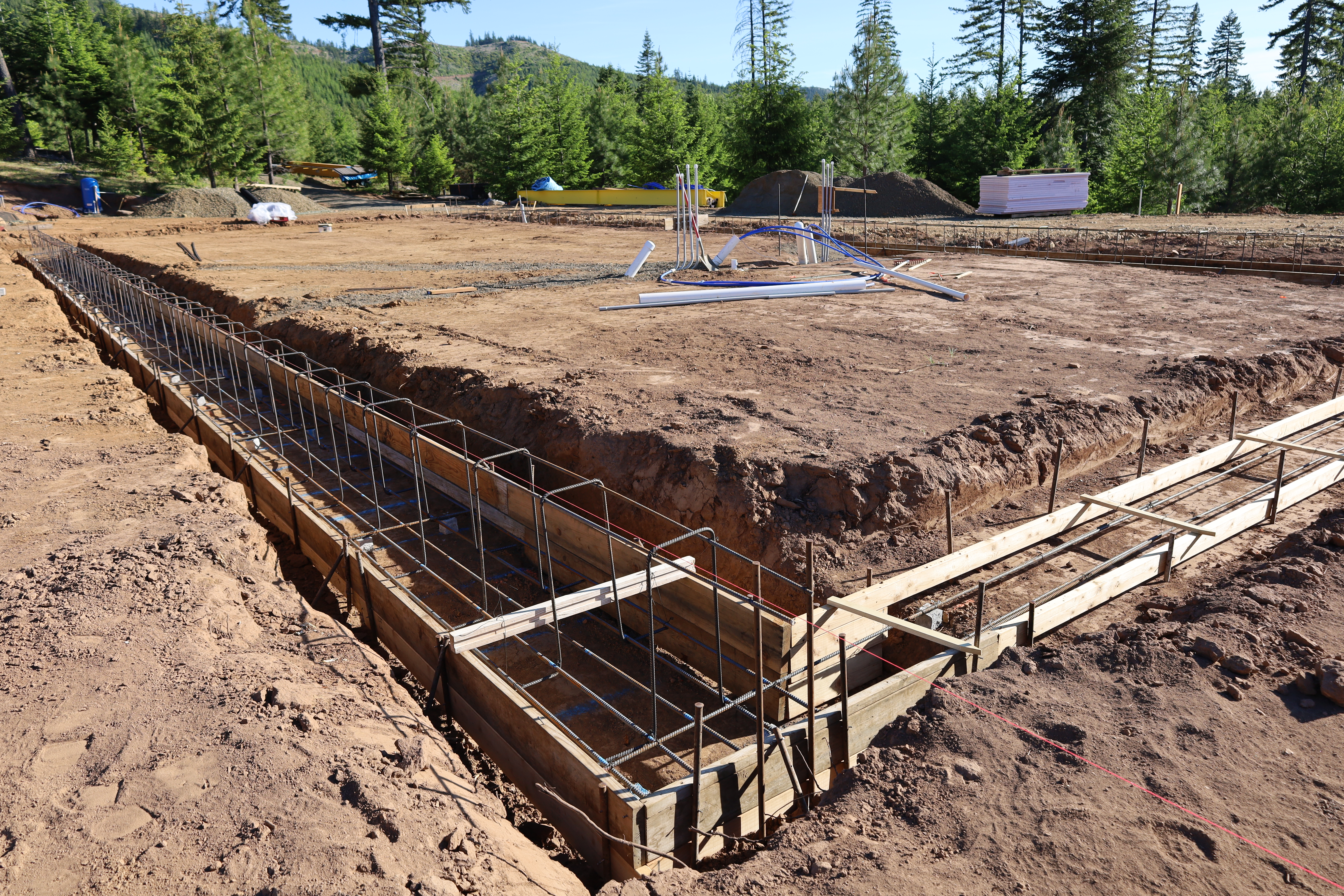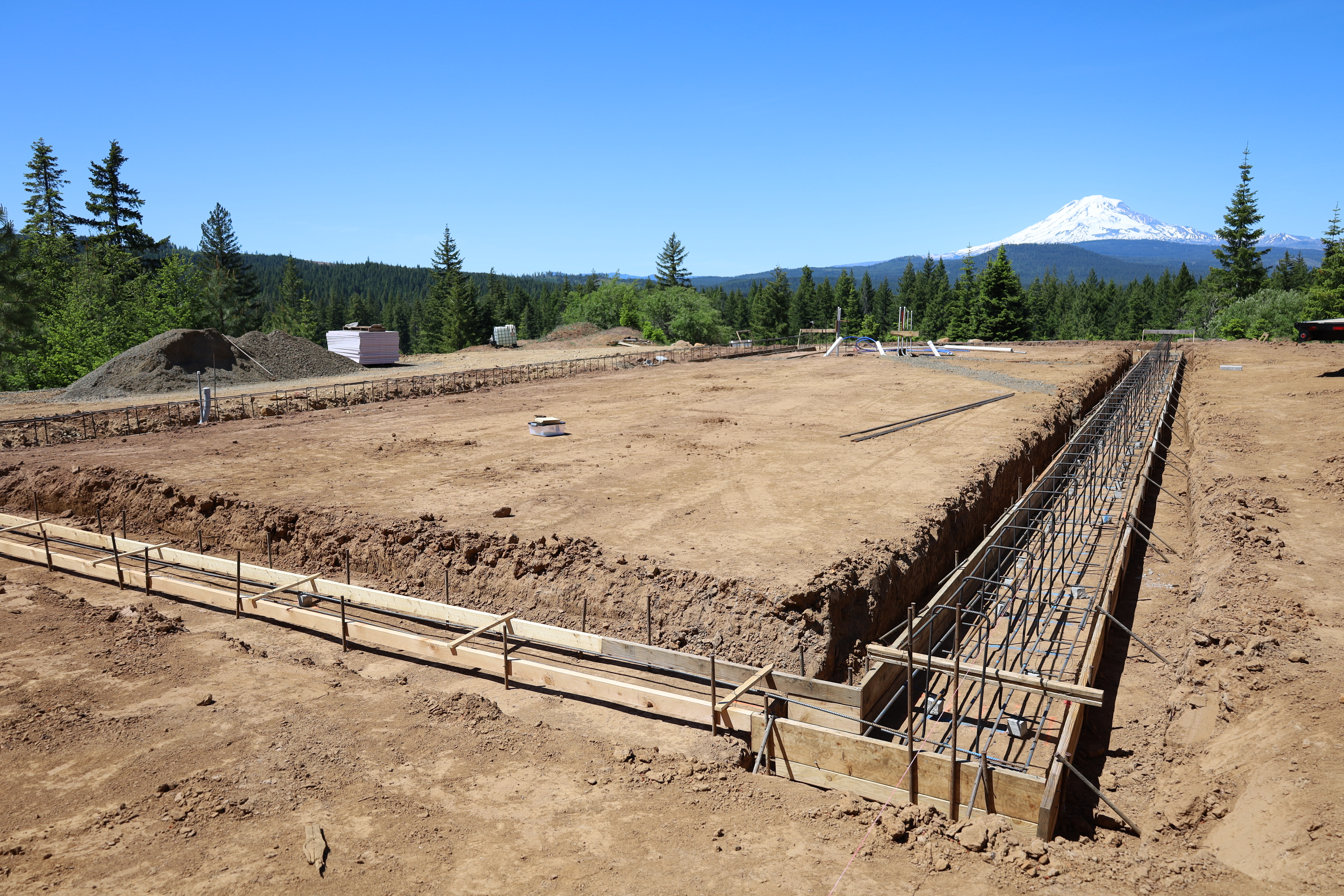 The excitement continues! Our concrete contractor, Matt, and his crew set up forms and a ton of rebar for the footing. There are rebar reinforcements running lengthwise around the perimeter, plus a ton of hoops (the things shaped like top hats). The lower halves of the hoops will be in the footing. The upper halves will be in the wall. The footing is 3 feet wide and about a foot deep.