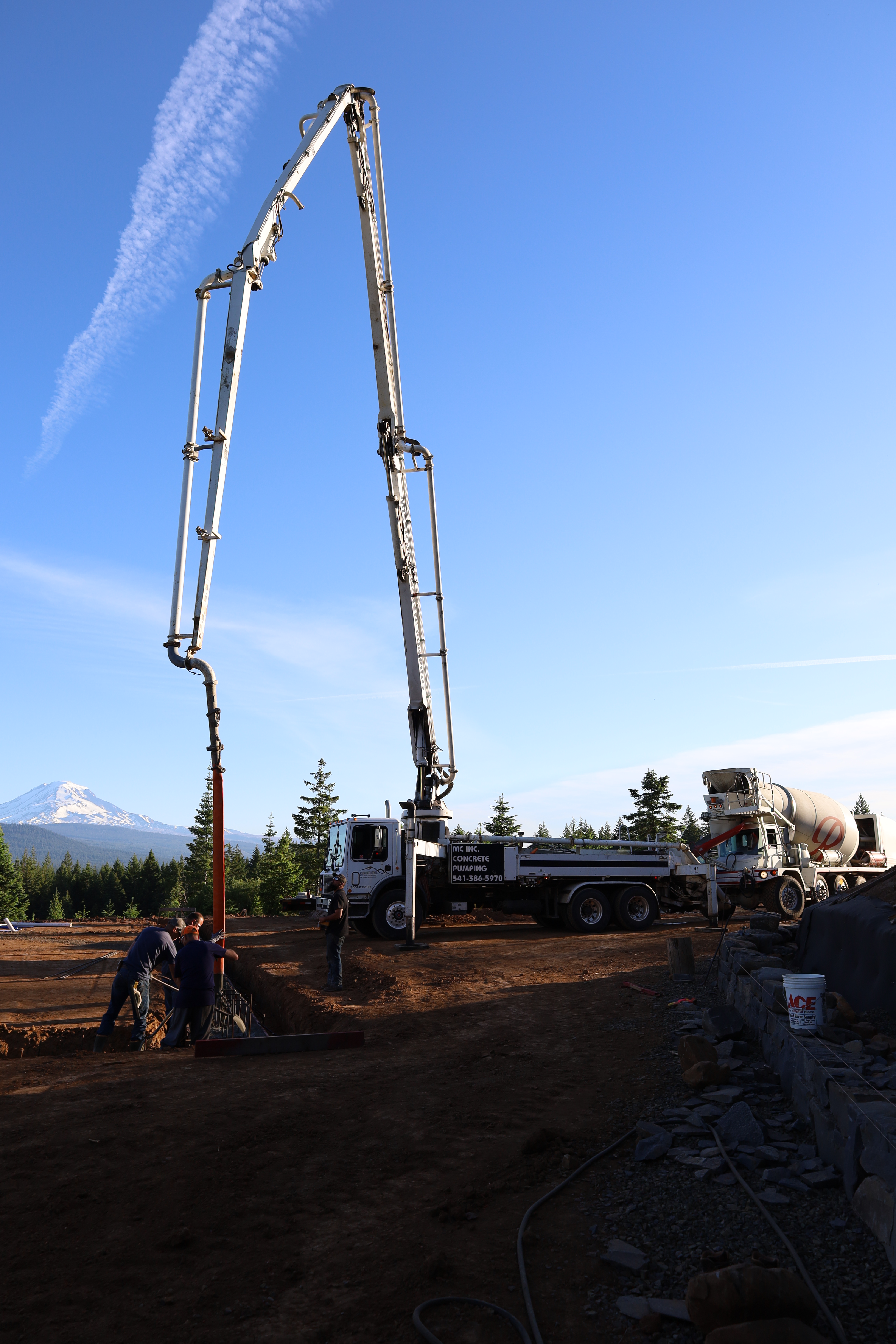 Just like the previous time, there were 3 truck loads of concrete. The concrete trucks back up to the boom truck and dump concrete onto a big grate before it gets pumped up the boom.