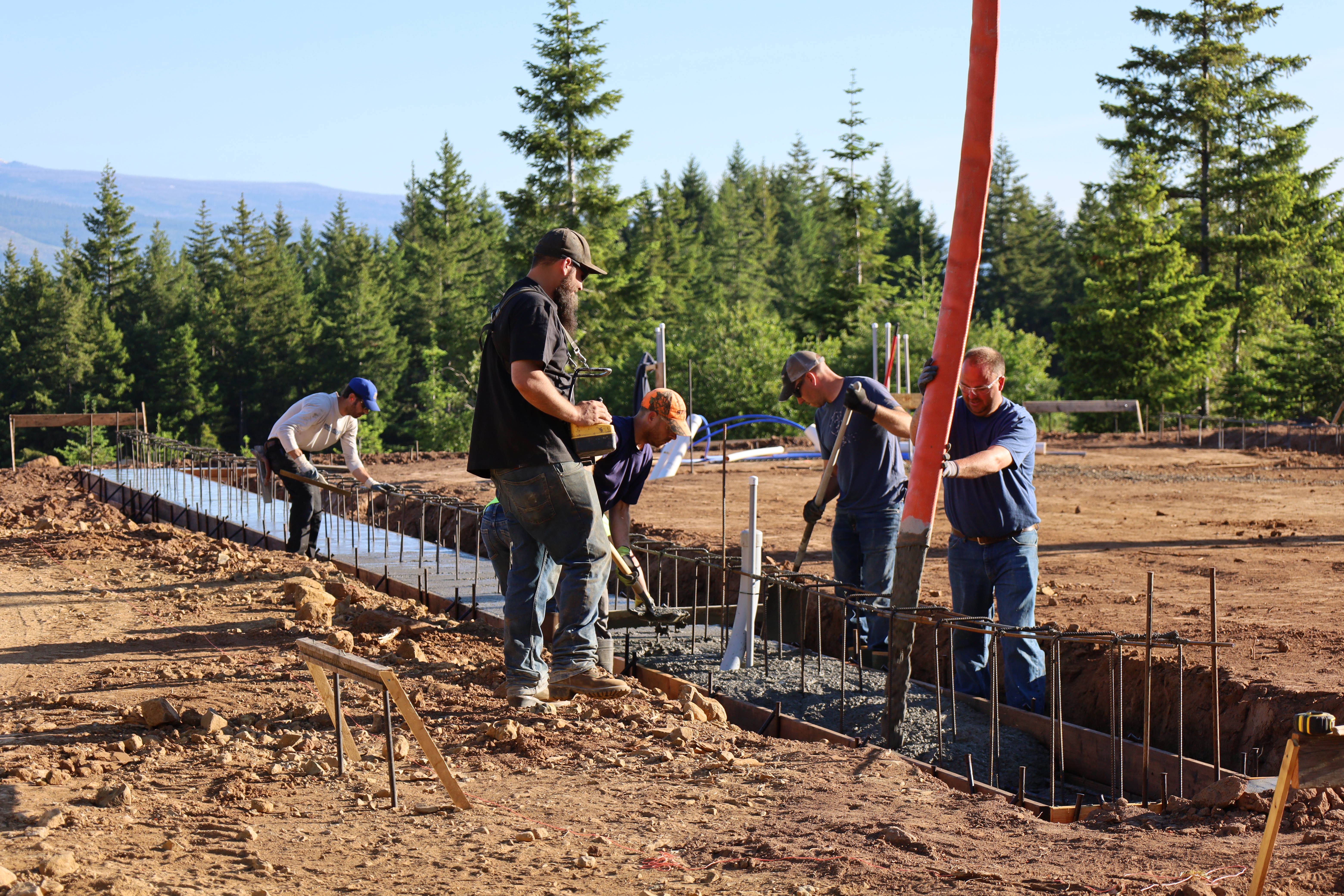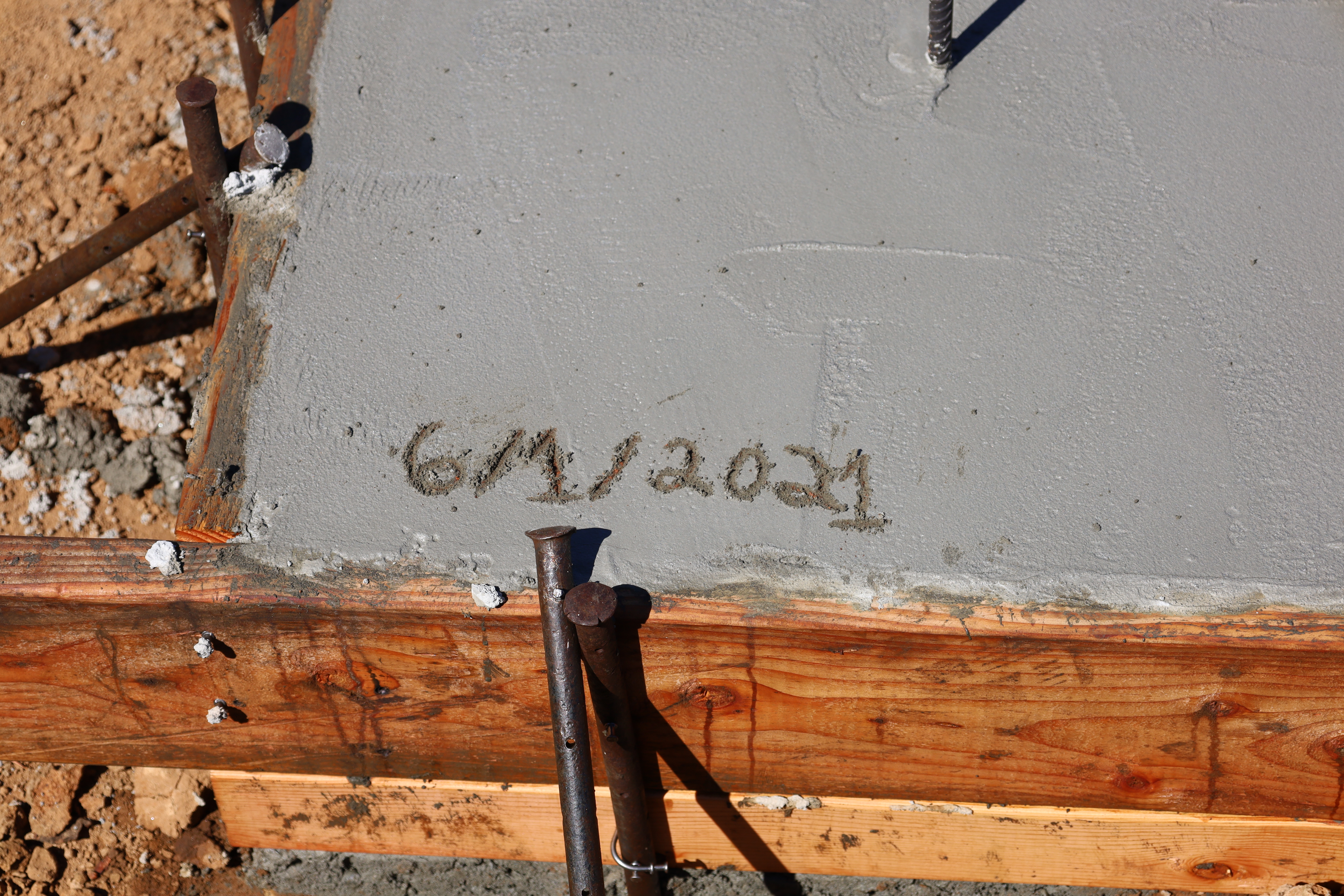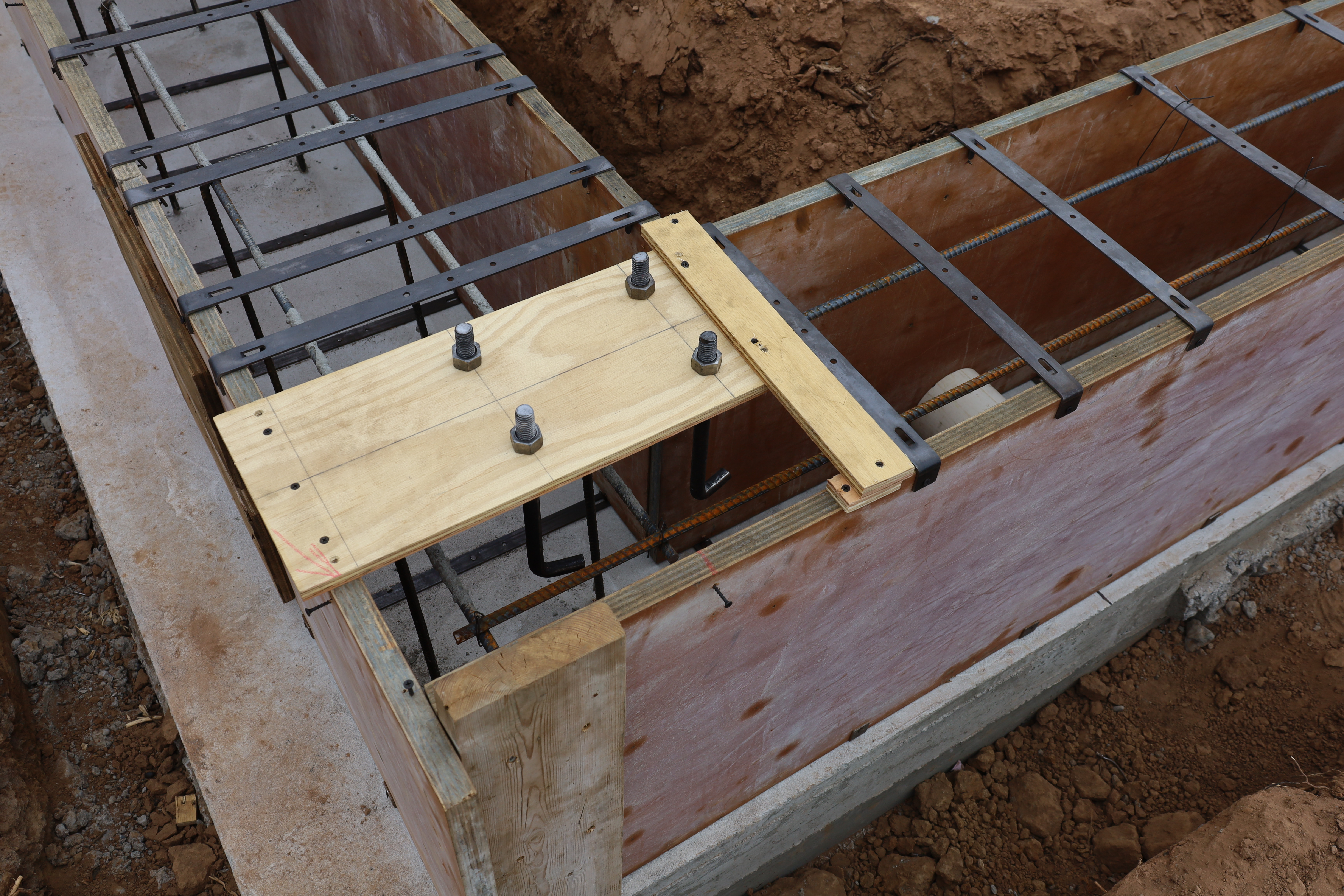 The crew pushed the concrete down with broom handles as they poured it, making sure not to leave any voids around the rebar and bolts. There were a lot of things they had to work around.