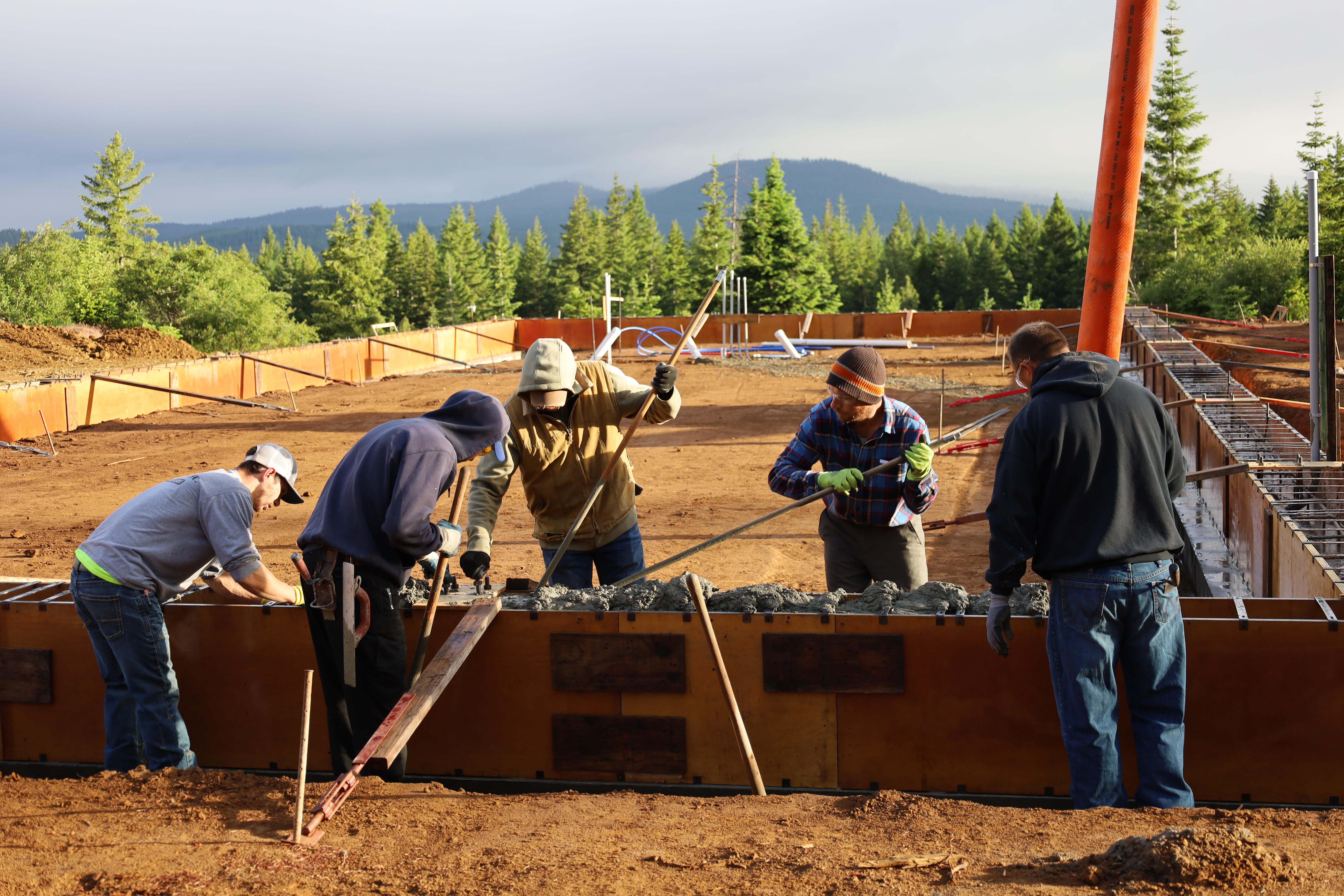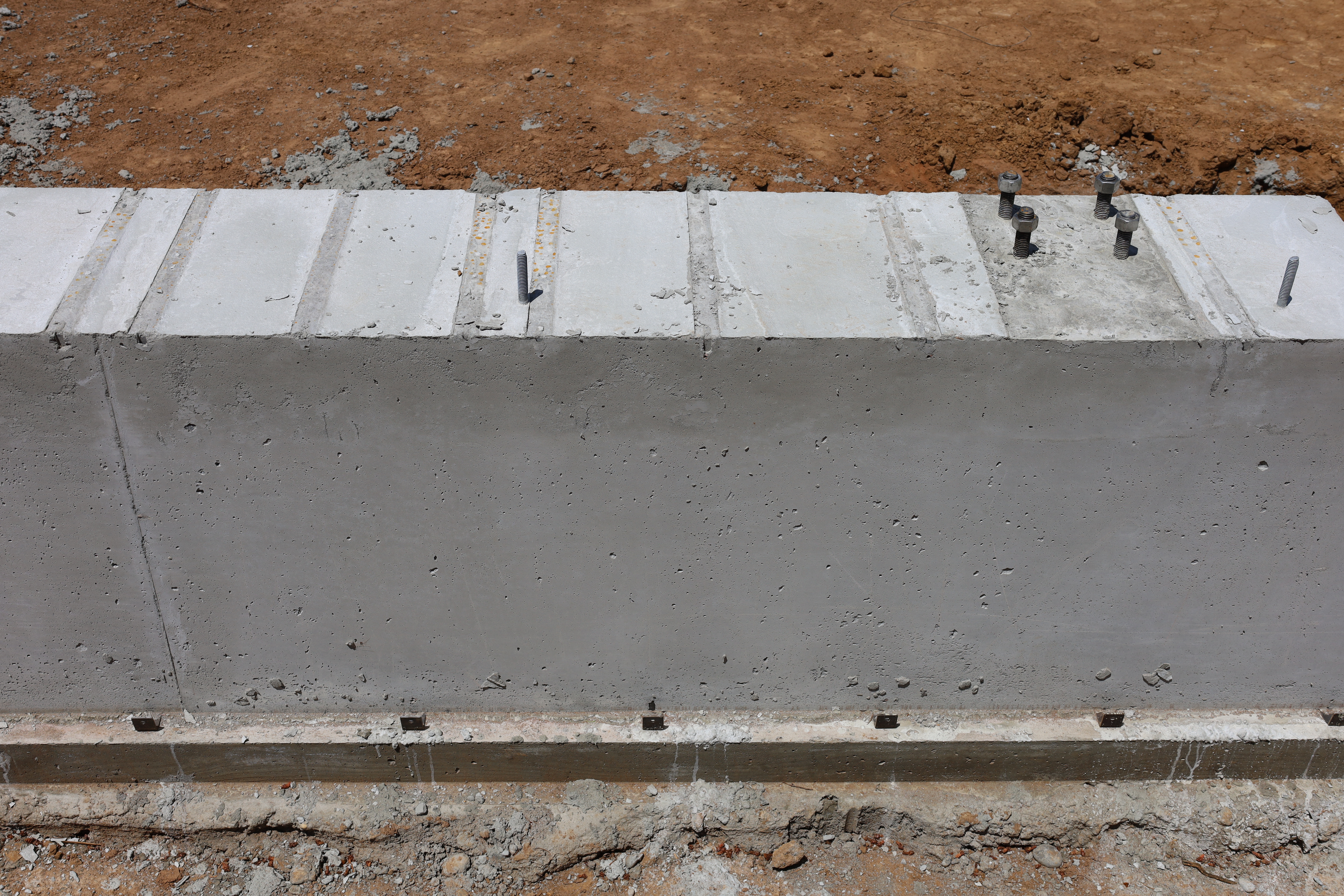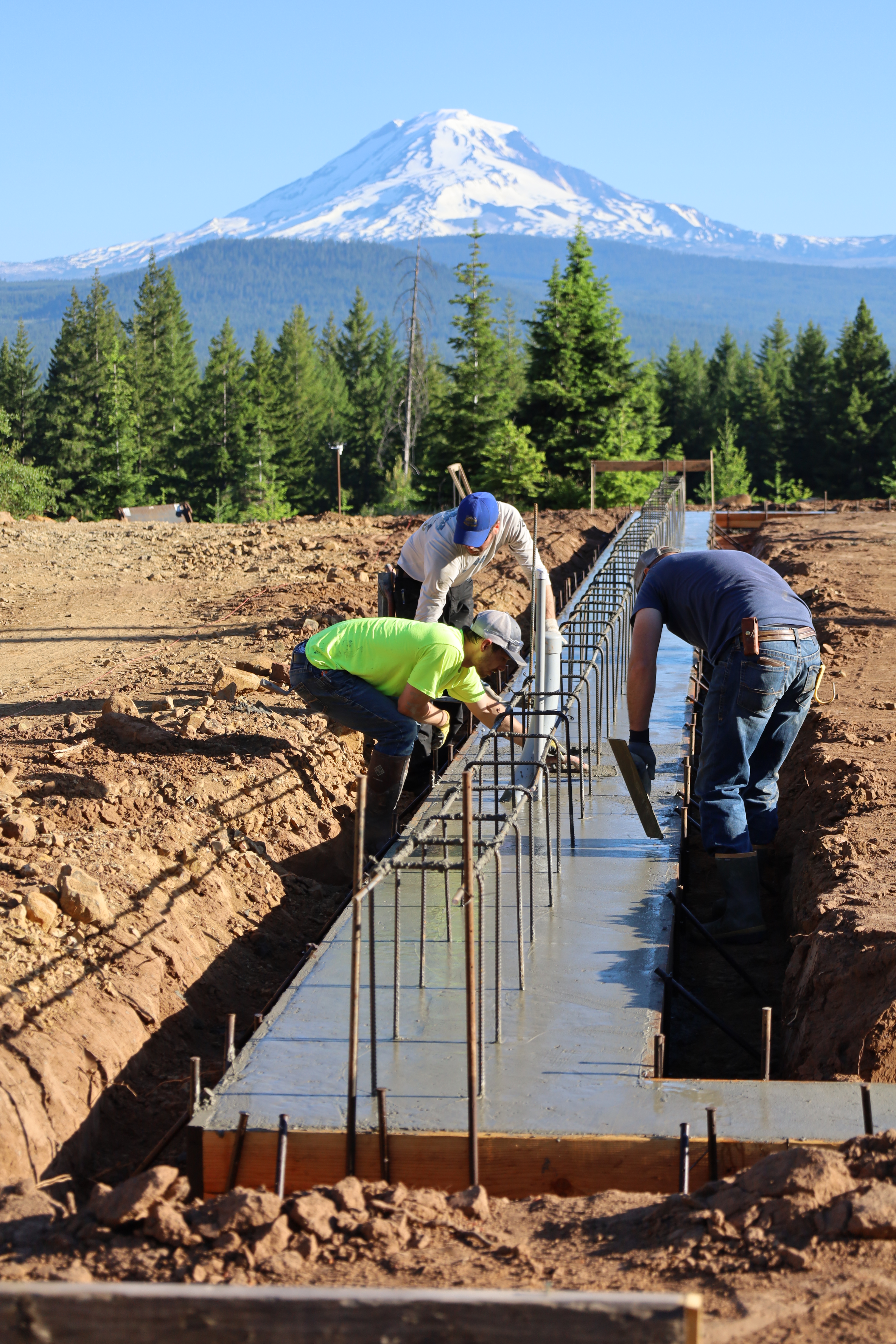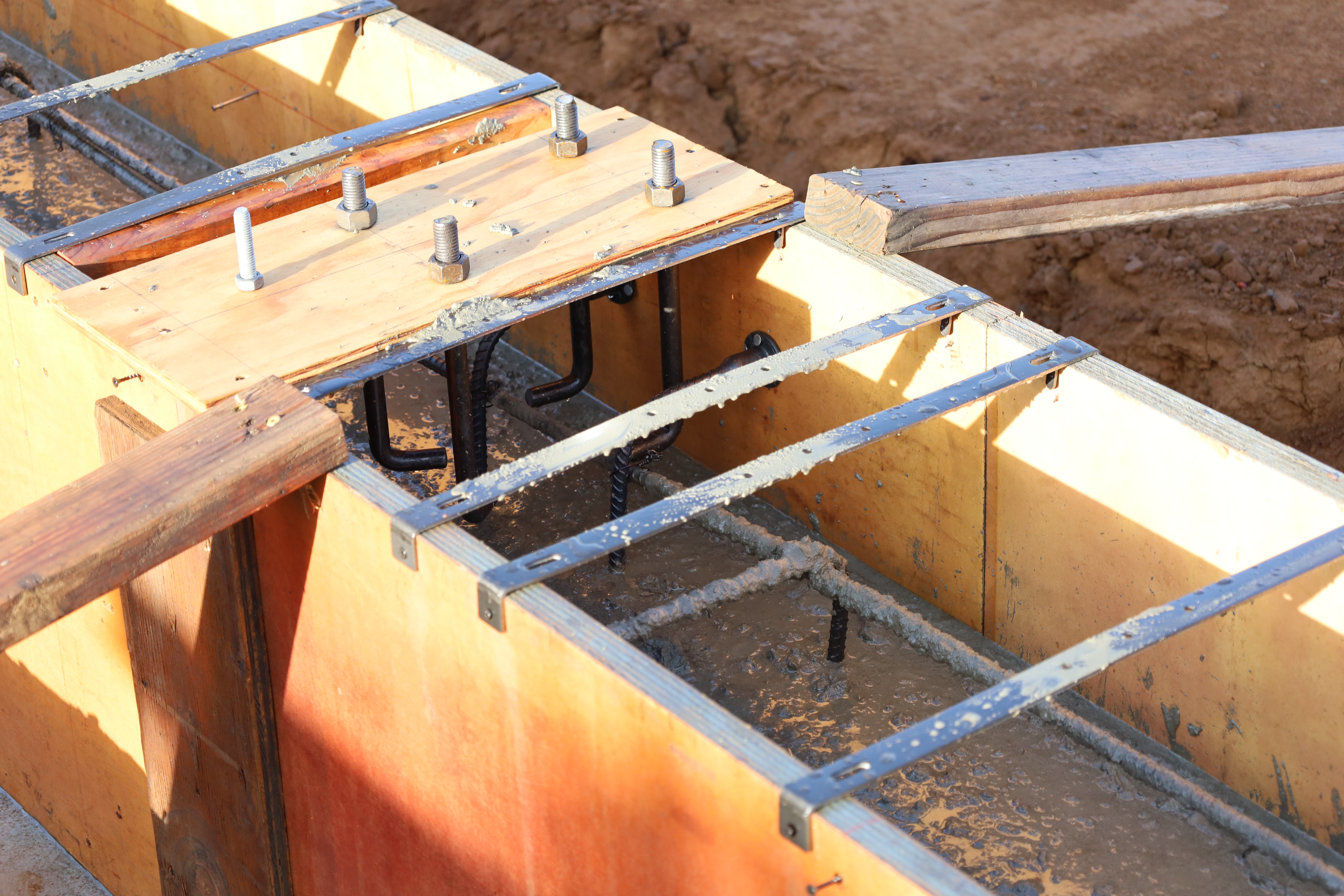 The crew pushed the concrete down with broom handles as they poured it, making sure not to leave any voids around the rebar and bolts. There were a lot of things they had to work around.
