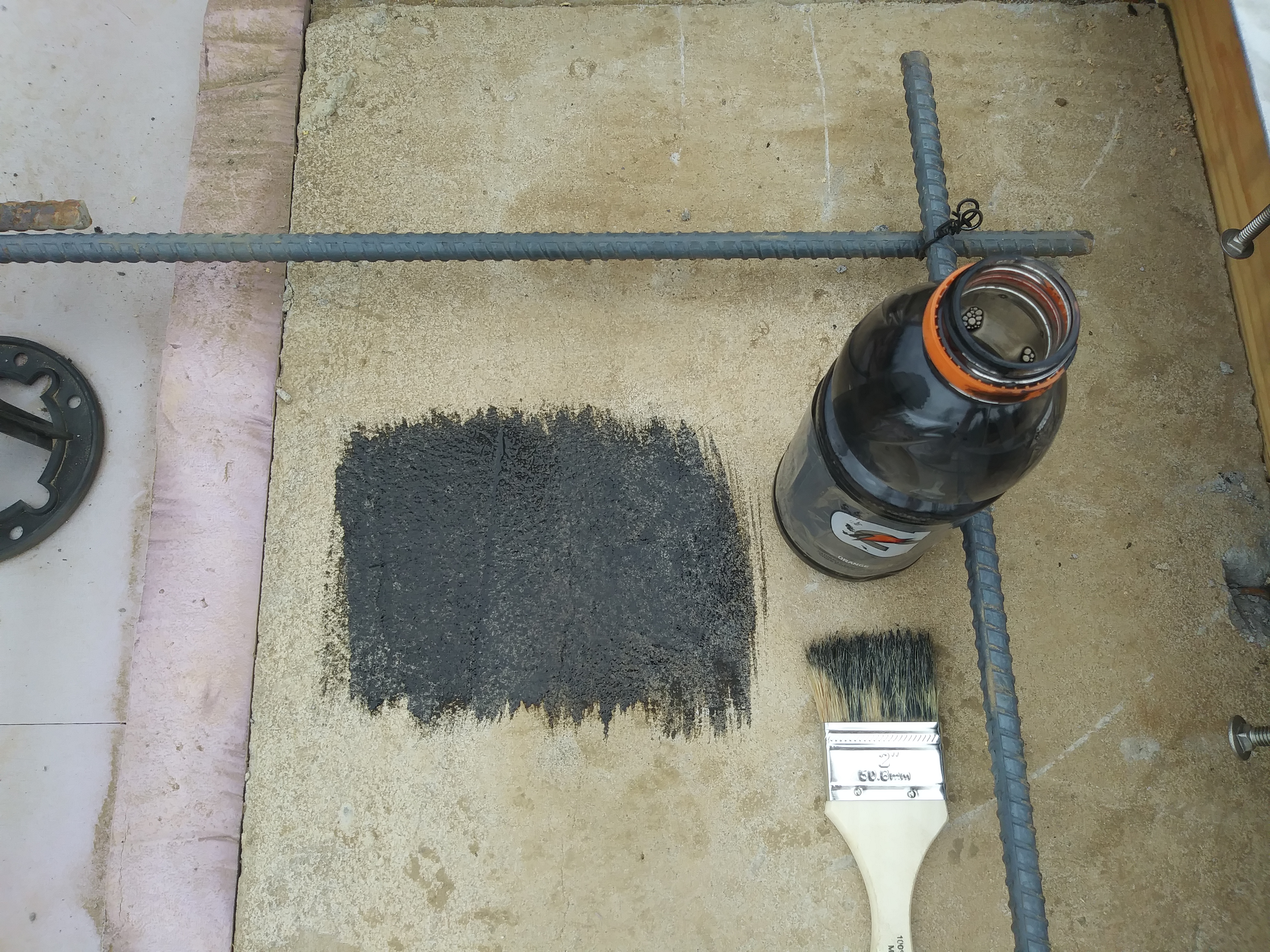 Once the slab was clean, we mixed up the sealant. Sam and I bought a black tint to mix in with the clear sealant. No one in the crew had used that particular tint before or had any idea how much to use. I tried to test it earlier, but I couldn’t dilute it enough, and it came out opaque (we were going for med-dark grey.) We decided to start with a very small amount of color. Matt tested it until we were all pleased with the results. (Don’t look under our future bed.)