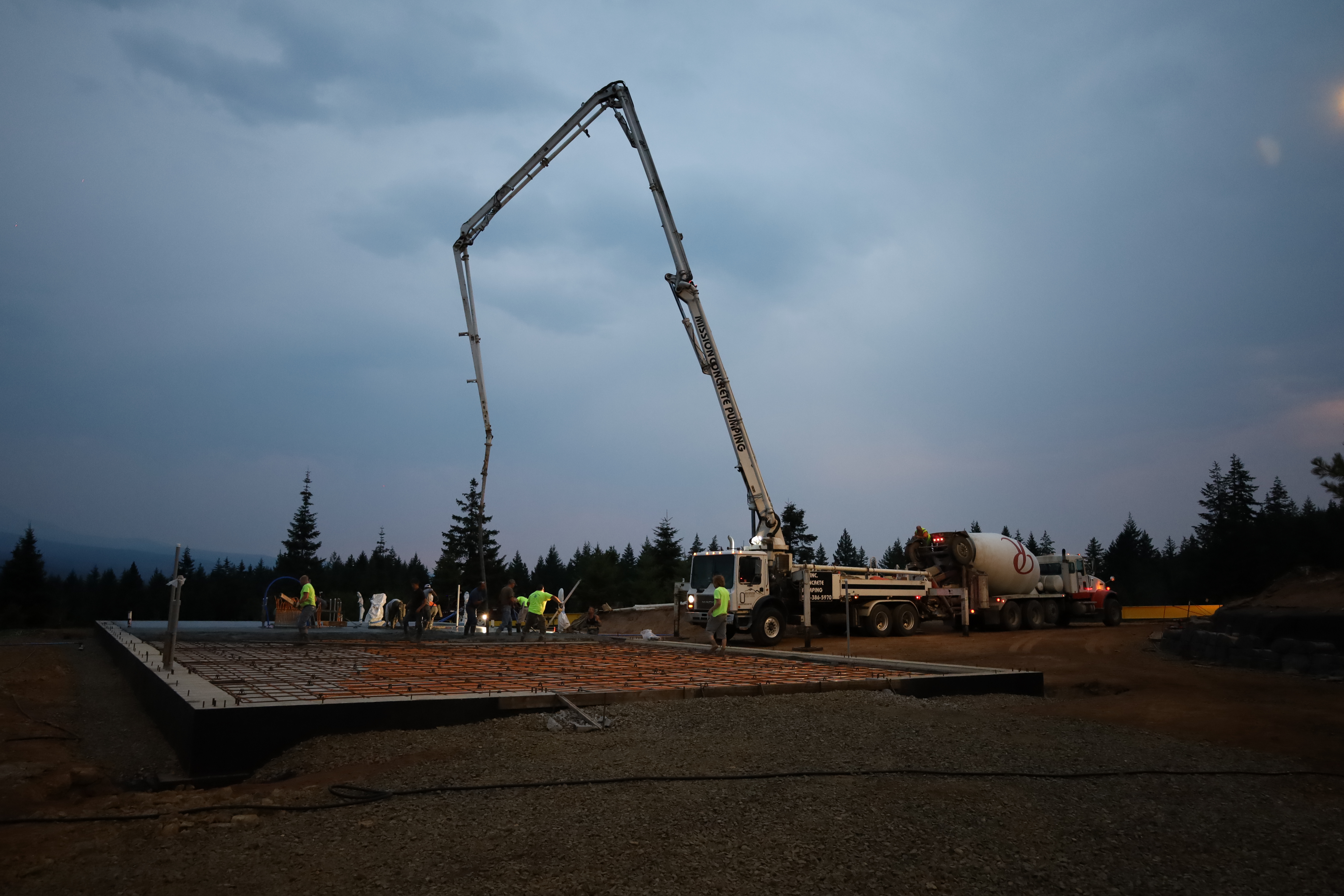 The big pour was scheduled for 3:00am. In preparation, the pump truck was dropped off the day before. Sam and I camped out for the early start as well. As we were grilling our dinner, some clouds rolled in, creating a lovely background for our photo shoot of the pump truck. We were awestruck as we hadn’t seen a single cloud in 45 days! We prayed the clouds would stay!