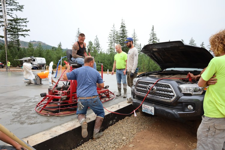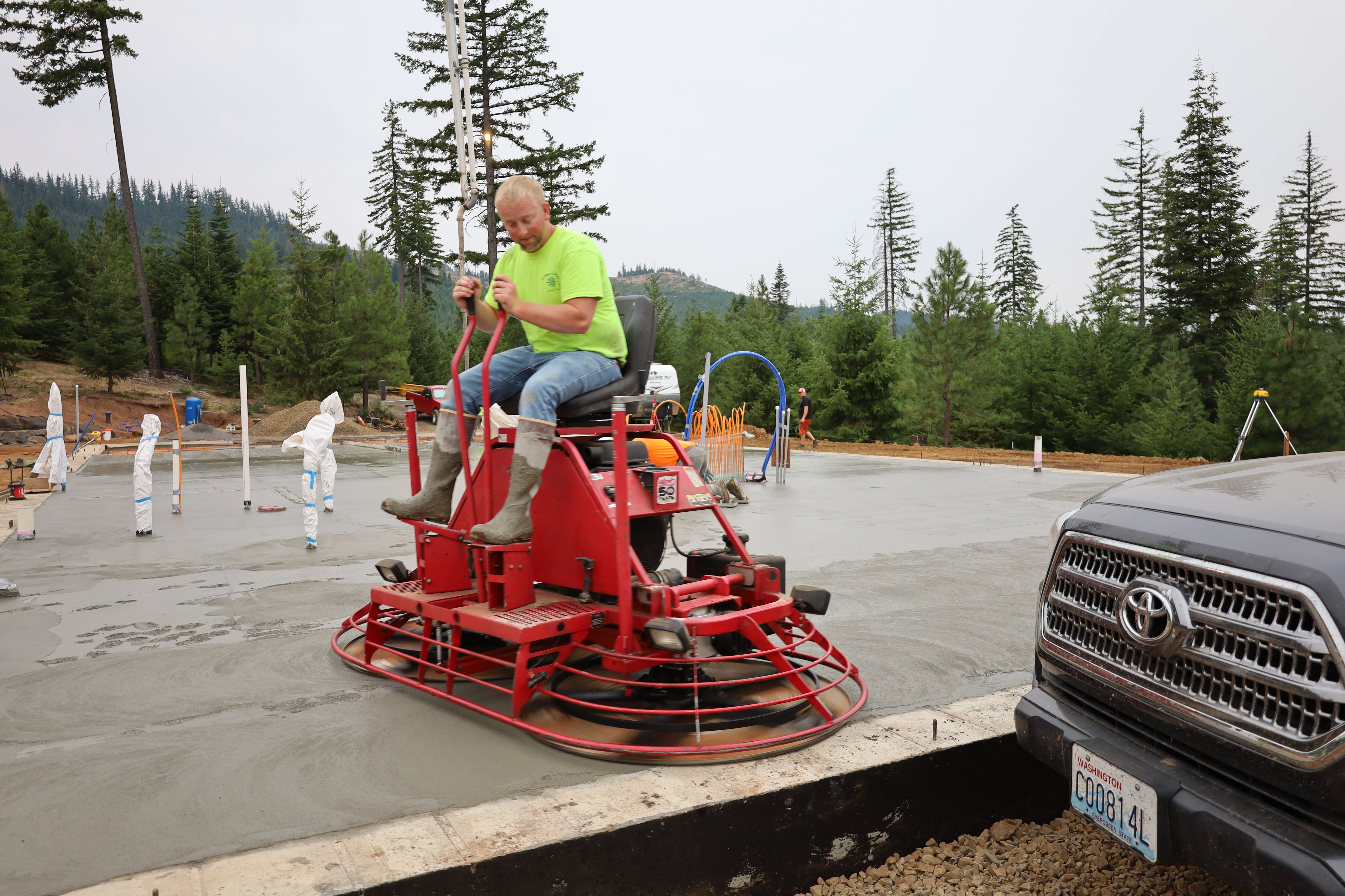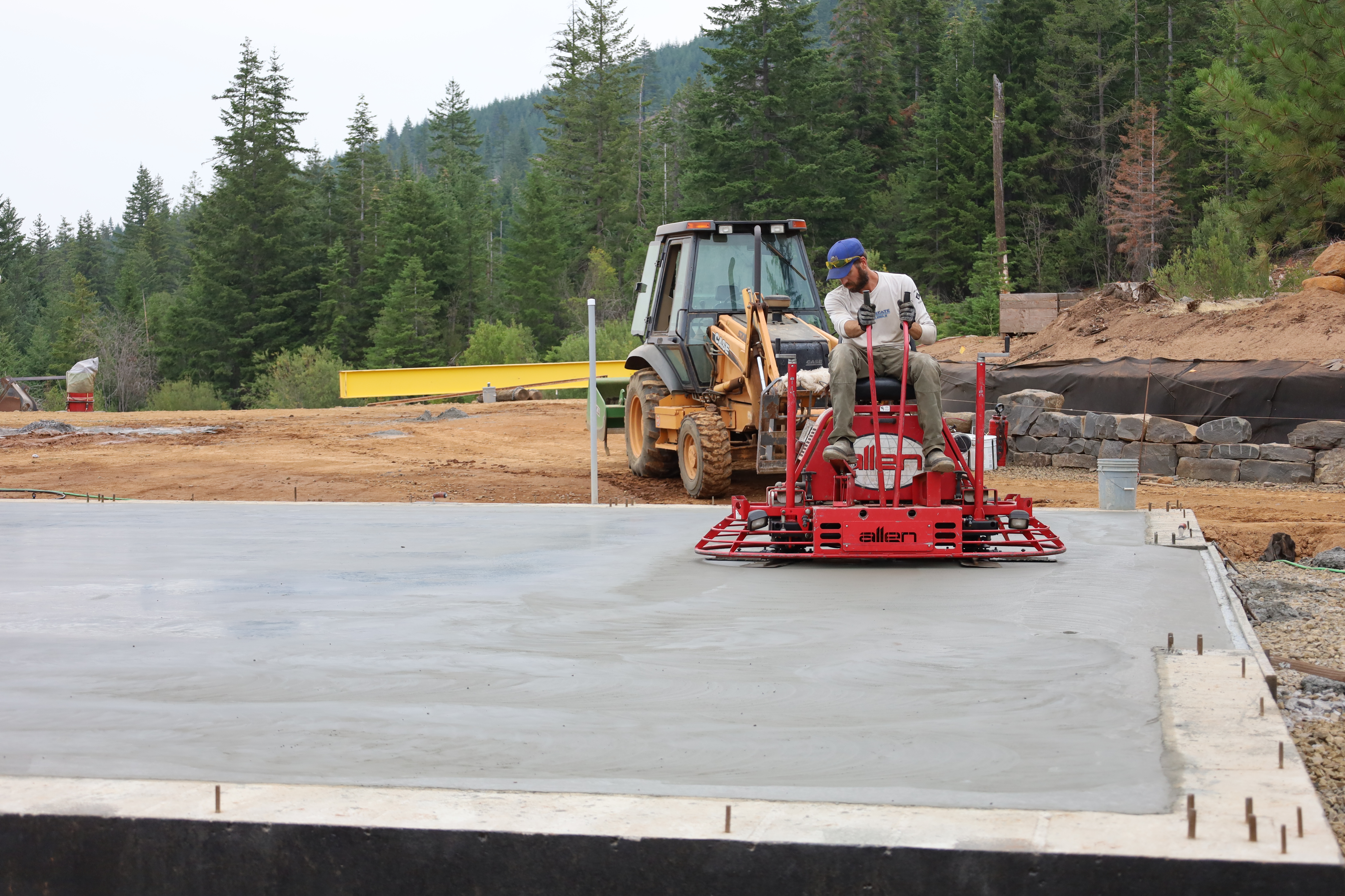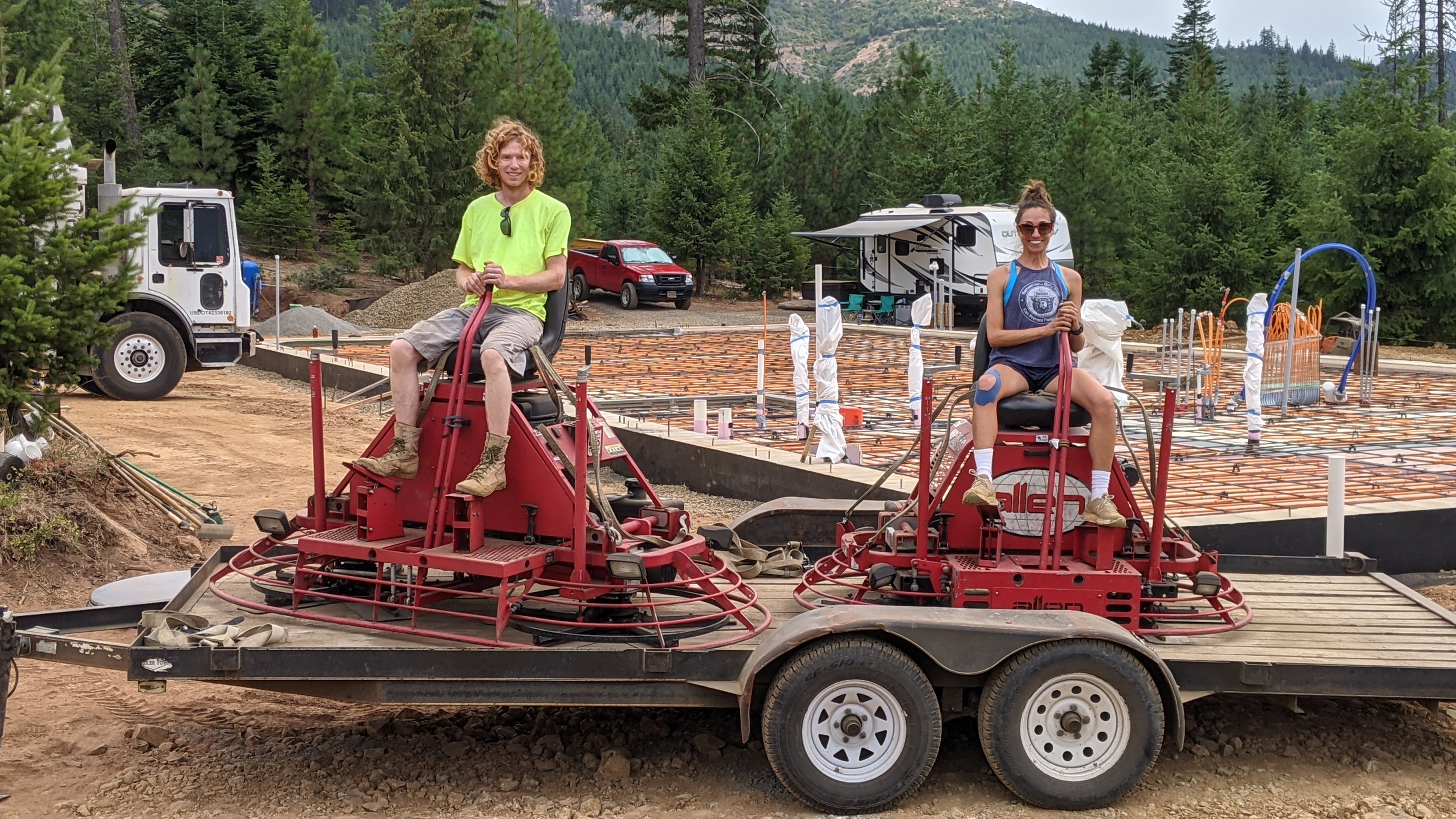 A few hours later, the concrete was hard enough for the power trowels. Check these “riders” out!