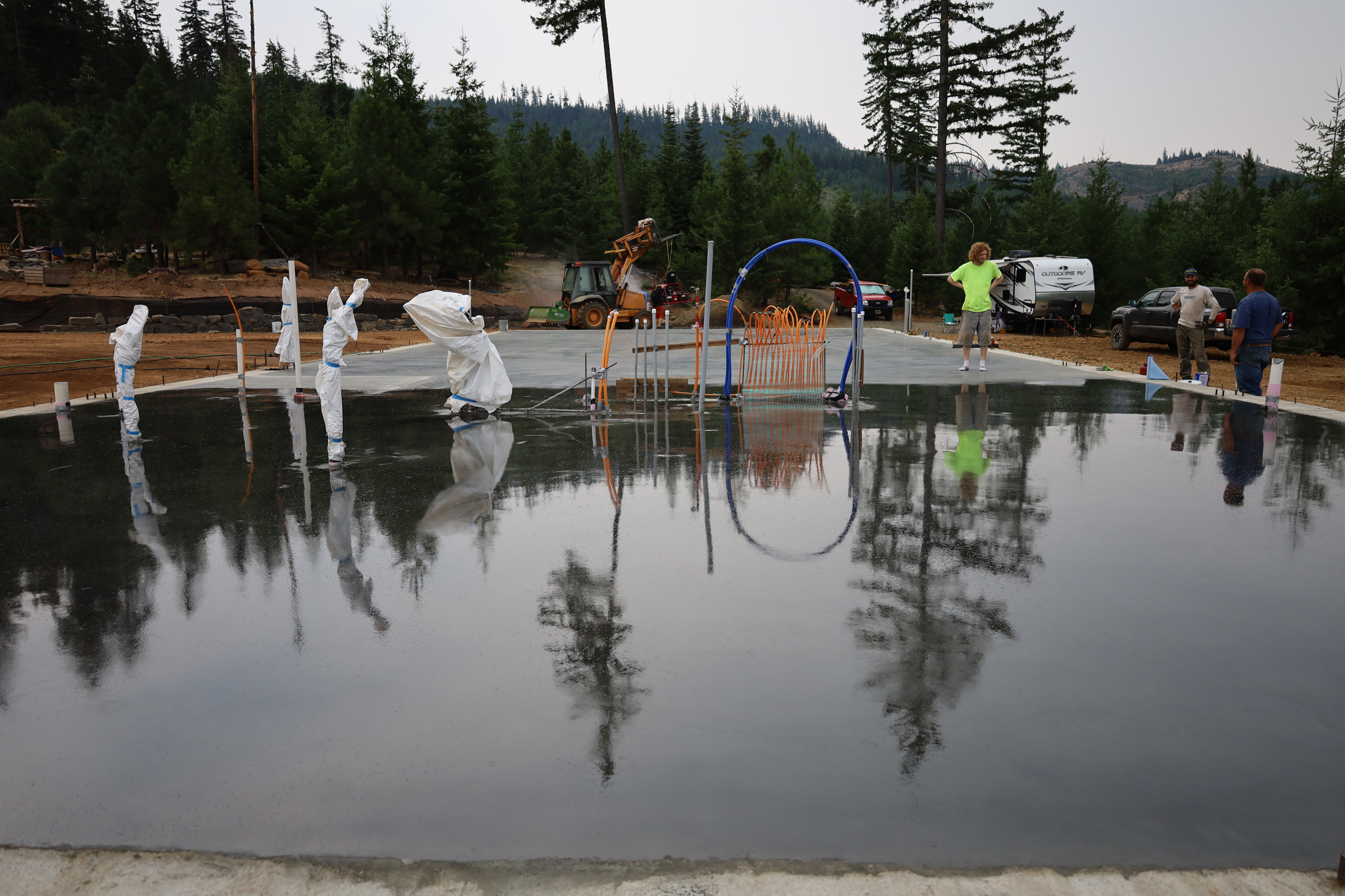 Why do we want clouds, and why are we starting the job at 3:00am? Concrete is a very sensitive material. The hotter and windier it is, the faster it cures, creating more cracks. In ideal conditions (not too hot, not too cold, not sunny, not windy) it cures slowly and evenly, drying with a flawless surface. You may have seen sprinklers on a freshly poured slab – the water keeps it cool to prevent cracks as it cures. However, you can’t water wet concrete and the first few hours are critical, so what can you do? Start at 3:00am, hoping to finish before the temperature reaches 100 degrees, and hope that it isn’t too windy. This is asking a lot where we live. It is sunny every day, and the temperature was in the triple digits every day that week. We were shocked to see clouds!