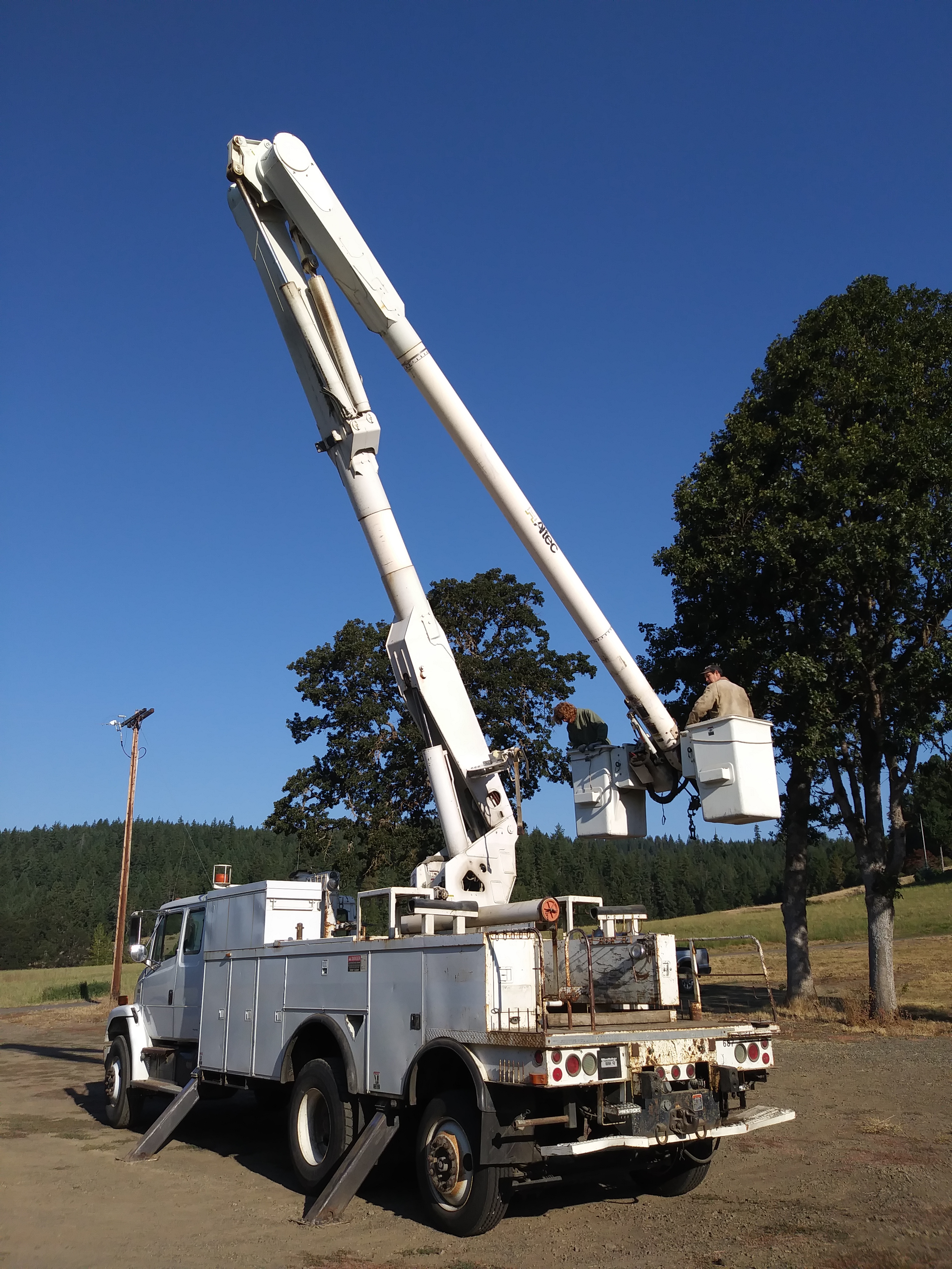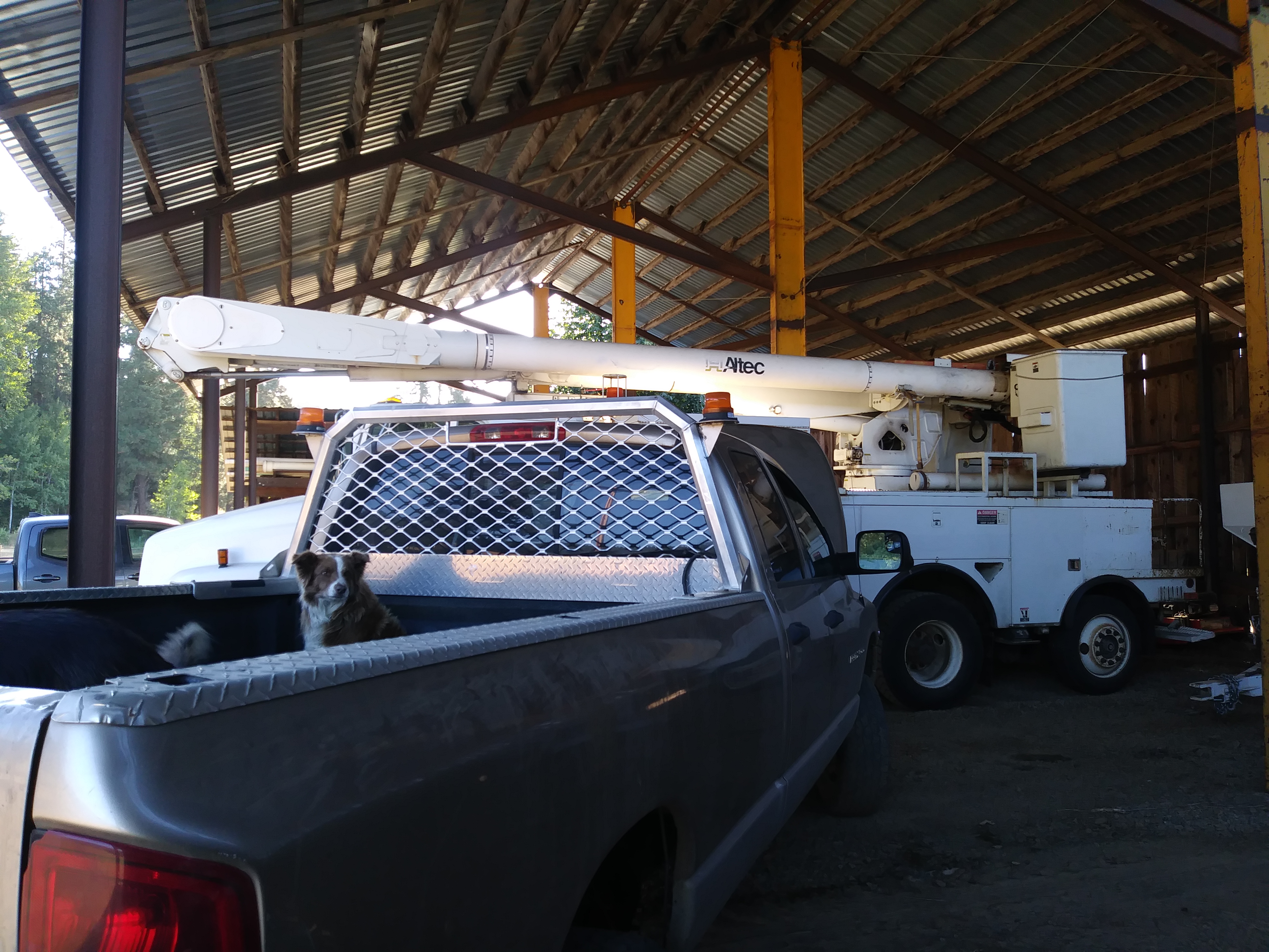 On Wednesday morning, we stopped by Kreps Ranch to borrow their bucket truck. It had some trouble starting up. The cattle dogs were not impressed as we waited for the battery to charge. The truck eventually fired up, and Sam got a brief lesson before driving it to our property.
