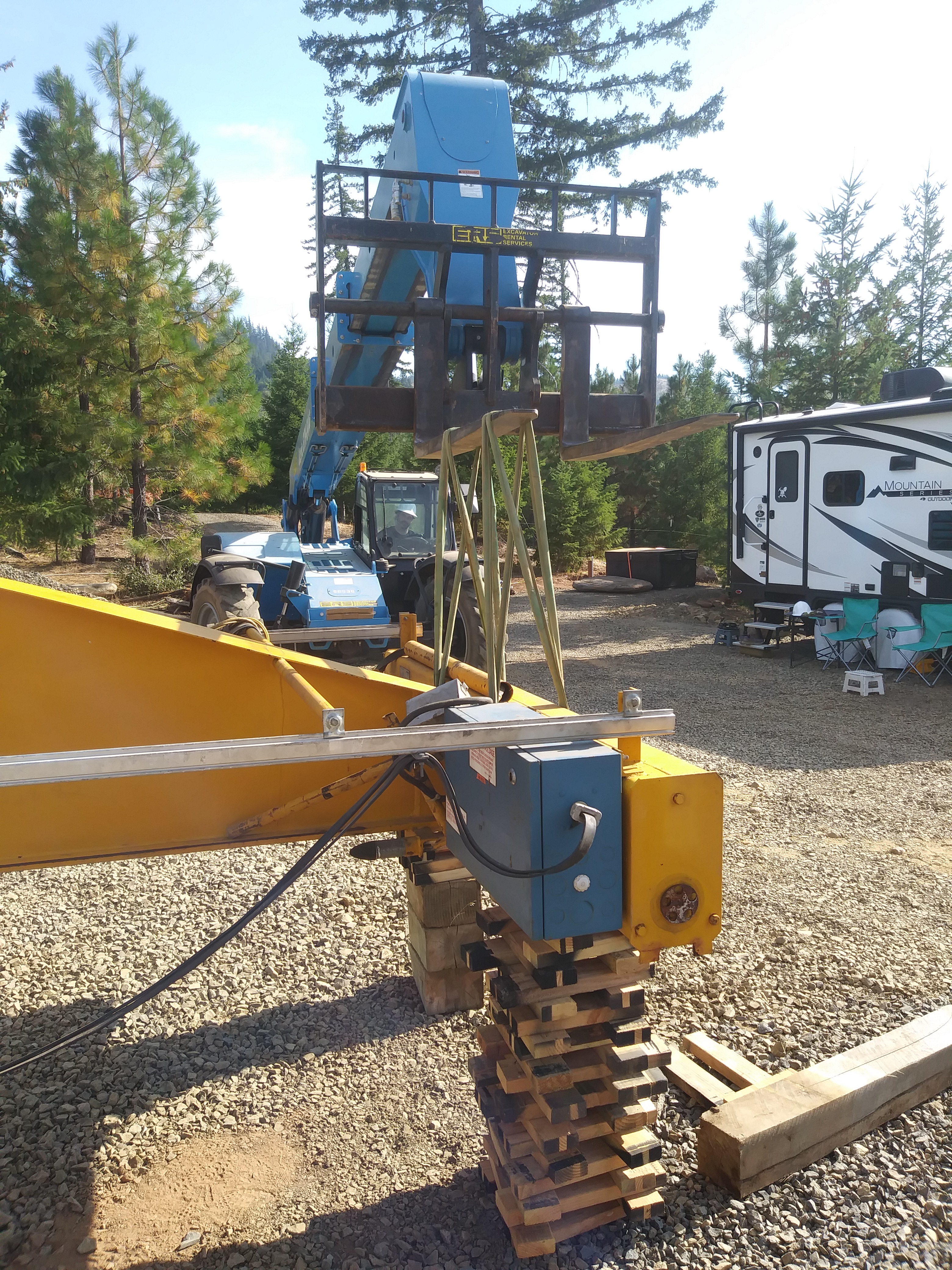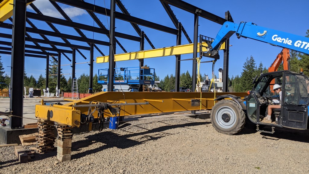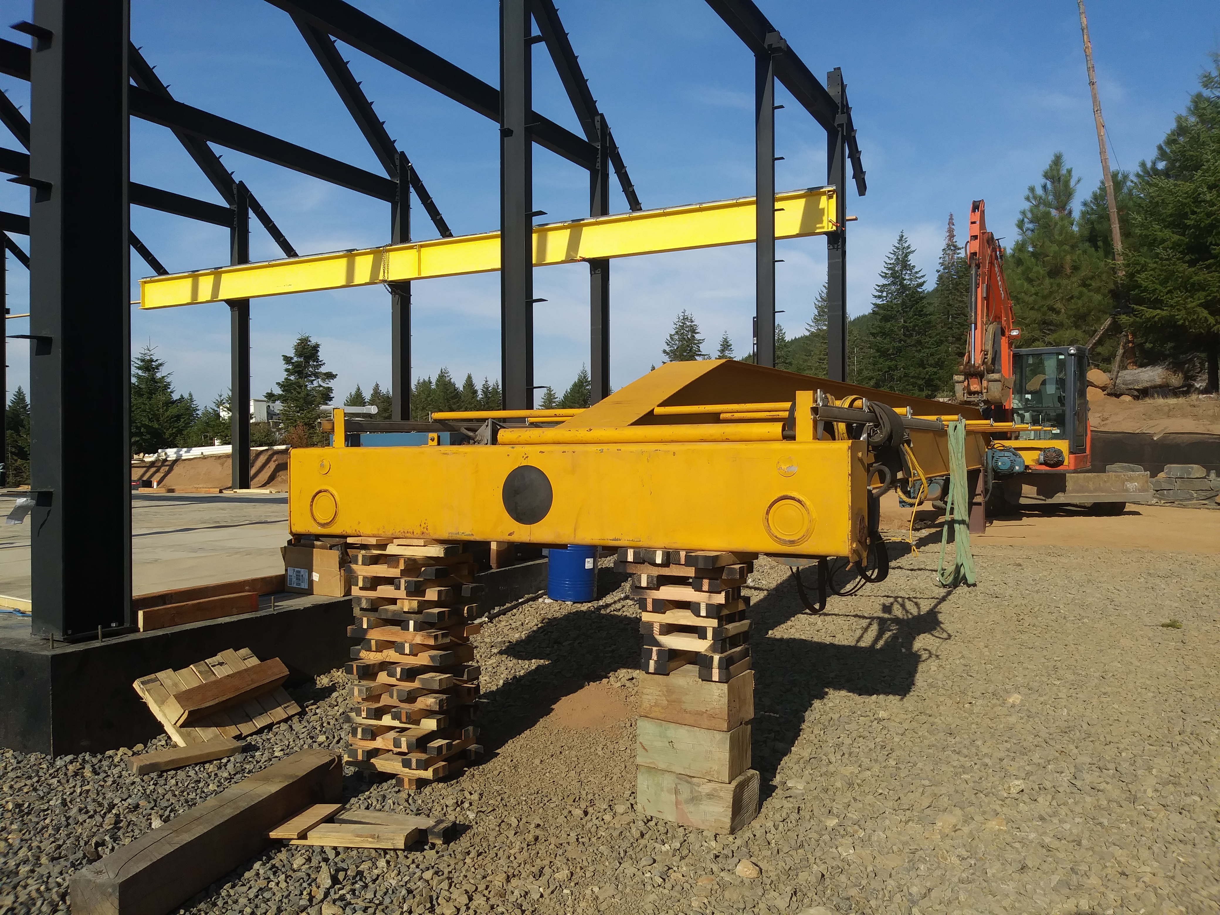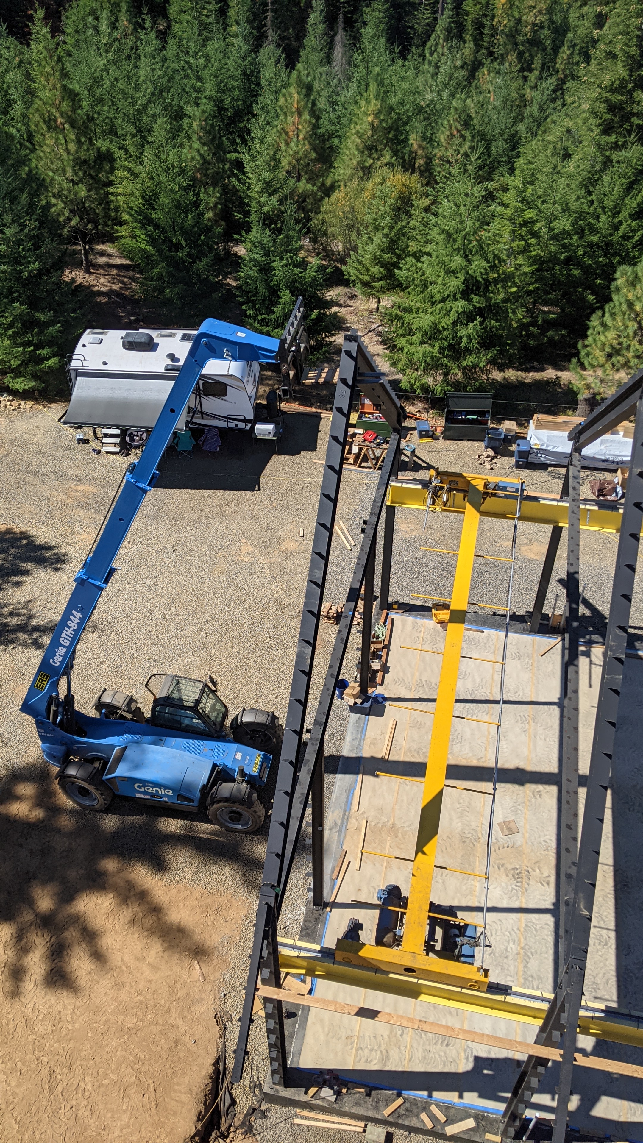 We couldn’t put the last peak on until we got our bridge crane inside. We drove the crane up to building to align it on the ground. We set it on some Jenga towers and called it a night.