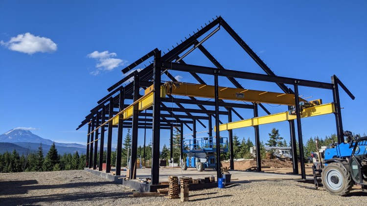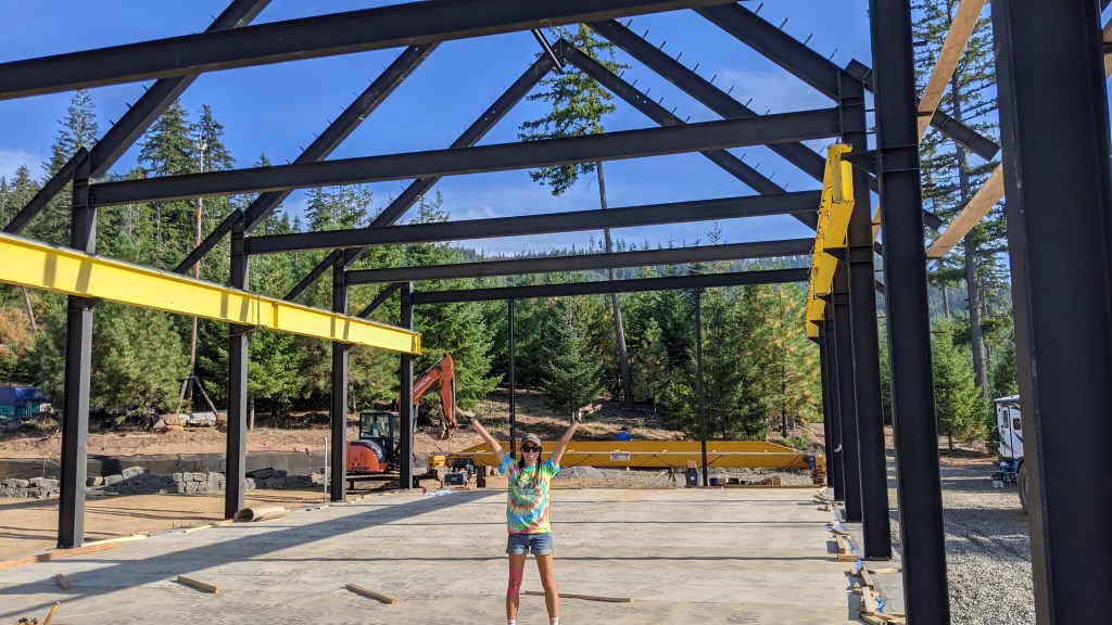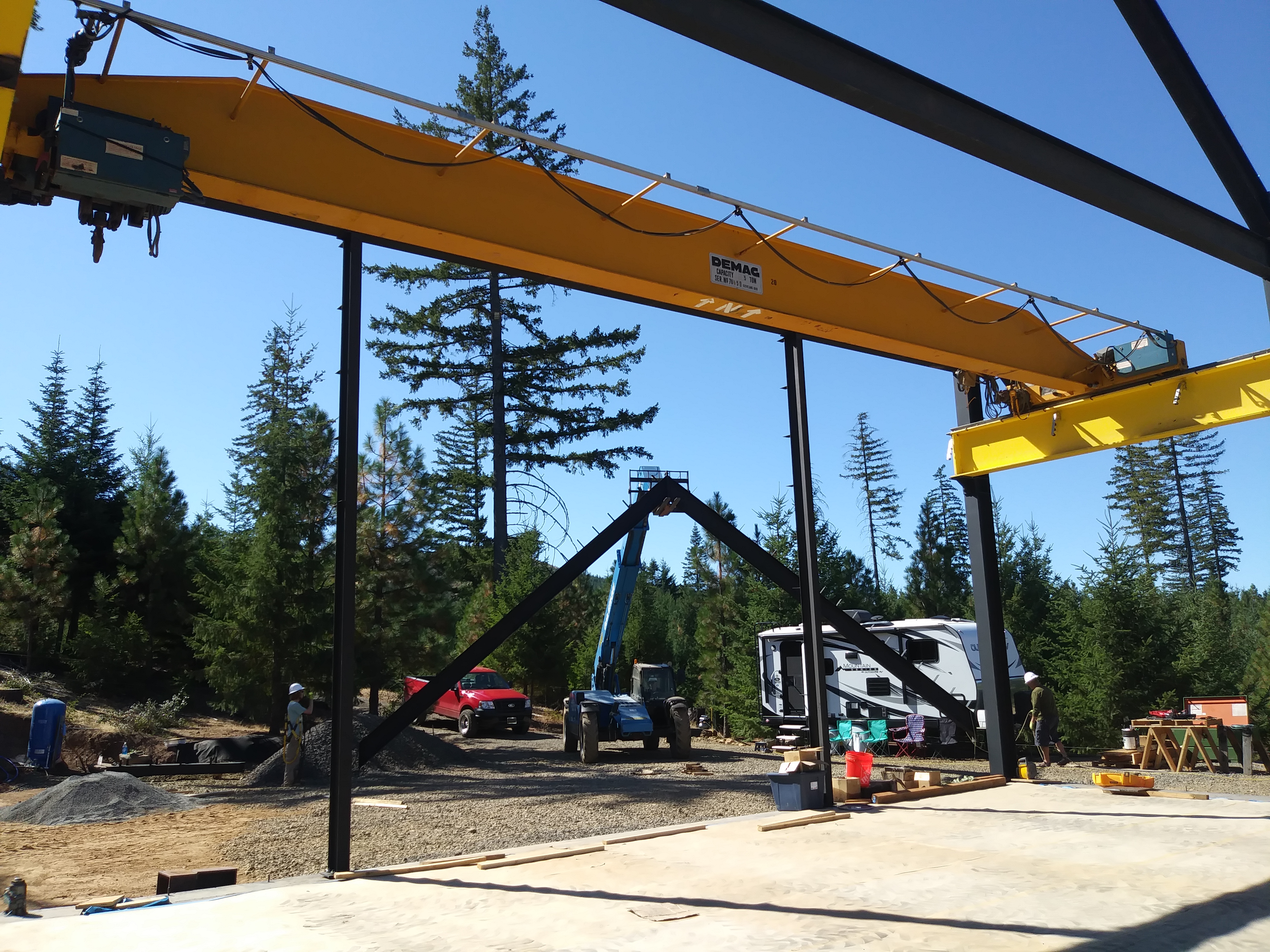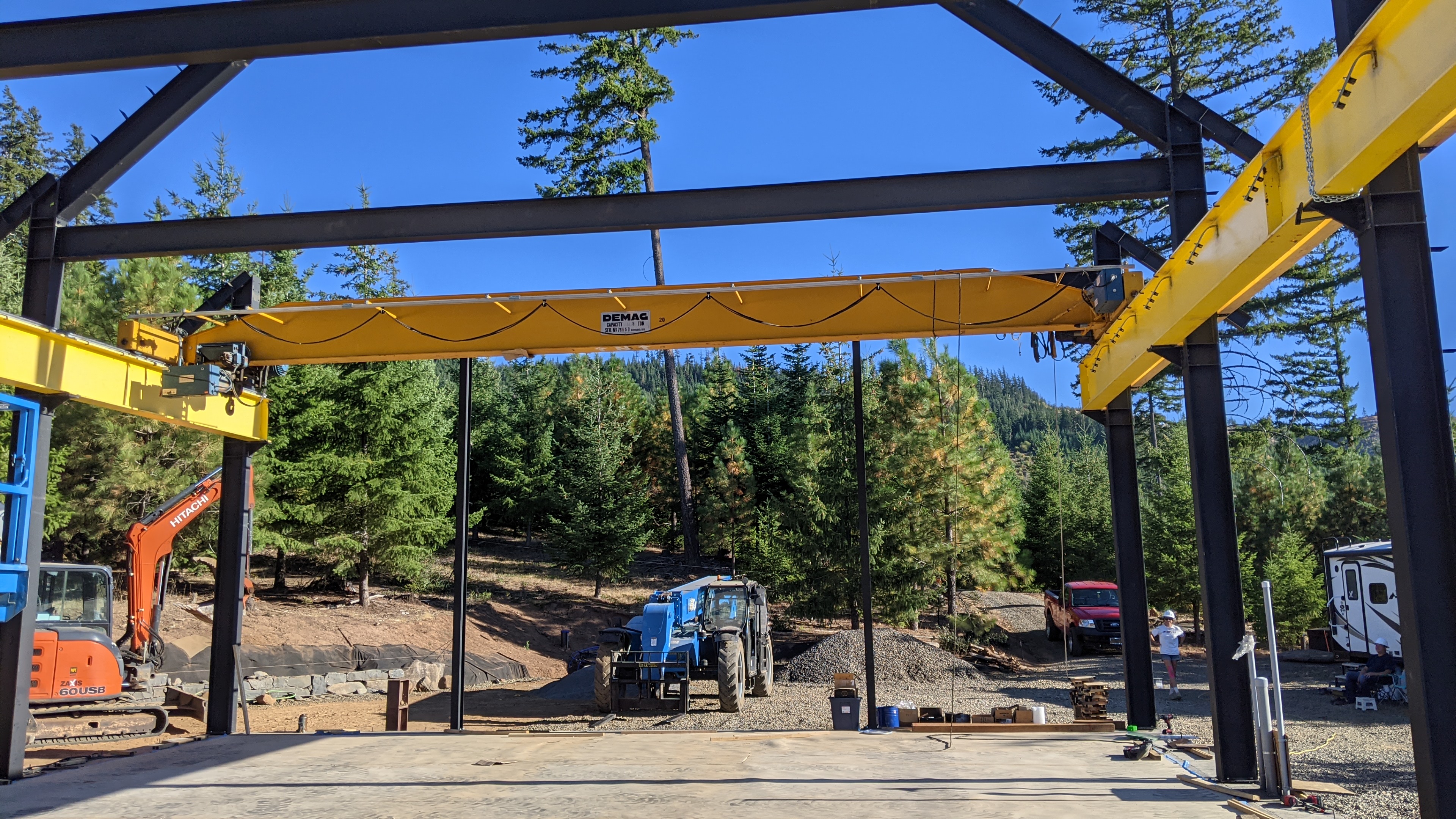 We couldn’t put the last peak on until we got our bridge crane inside. We drove the crane up to building to align it on the ground. We set it on some Jenga towers and called it a night.