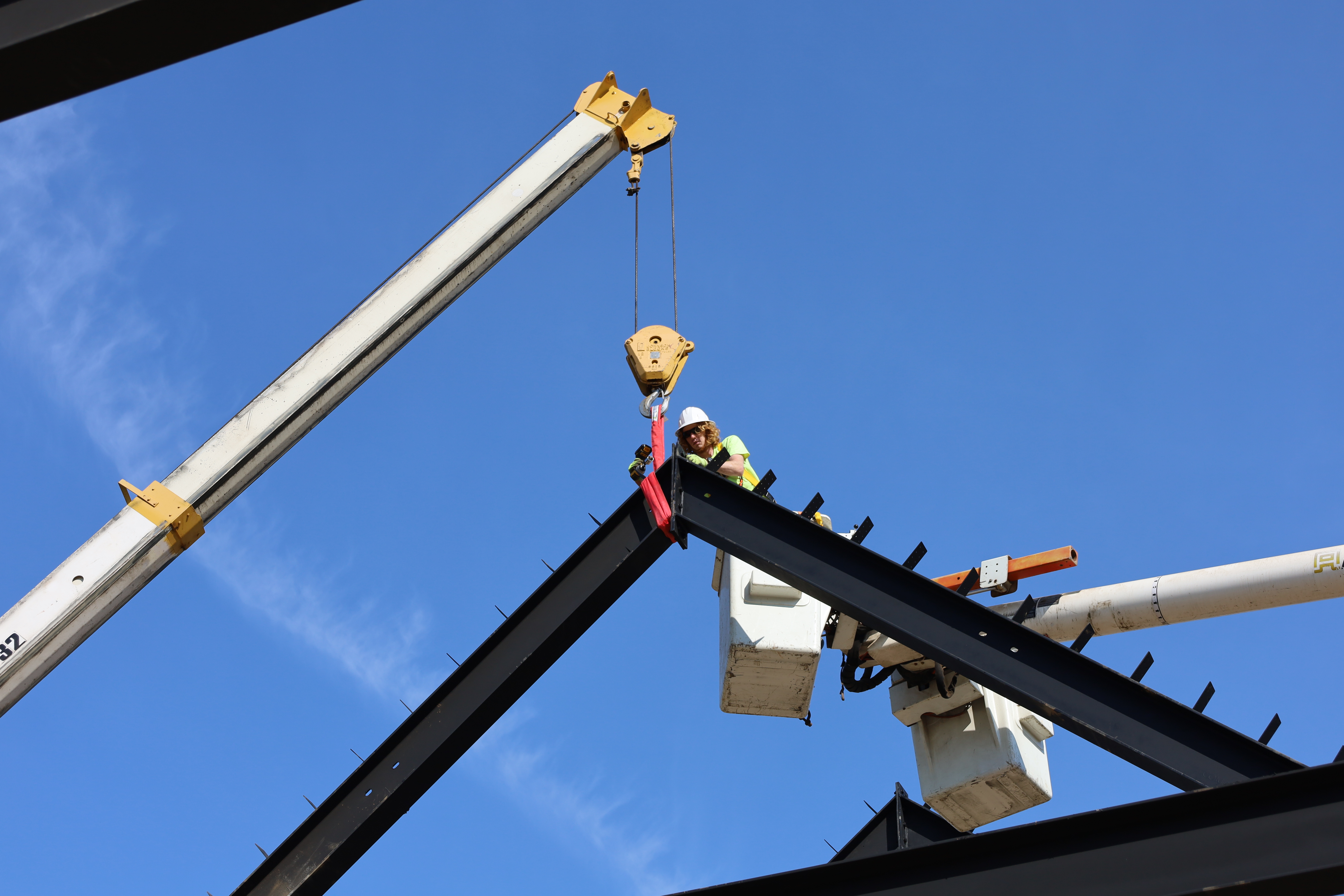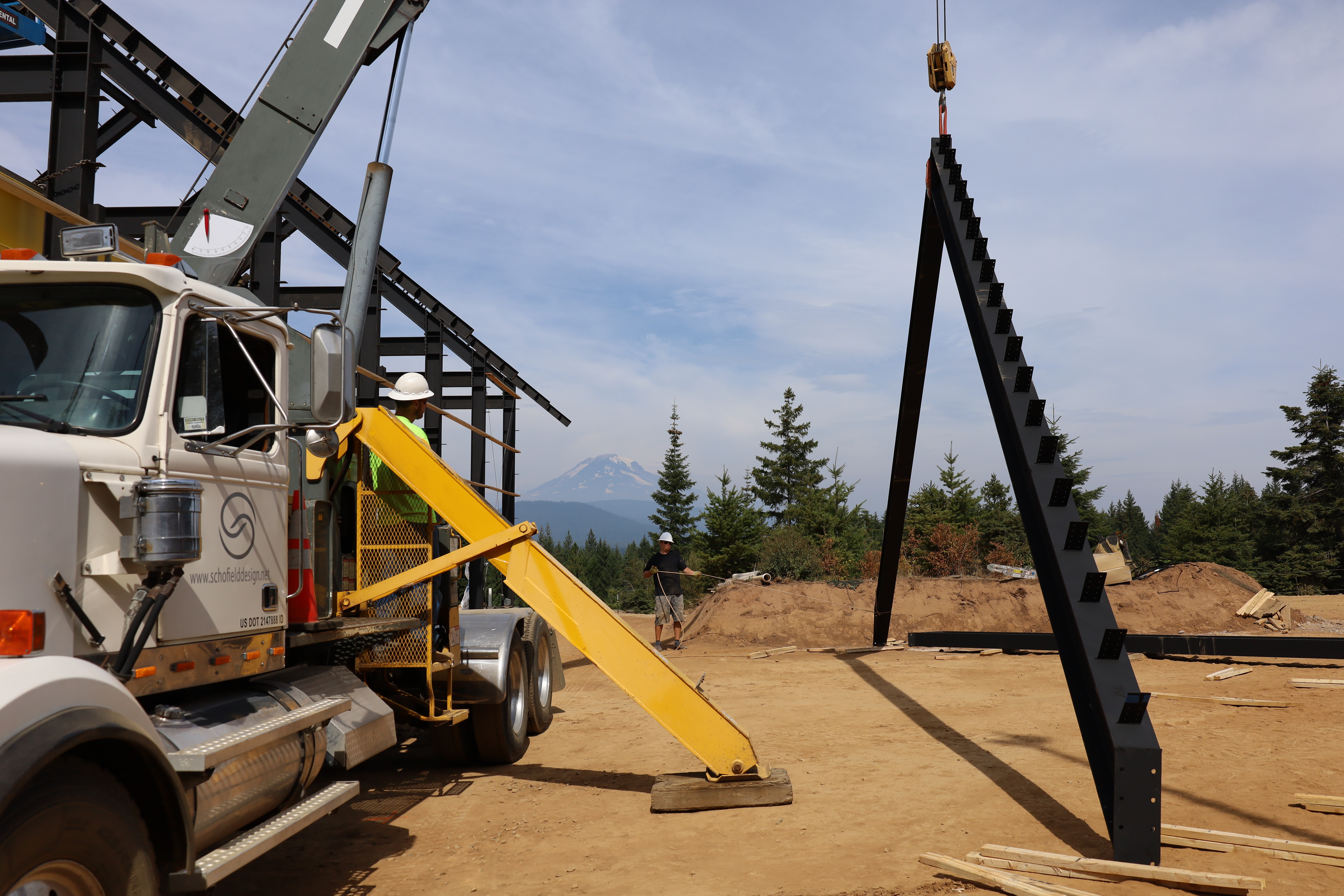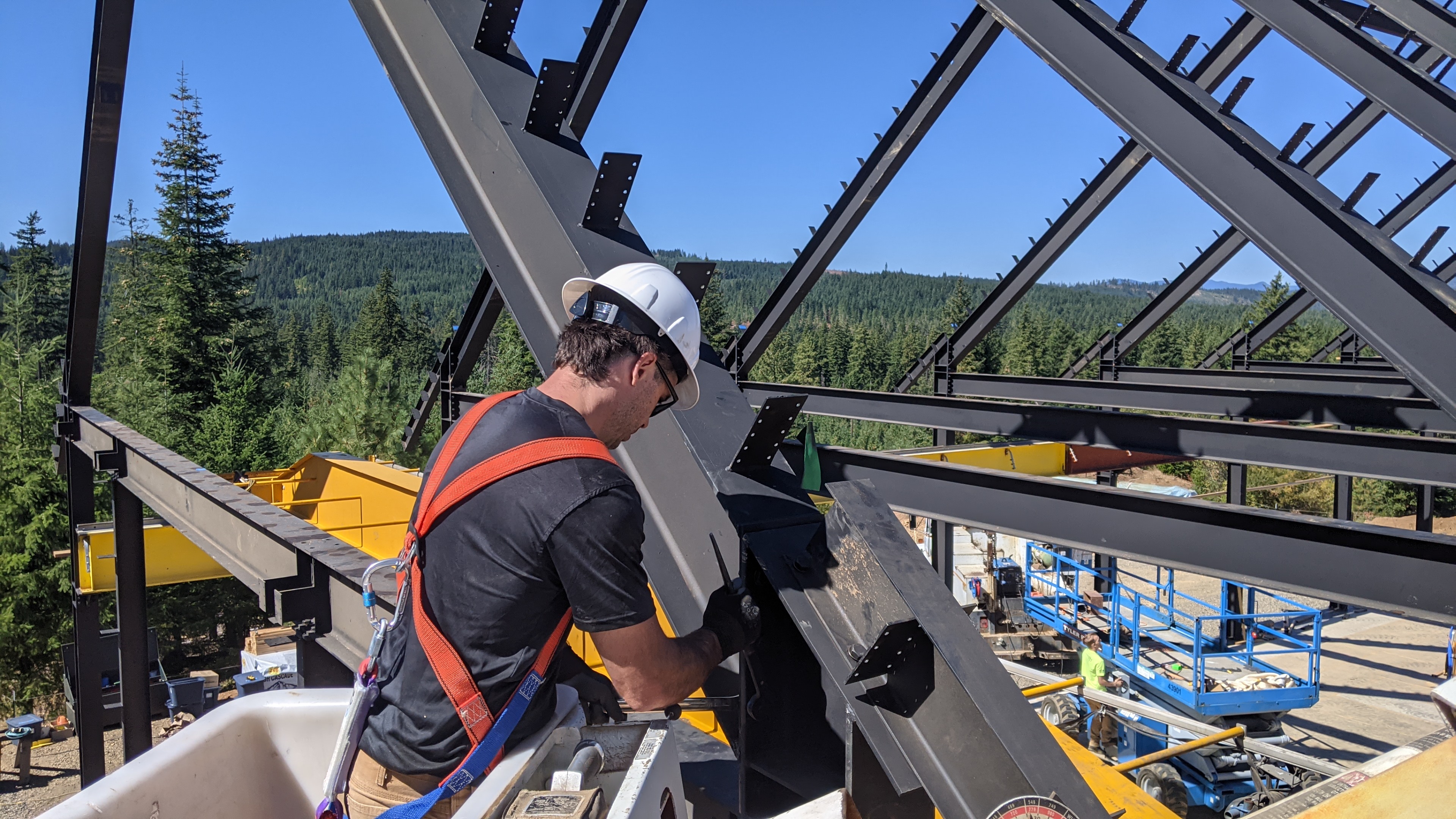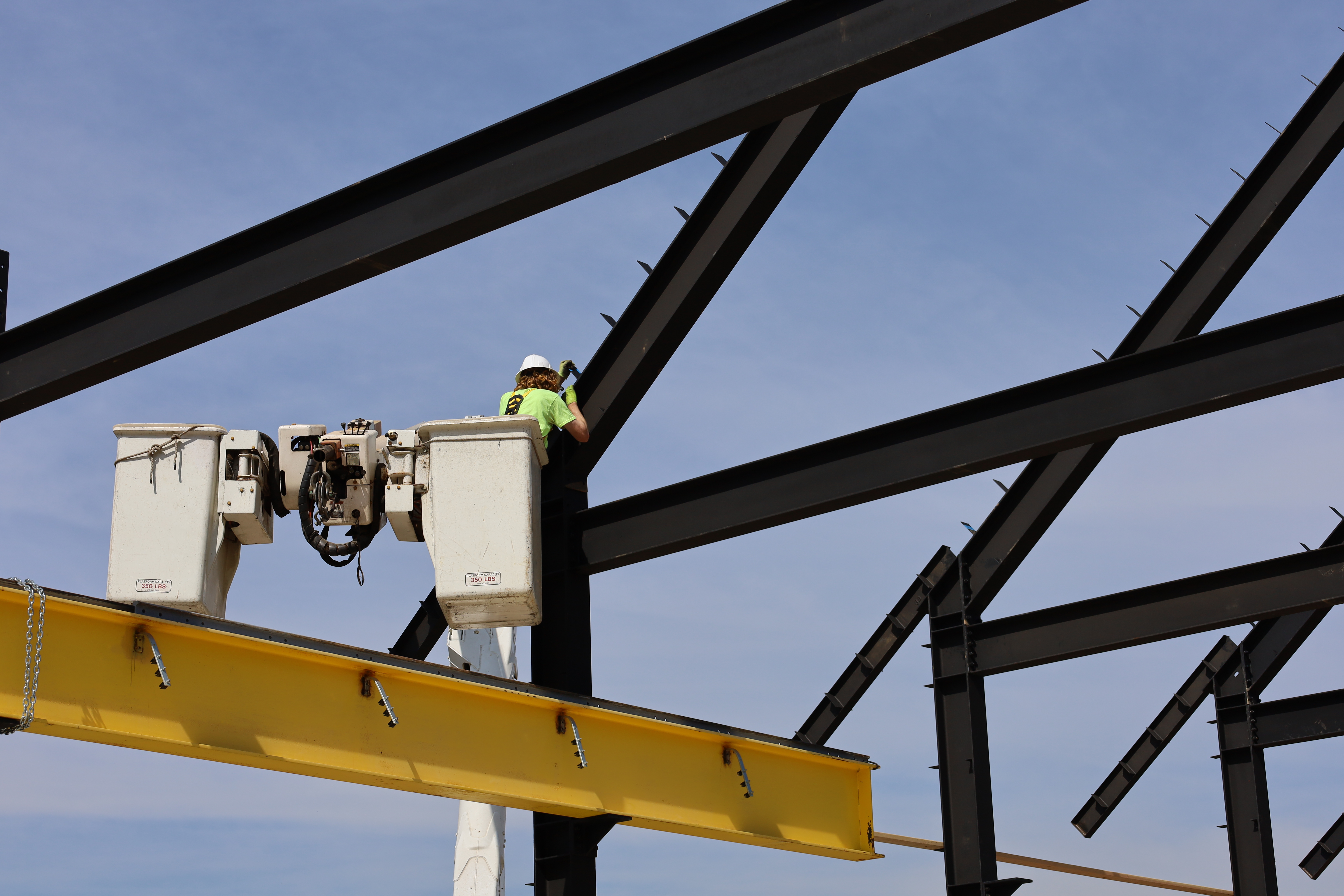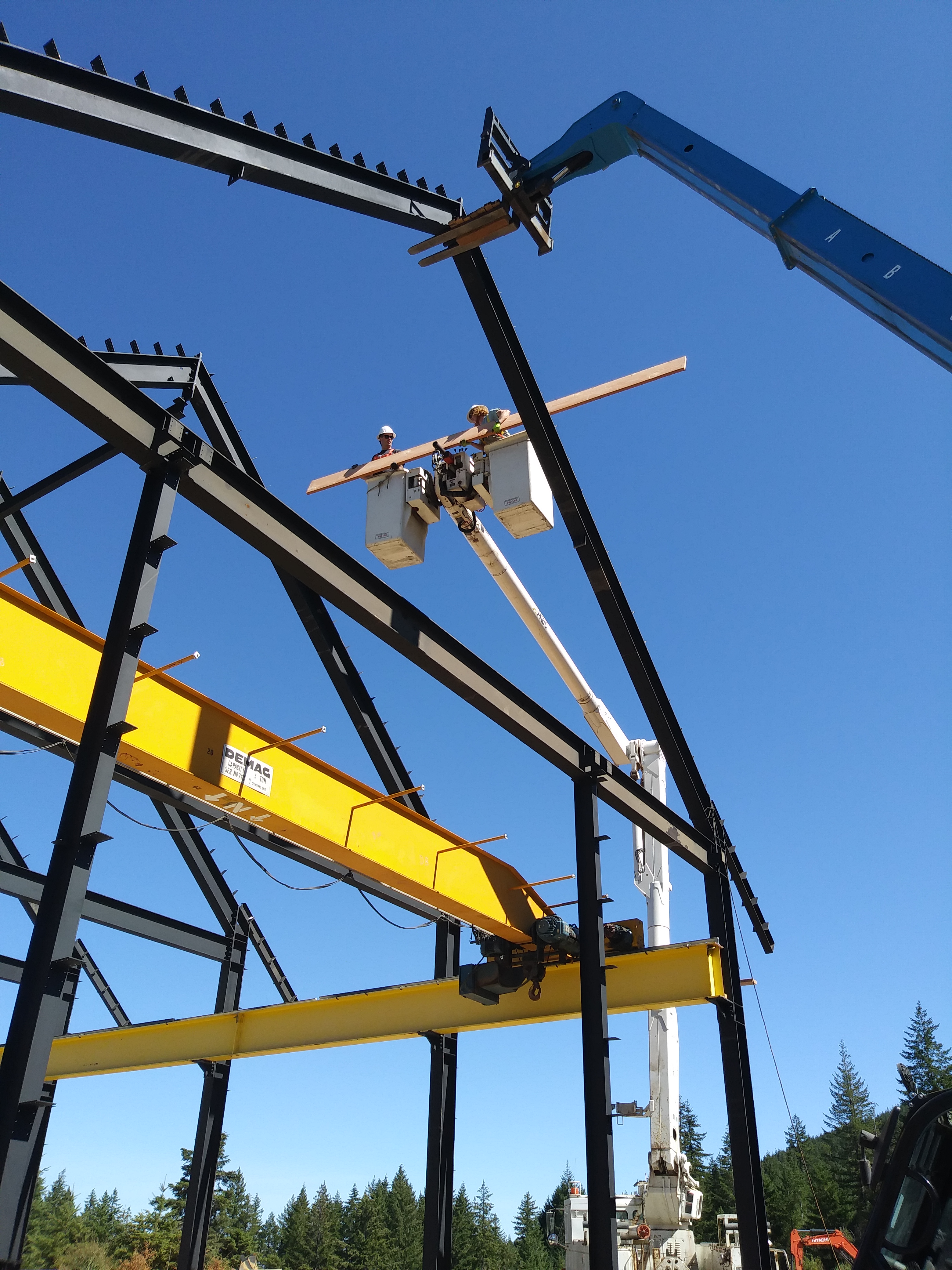 With Sam in the bucket truck and John in the scissor lift, we were able to set about two peaks per hour! (That’s very fast.) They could each align and bolt their side, and then one of them could go up to the peak to tighten the remaining bolts.