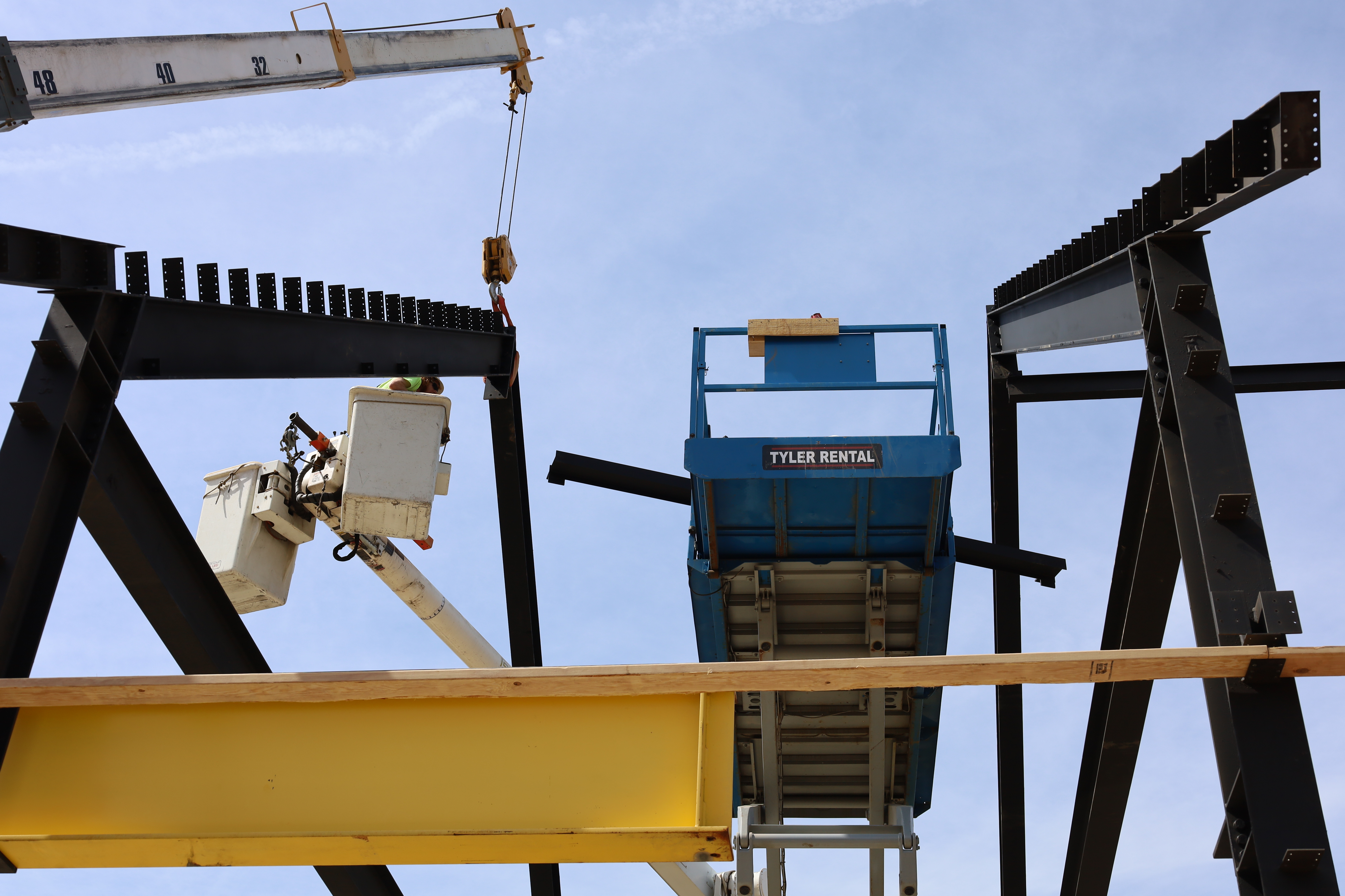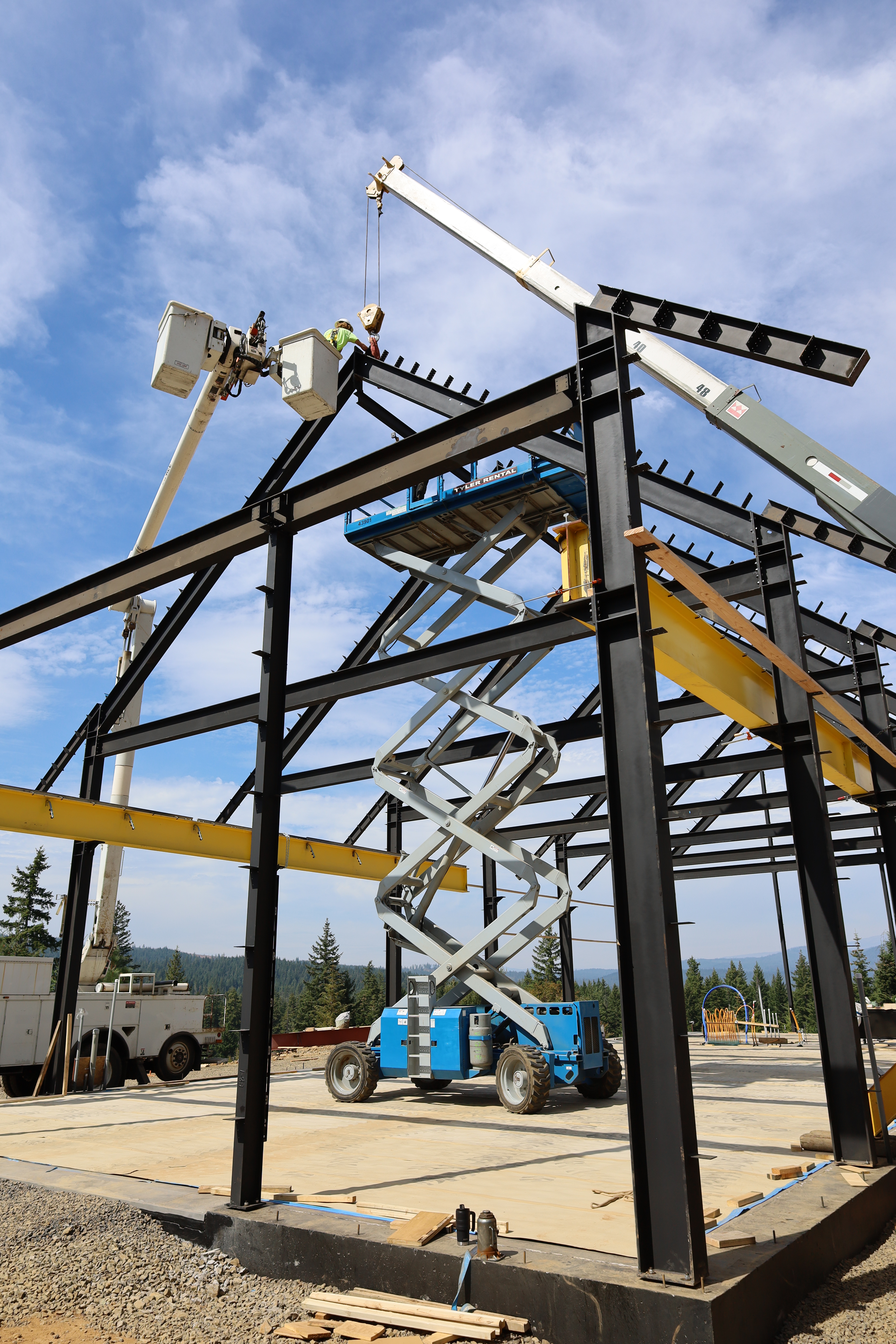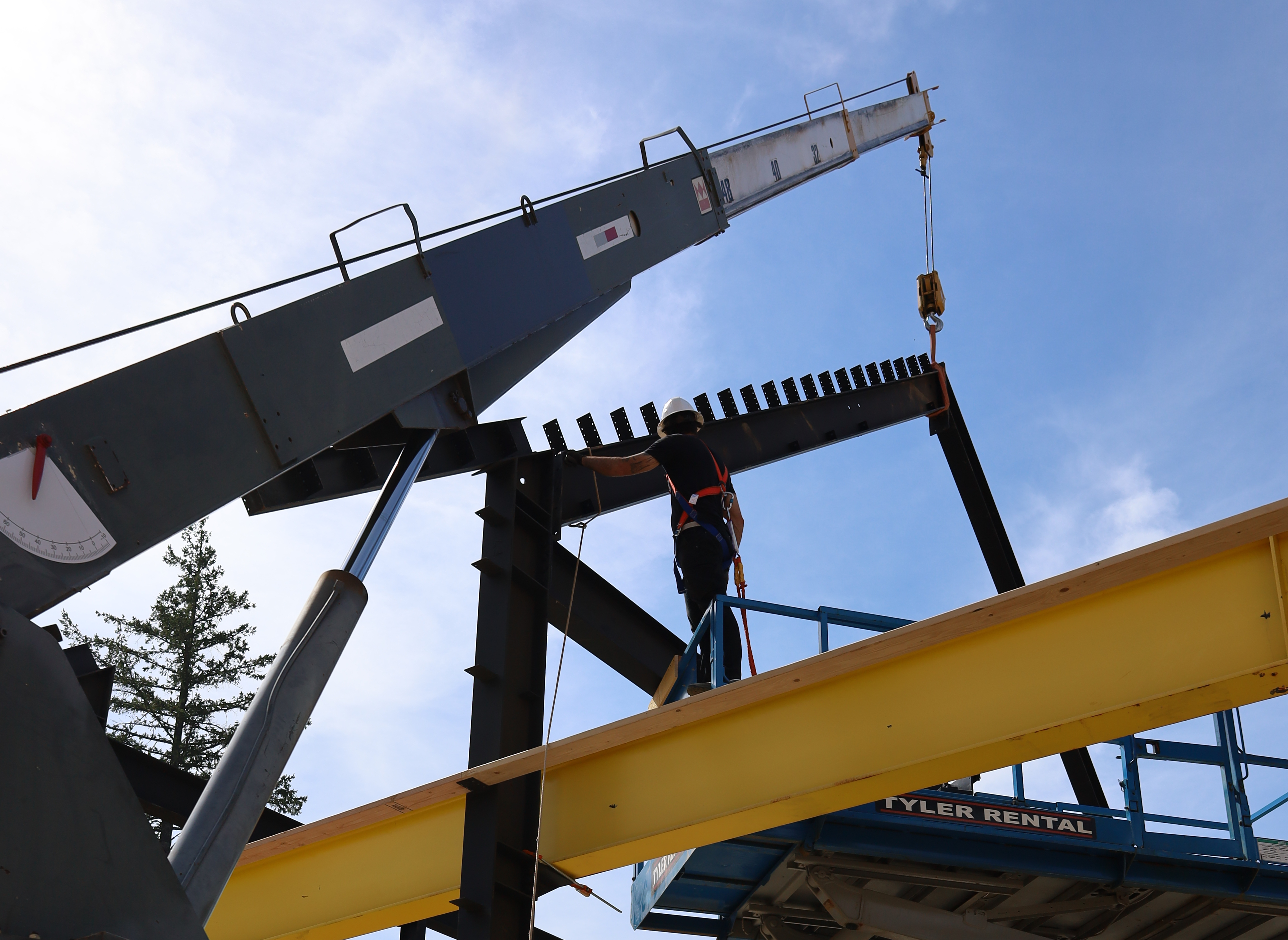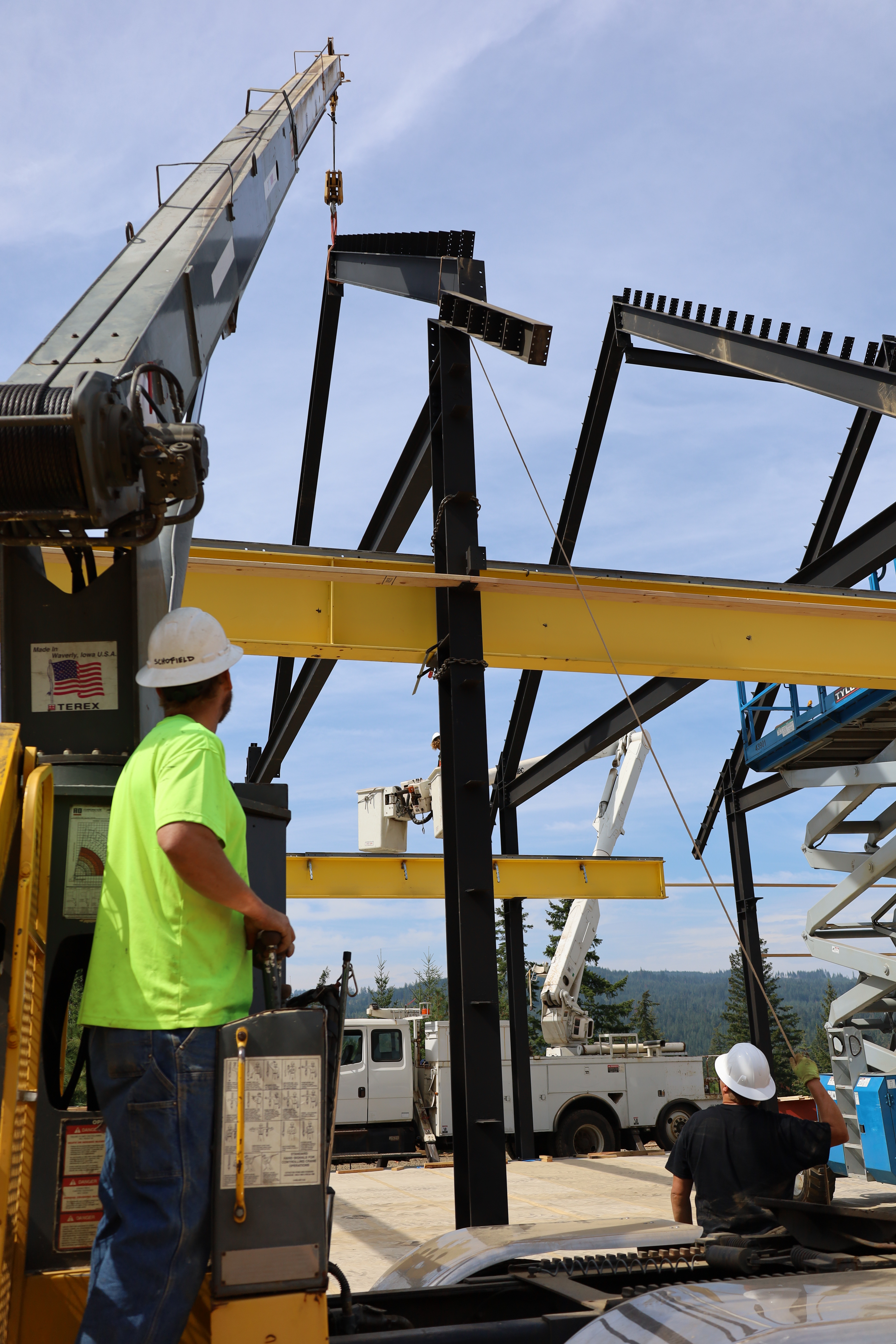 With Sam in the bucket truck and John in the scissor lift, we were able to set about two peaks per hour! (That’s very fast.) They could each align and bolt their side, and then one of them could go up to the peak to tighten the remaining bolts.