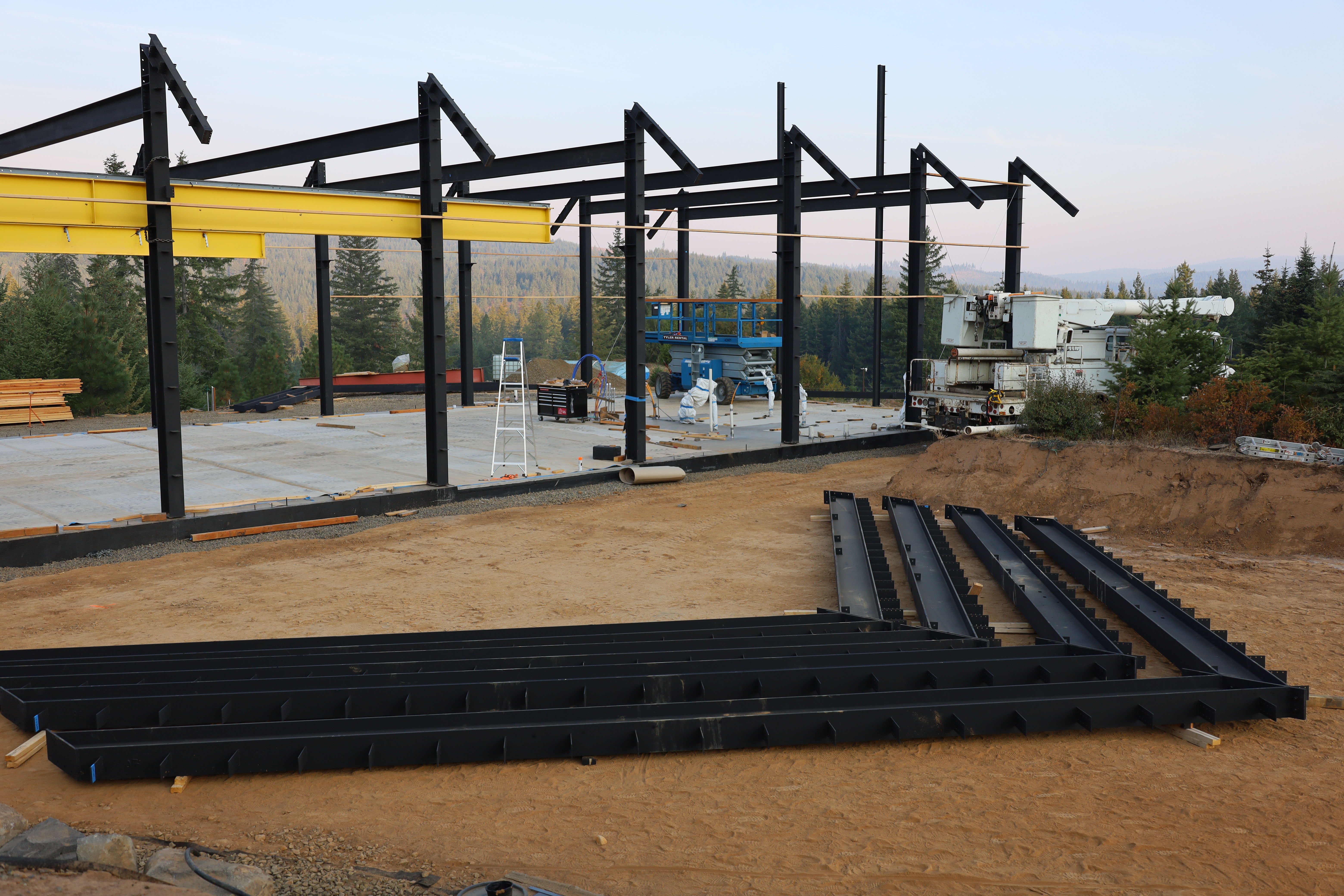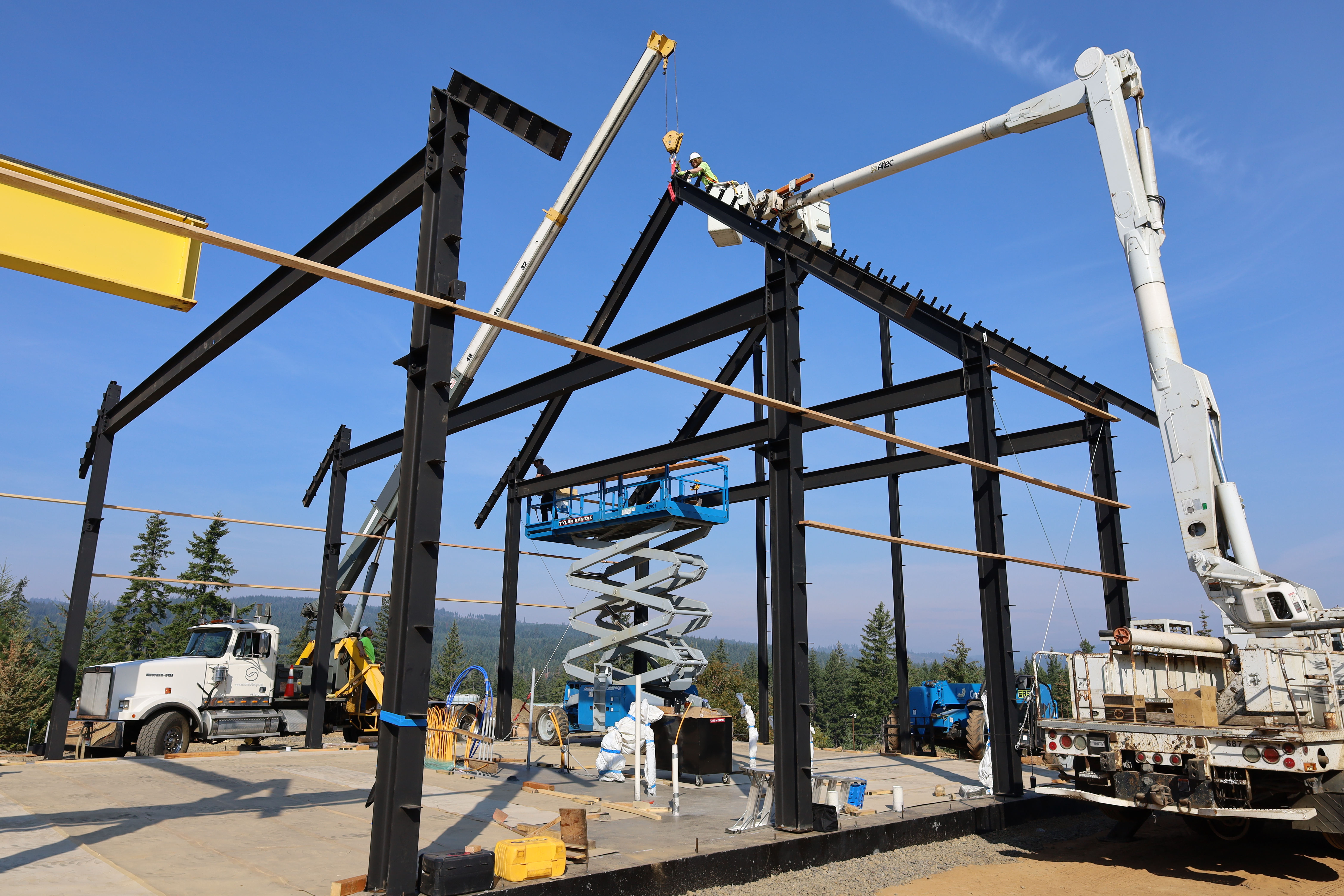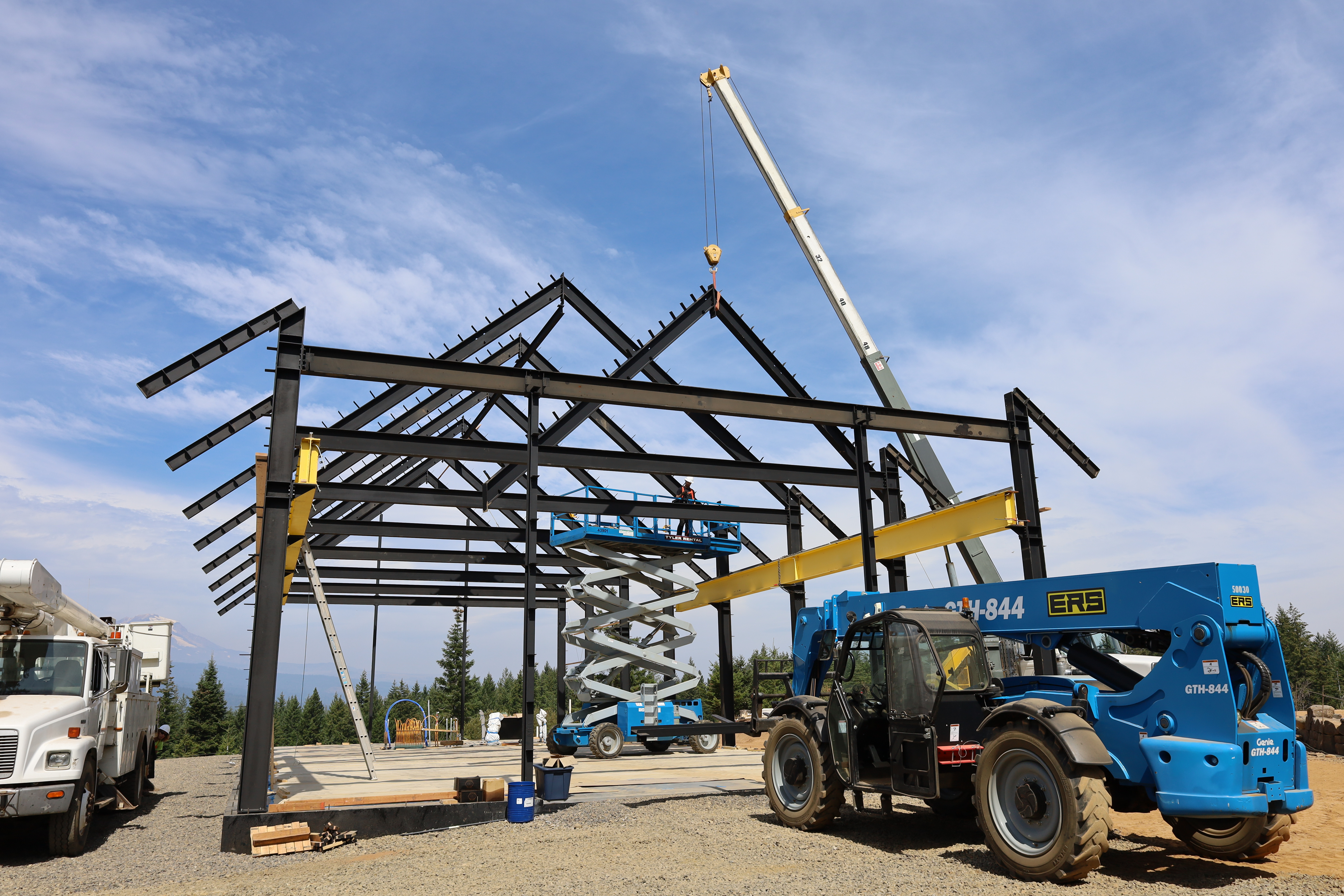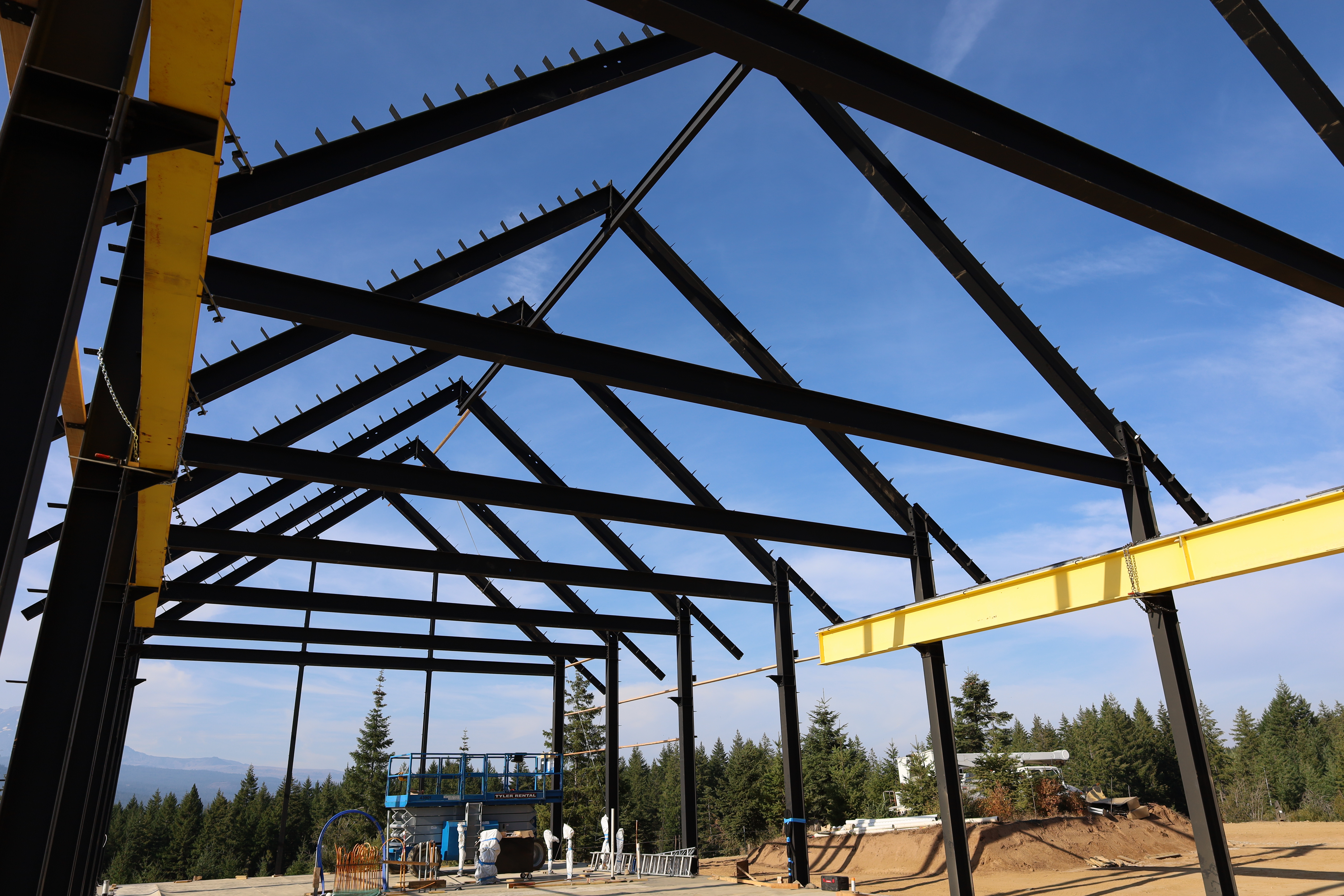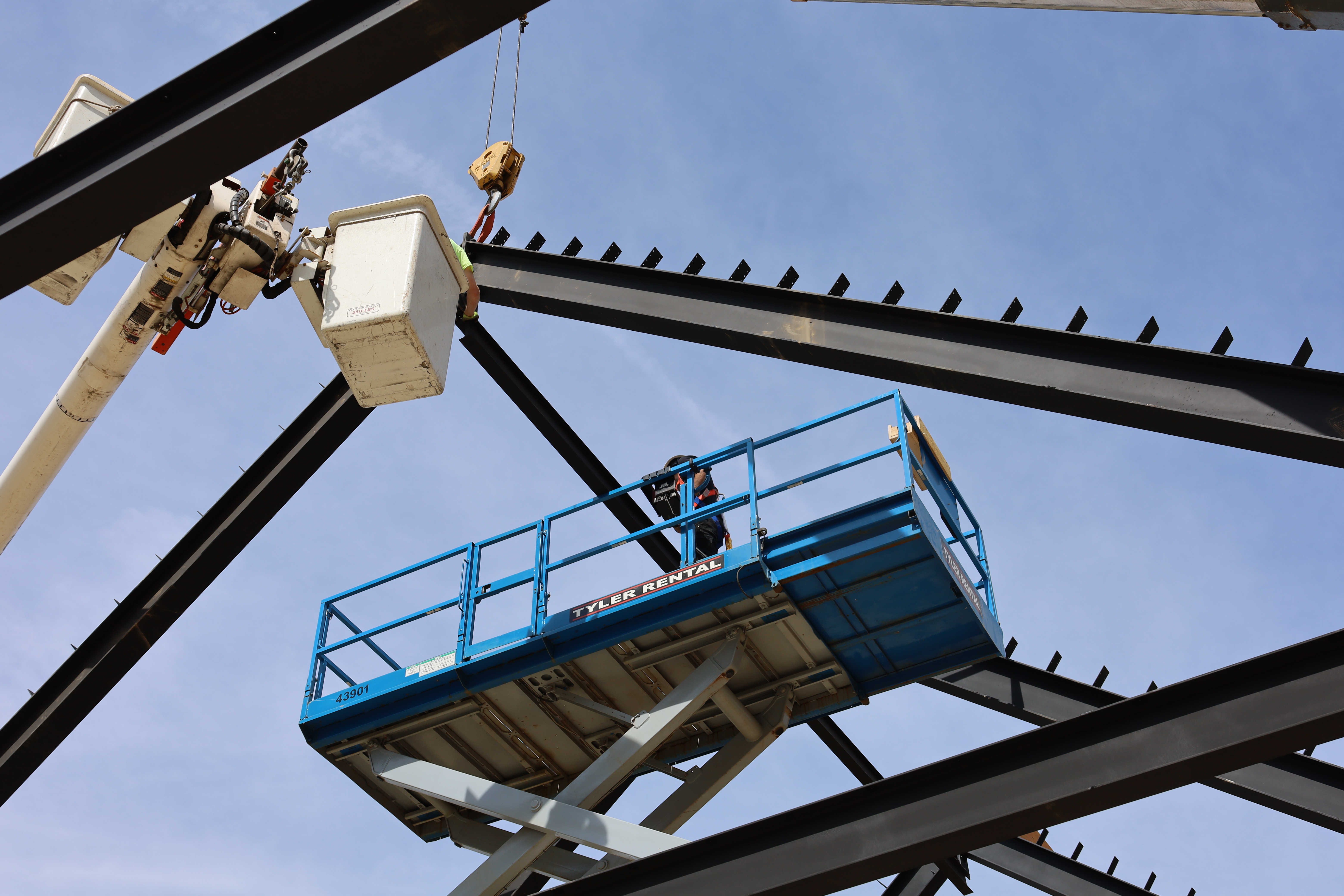 With Sam in the bucket truck and John in the scissor lift, we were able to set about two peaks per hour! (That’s very fast.) They could each align and bolt their side, and then one of them could go up to the peak to tighten the remaining bolts.