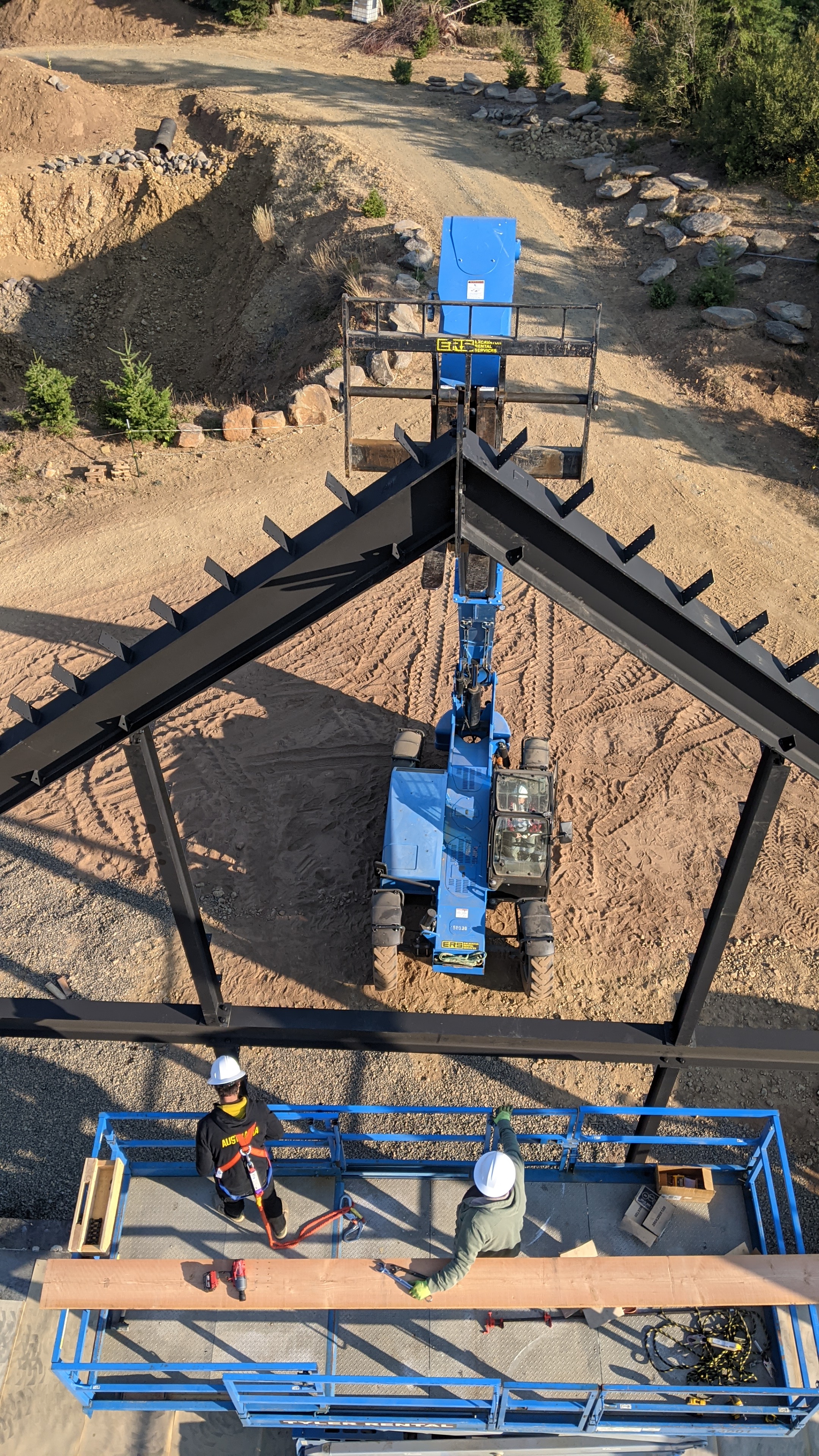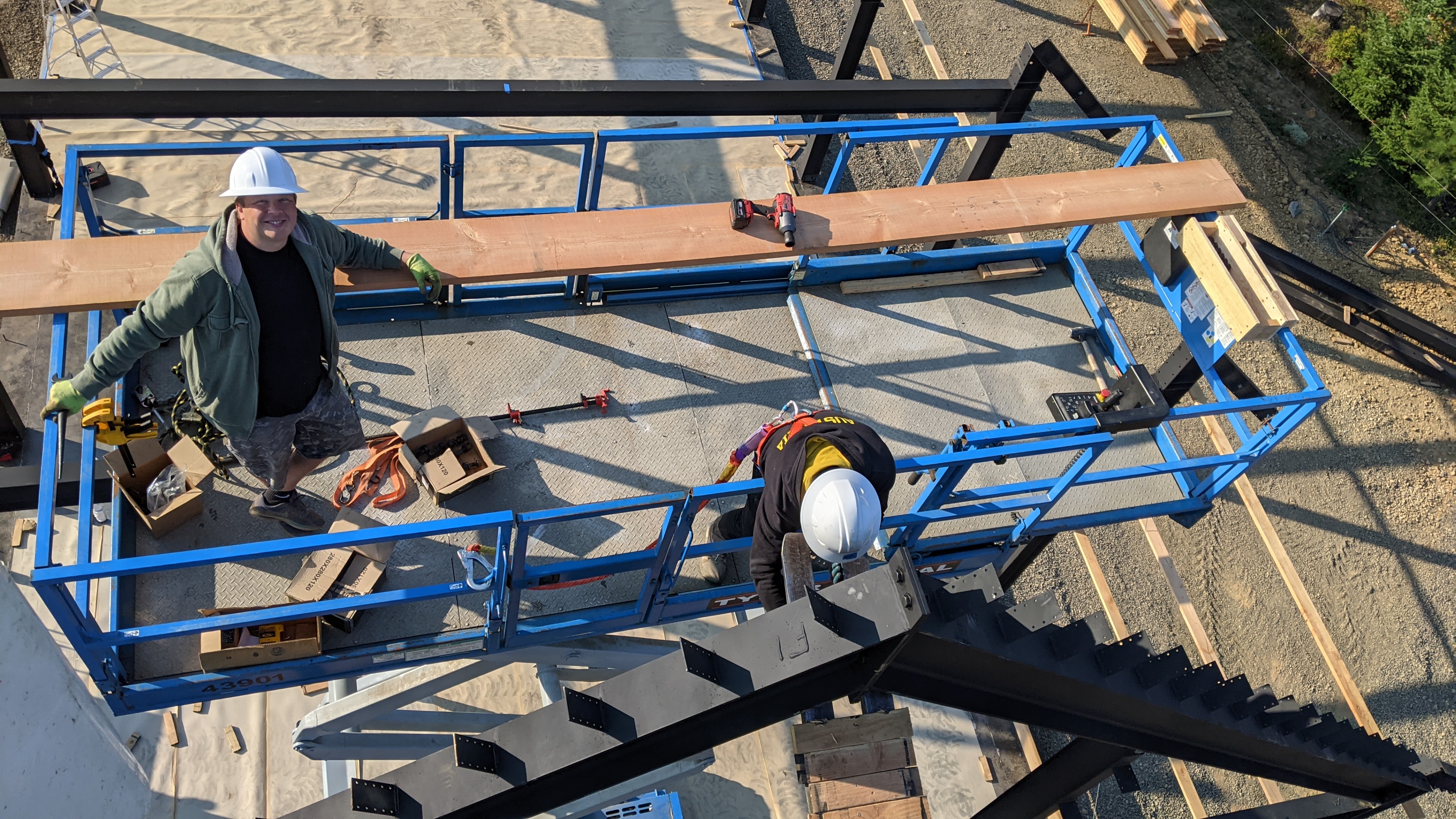 I had to put the camera down to deliver some steel ridge beams up to the boys, which connect from peak to peak. Sam and John weren’t a big fan of these. John took them up in the scissor lift and passed one end to Sam. The beams were a bit cumbersome.