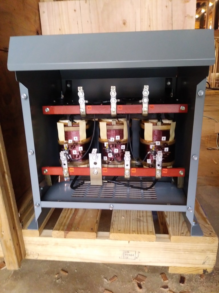 This transformer has three coils since it is for three phase power. It doubles the output voltage for each wire, creating the 480V we need for the crane.
