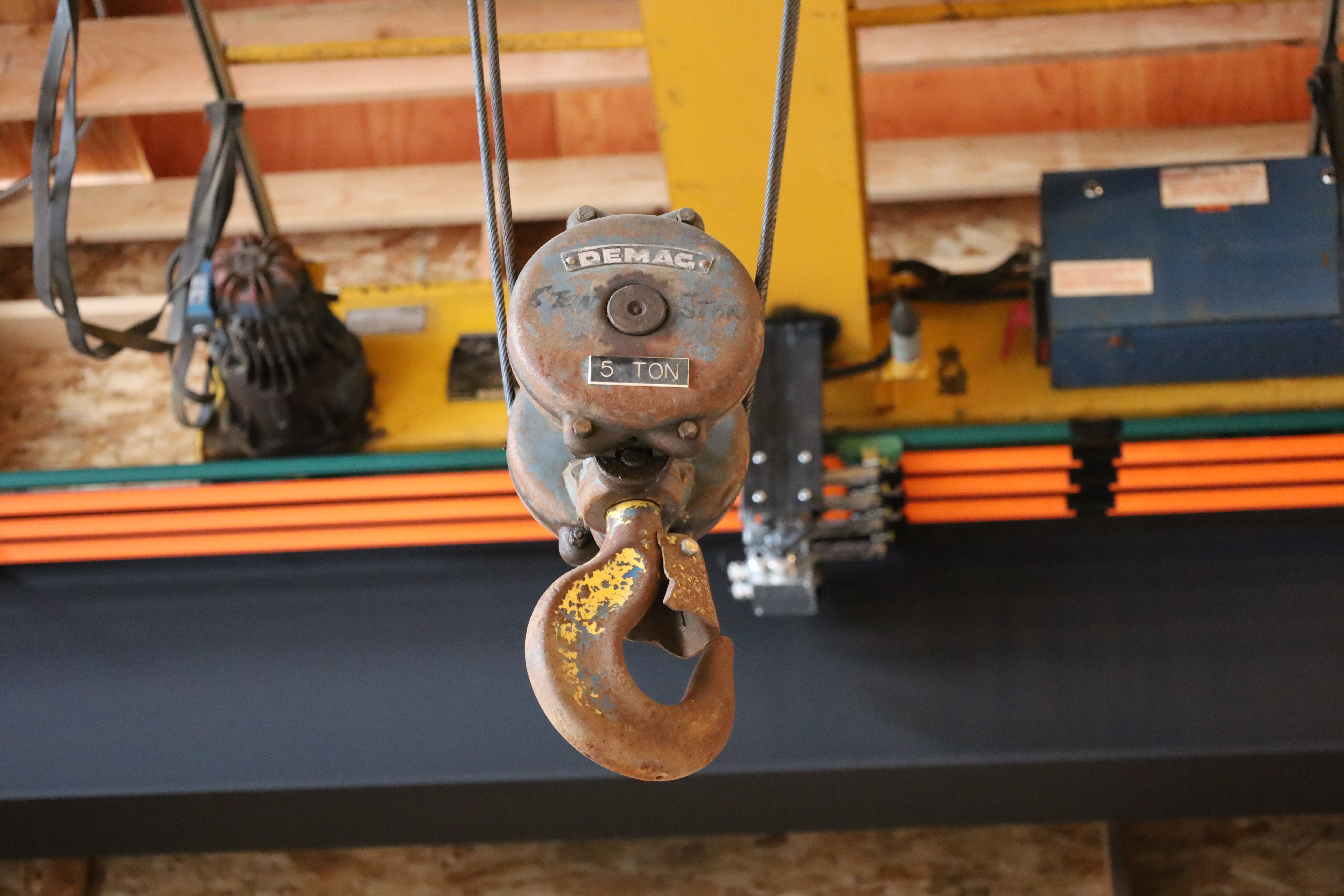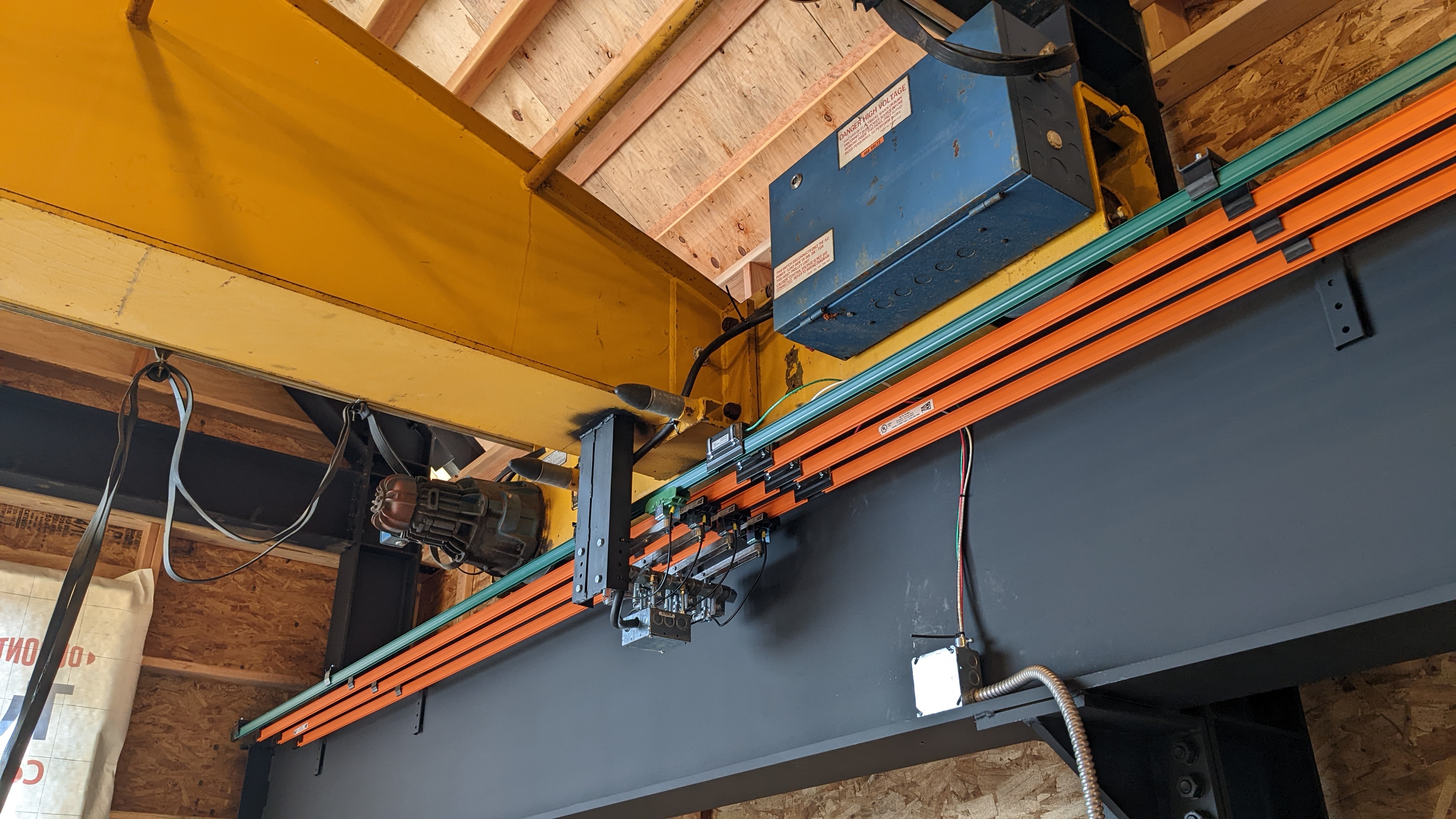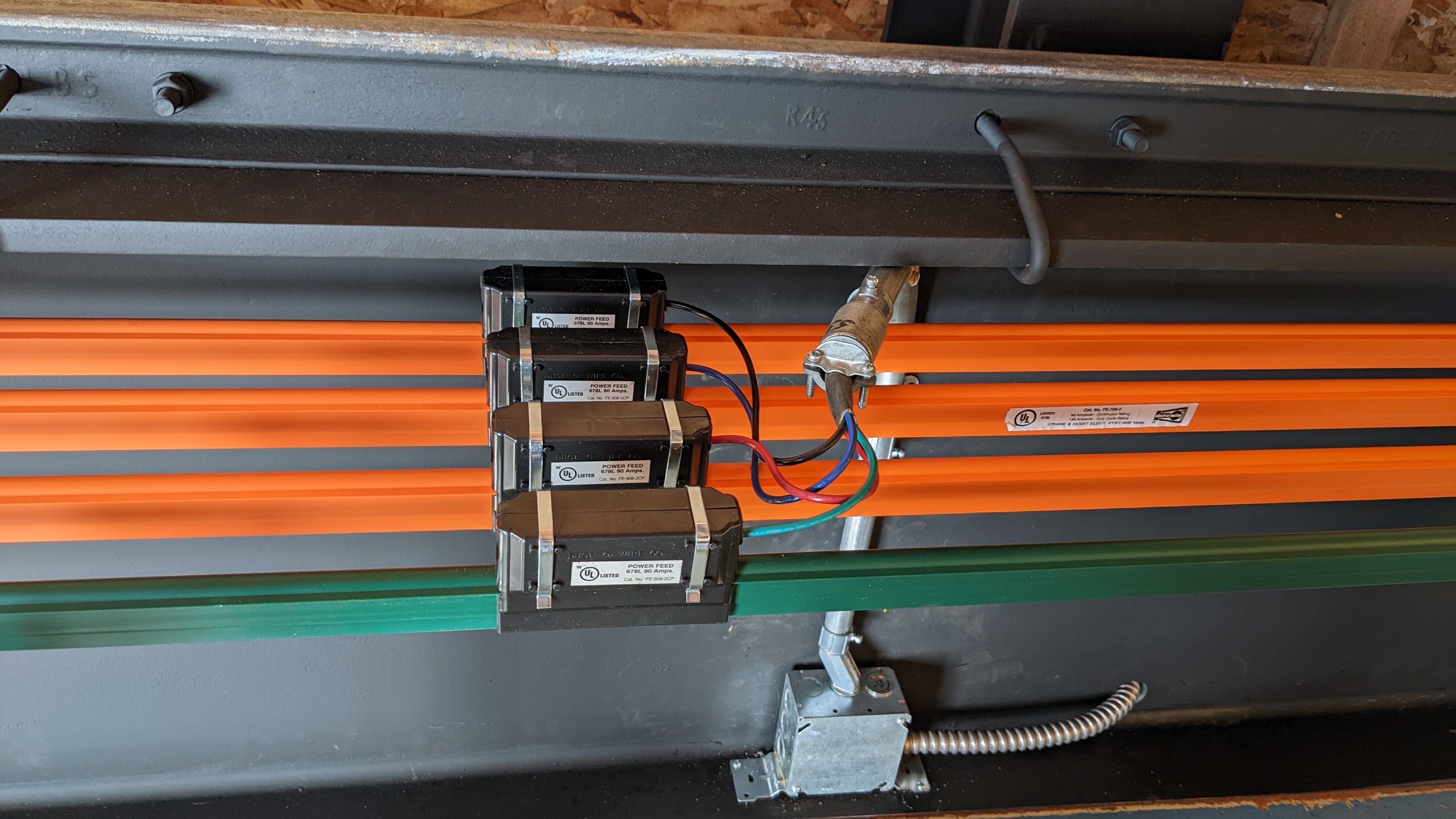 It’s because the bridge crane runs on three phase power (normal residential power is single phase). On a really basic level, single phase power is supplied with two powered wires, plus a neutral wire. Three phase power involves three powered wires (hence the three orange tracks and the green “ground” track).
