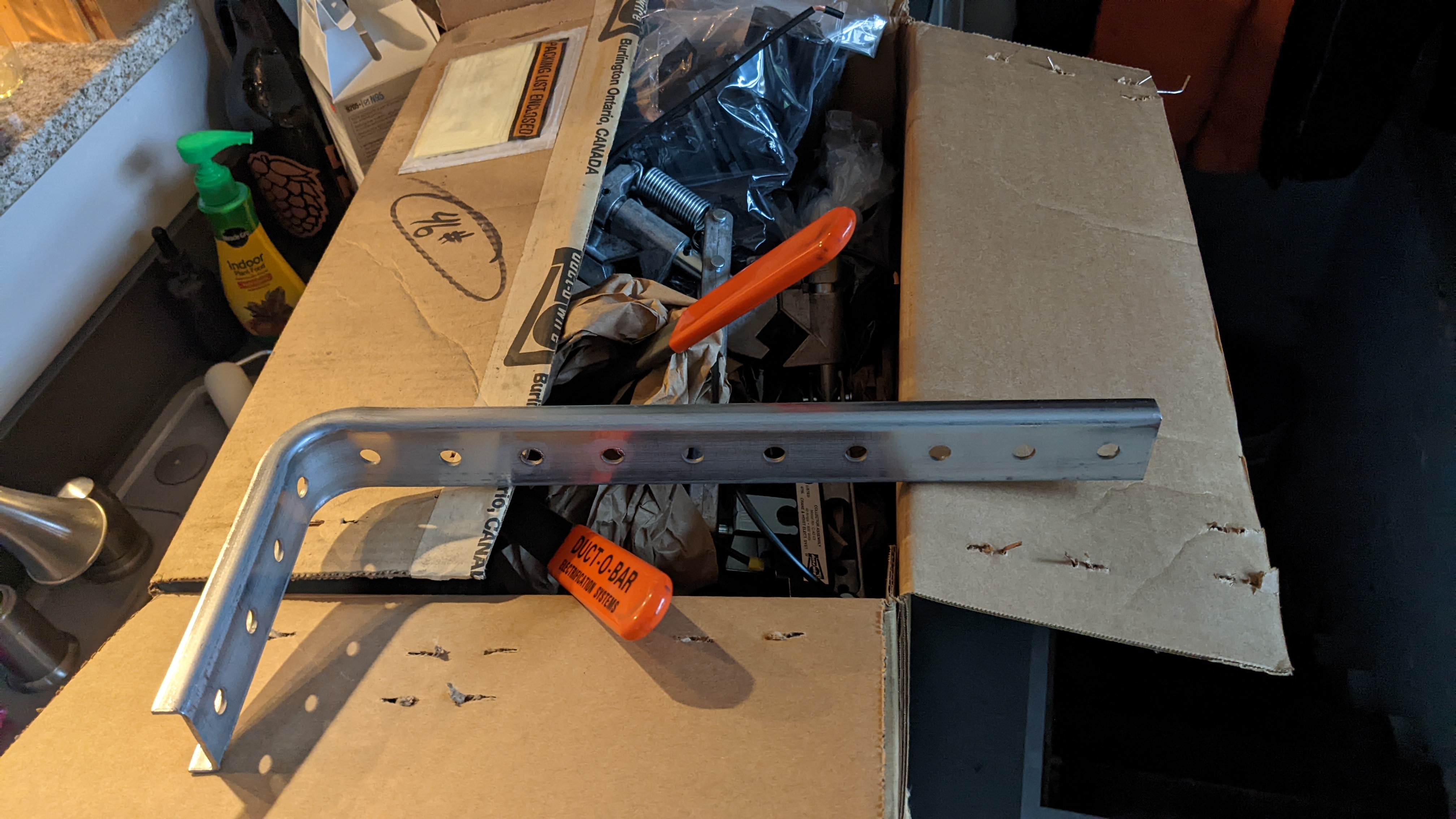 Then, John laboriously straightened out all of the bent steel brackets. (This required a propane torch and a lot of muscle.) The following day, Sam unpacked some boxes that came with the crane and discovered a brand new set of brackets. Oops! Sam and John begrudgingly removed the old brackets from the beams, and Sam welded the new ones in place.