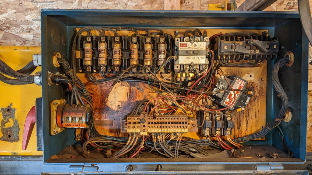 The power then goes to the special circuit breaker panel (right in photo) for three phase power. This panel can be used for all of the three phase 240V tools in the shop. However, the 5 ton crane runs on 480V, so Sam purchased a transformer (of course!).