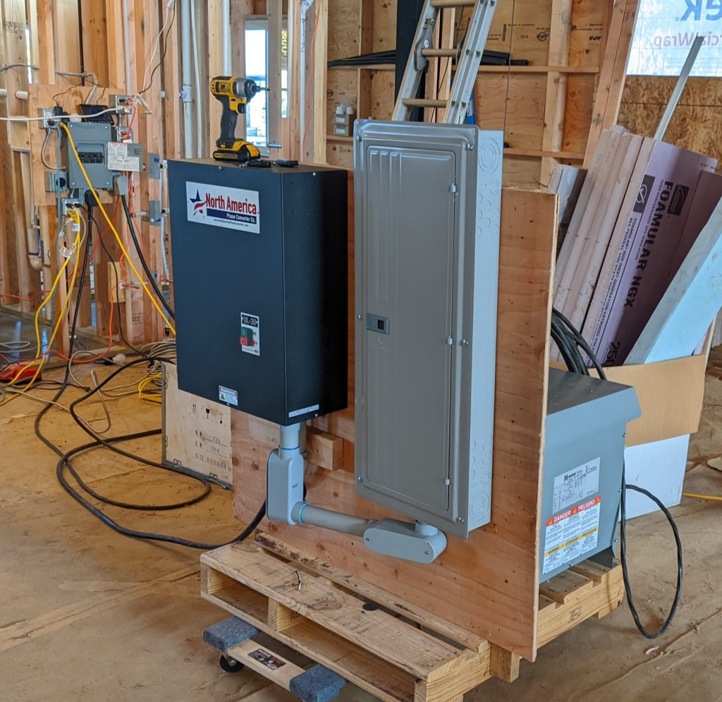 Three phase power is more efficient and allows normal sized wires to be used to deliver high power. In some regions, it is possible to tap into the power company’s three phase power (at a cost), but that isn’t an option where we live. We had to get a phase converter. Like its name implies, a phase converter converts single phase power into three phase power.