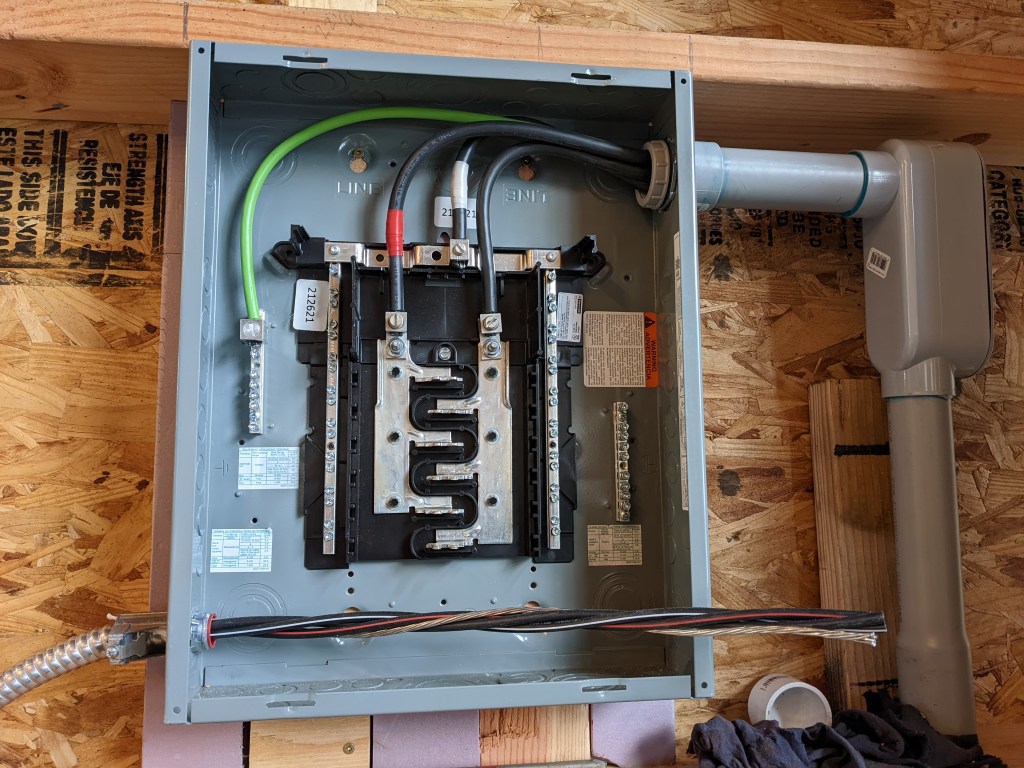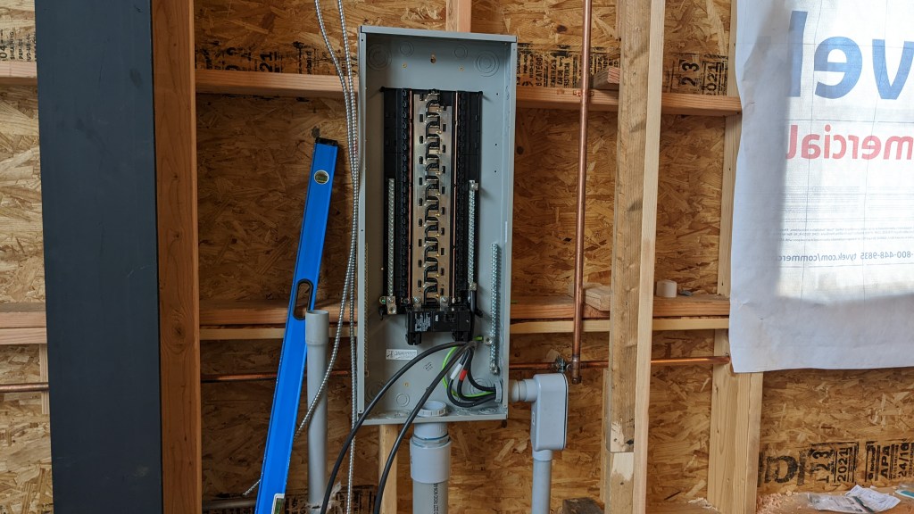 We don’t have all the breakers yet for the other two panels, but at least the panels are set up now. Sam has been carefully planning which things can share a circuit, trying to keep the breaker count to a minimum, but there will assuredly be a lot.