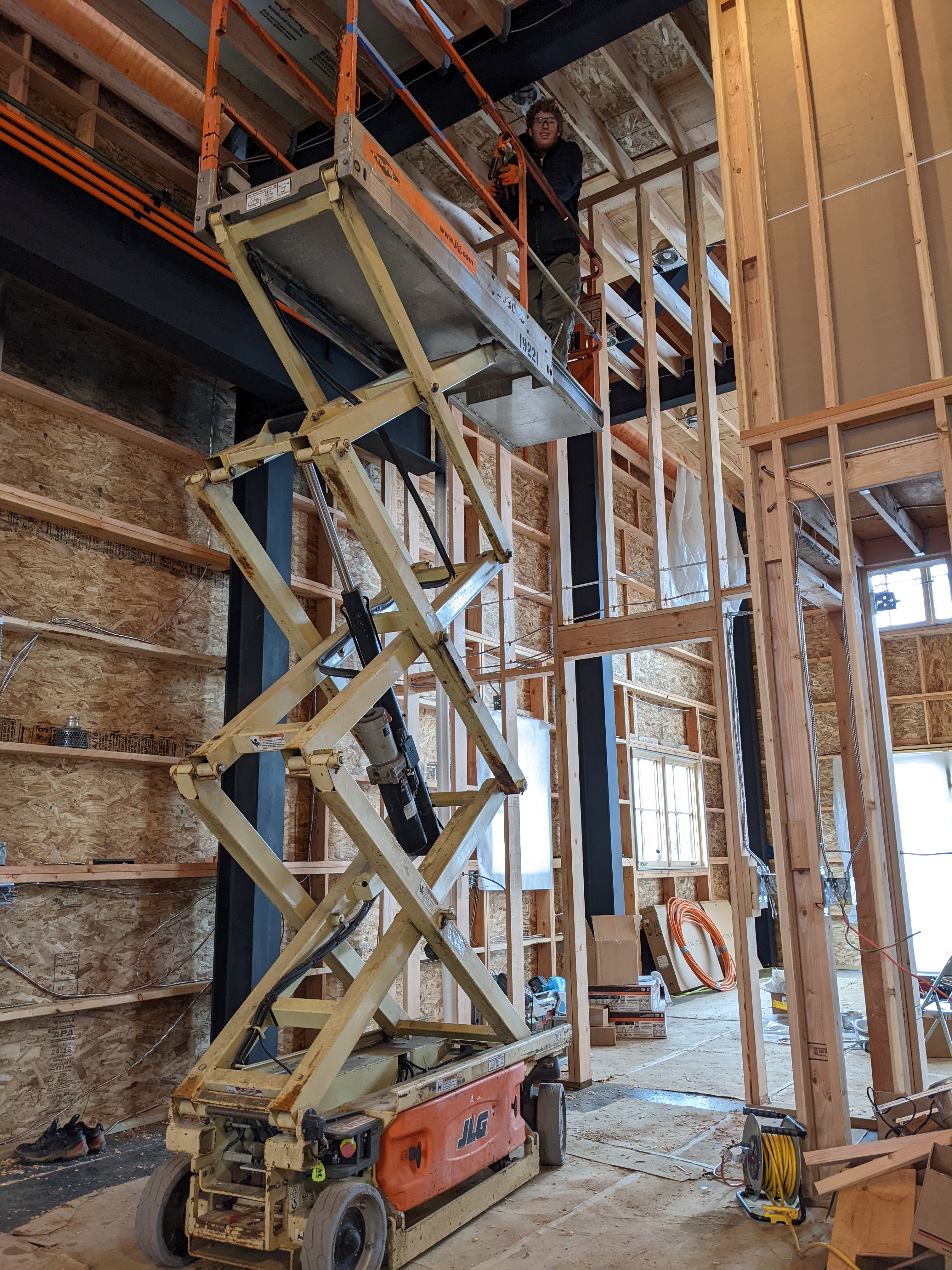Another scissor lift! This little rusty guy is electric and can fit through a doorway. We picked it up in Seattle and visited some friends while we were there. Sam tested the lift out and entertained a few dog walkers before we left.