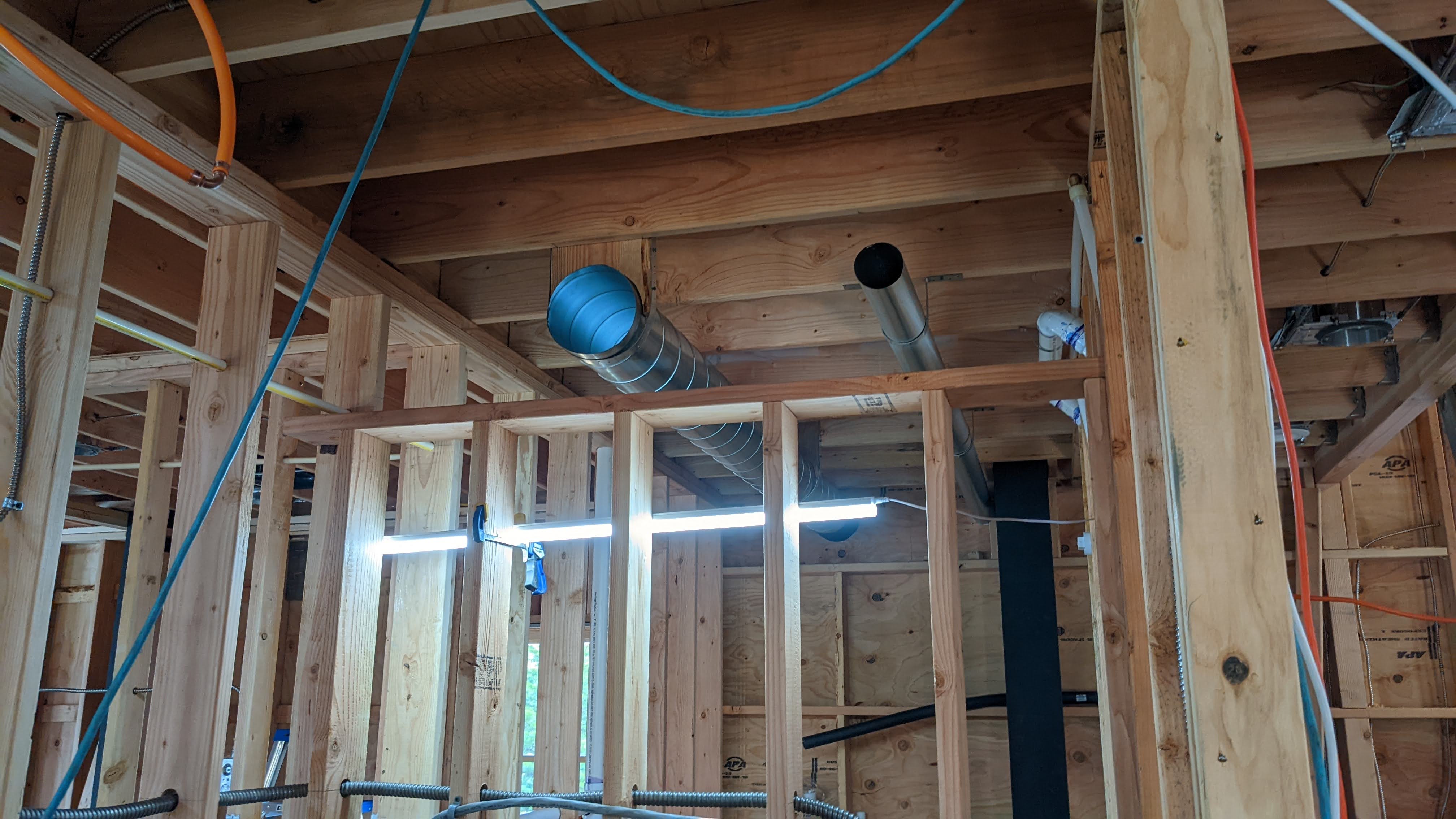 To hide this 8 inch beast, we built a dropped ceiling in the shop bathroom. Some other ducts and plumbing pipes share the concealed cavity between the dropped ceiling and the second story floor.