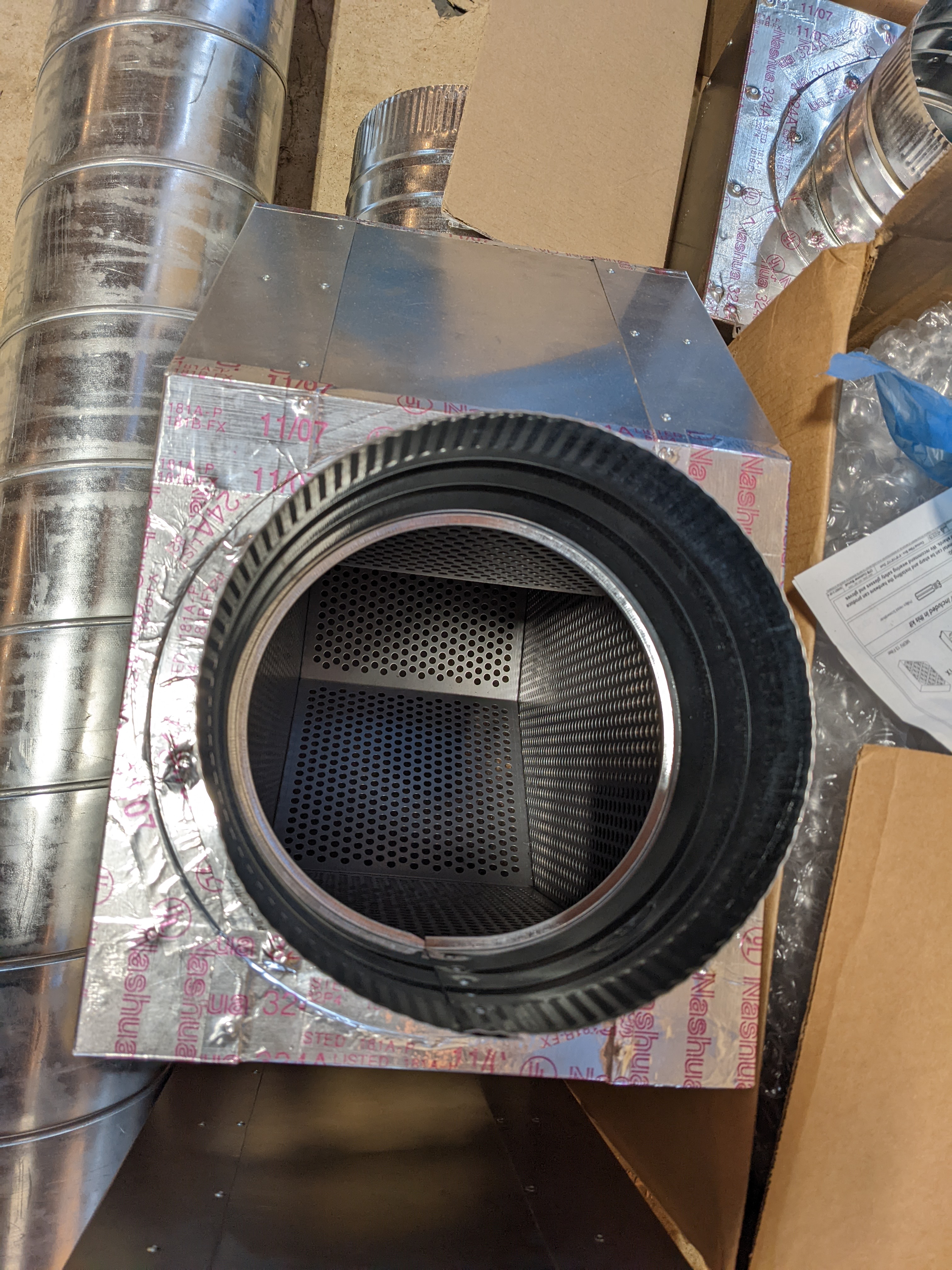 Larger ducts are typically noisy, so Sam found these noise reducing elbows to incorporate in our system. The fan lives somewhere between the two elbows, and the sound is contained between the elbows. They look neat inside. You can yell in one end, and the sound gets lost inside due to the holes and angles.