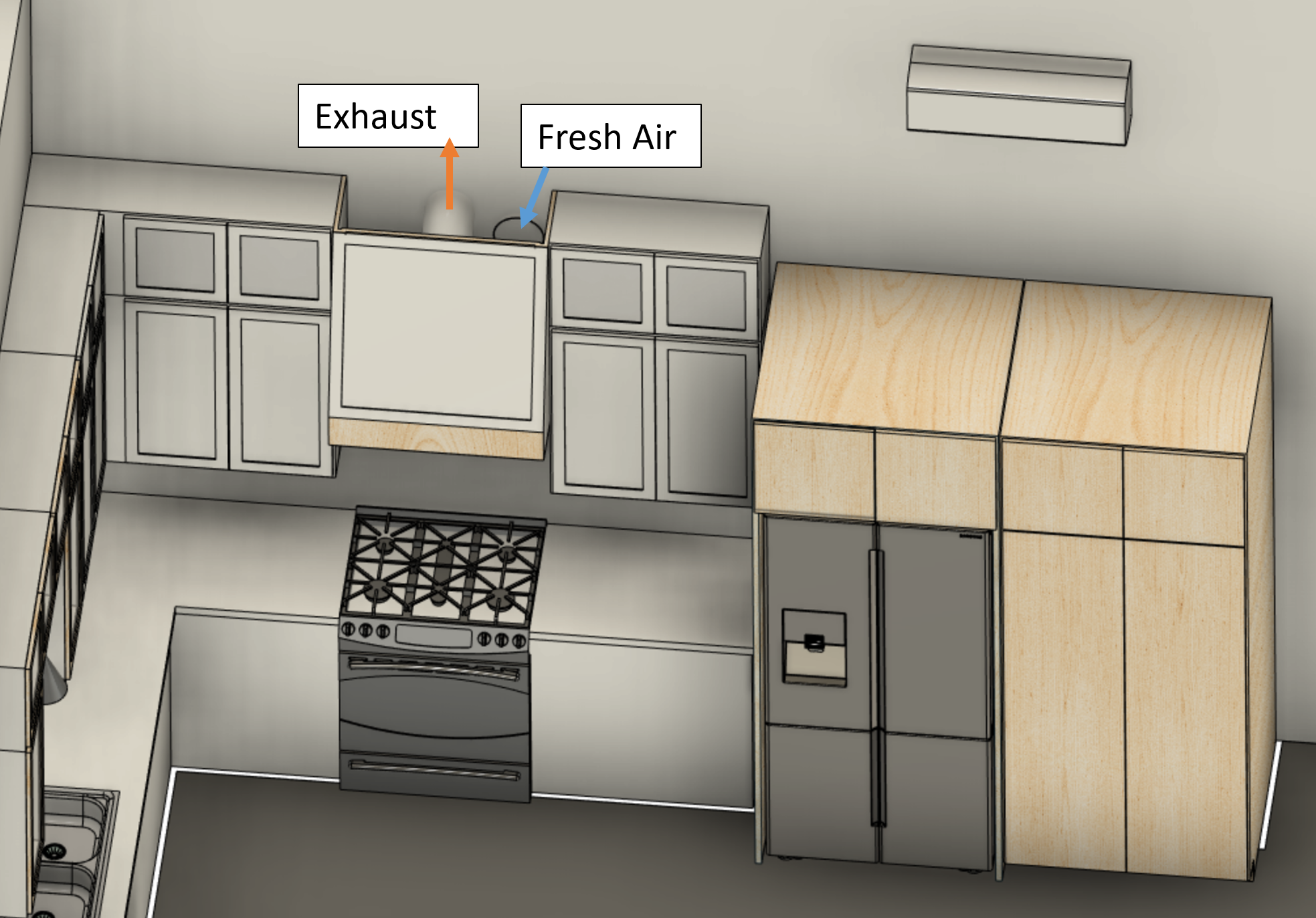 The outdoor air will travel in through a duct, passing through a filter. Then a fan will push the fresh air into the kitchen via another duct. The kitchen exhaust and fresh air ducts will be hidden in a cabinet.