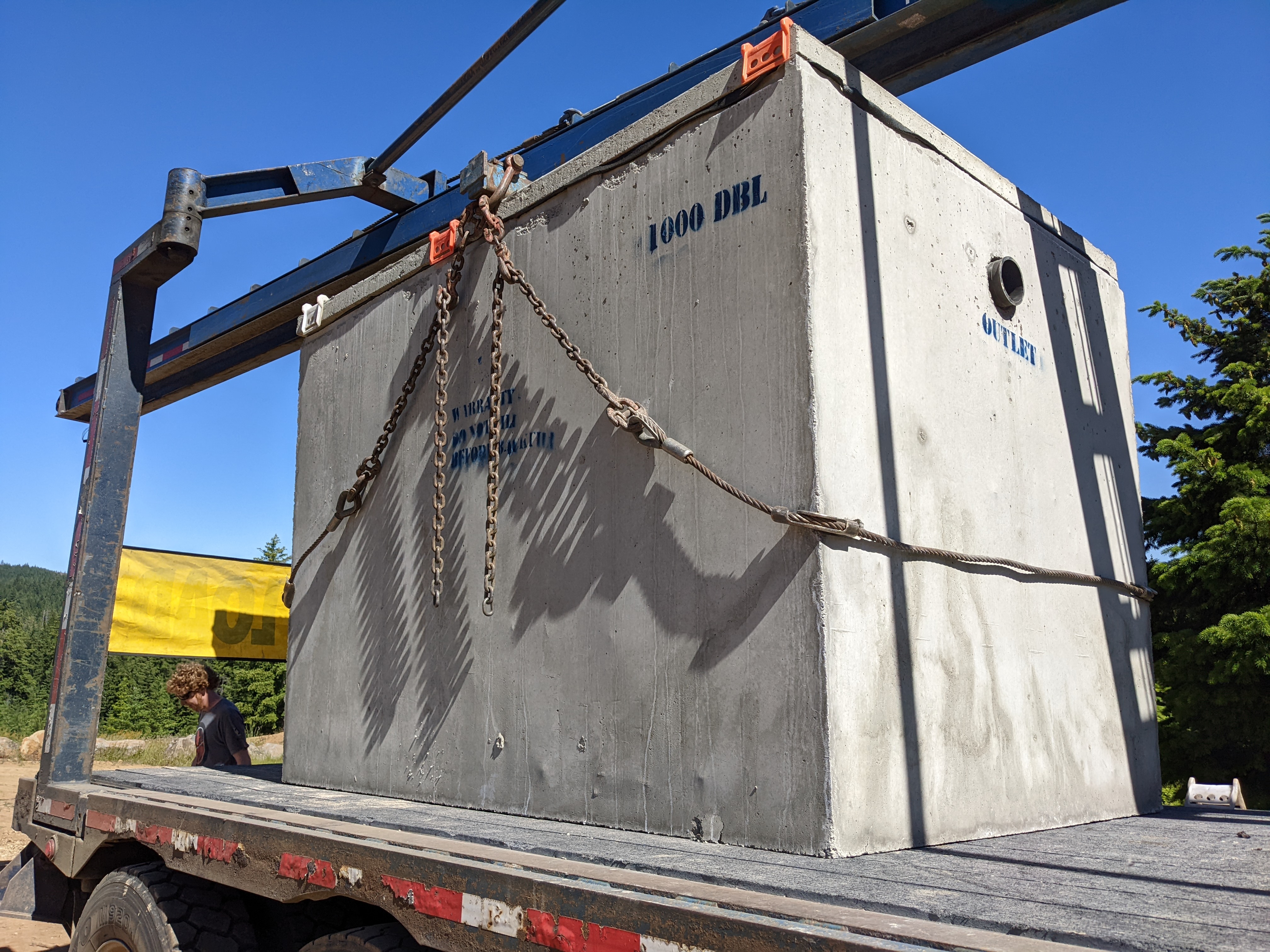 We purchased a concrete tank because the lightweight plastic ones are currently three times the cost! It was by far our heaviest single item purchase, weighing in at 9260 lbs! We named the tank “Wilbert” after the company we got it from.