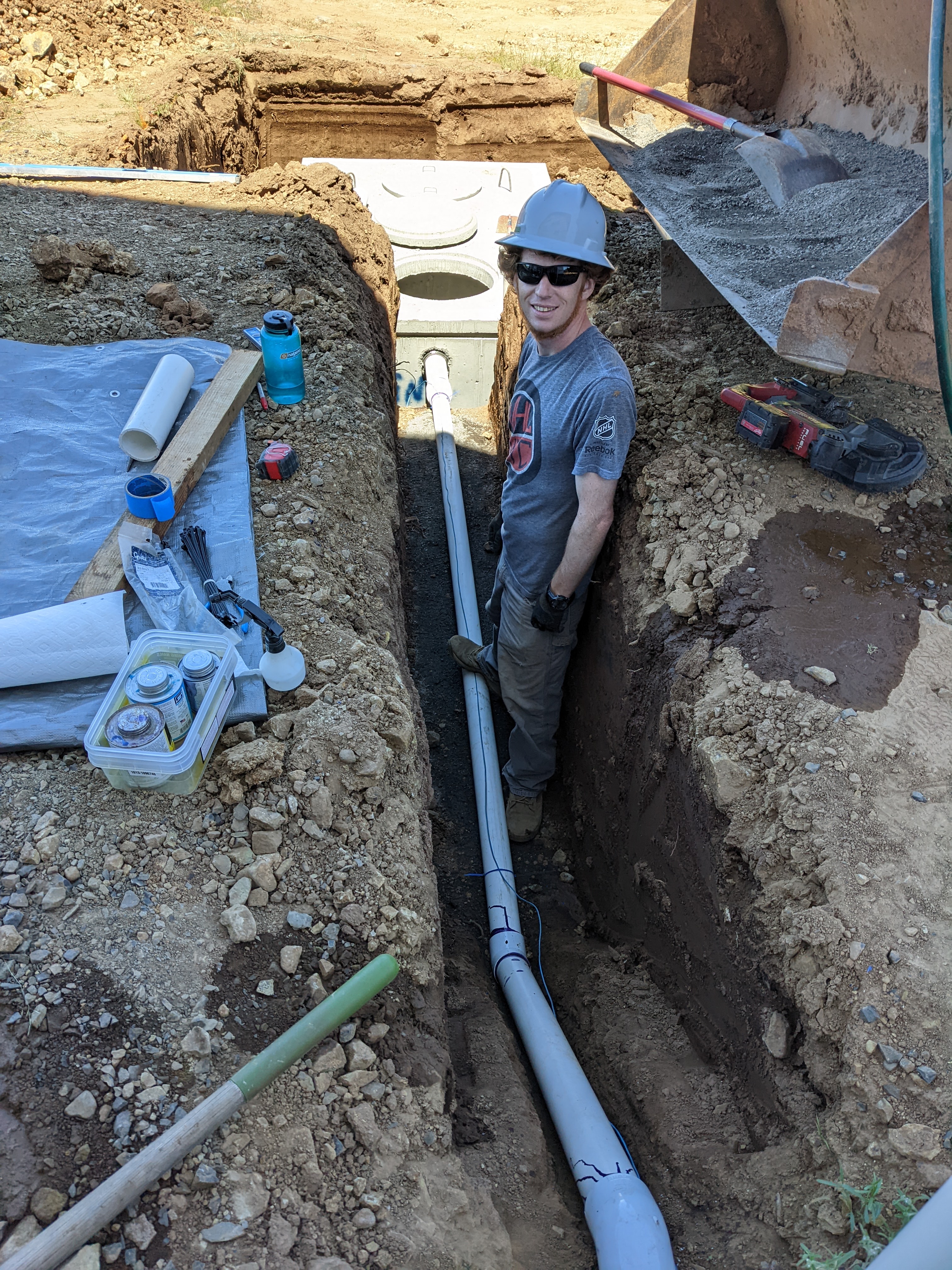 Next, Sam dug a 120 ft long trench from the tank down to the leach field. Aiden helped lay the pipe.