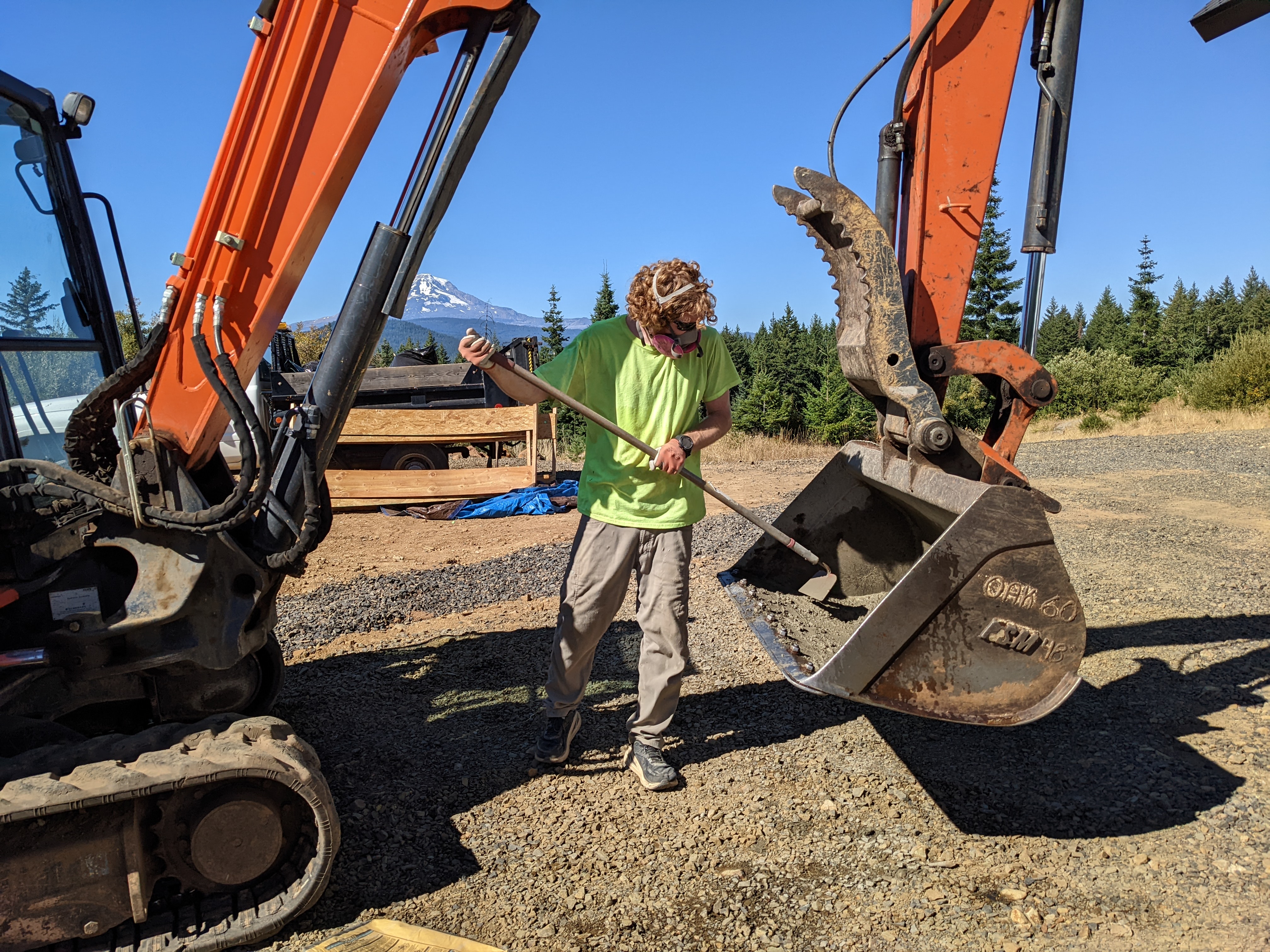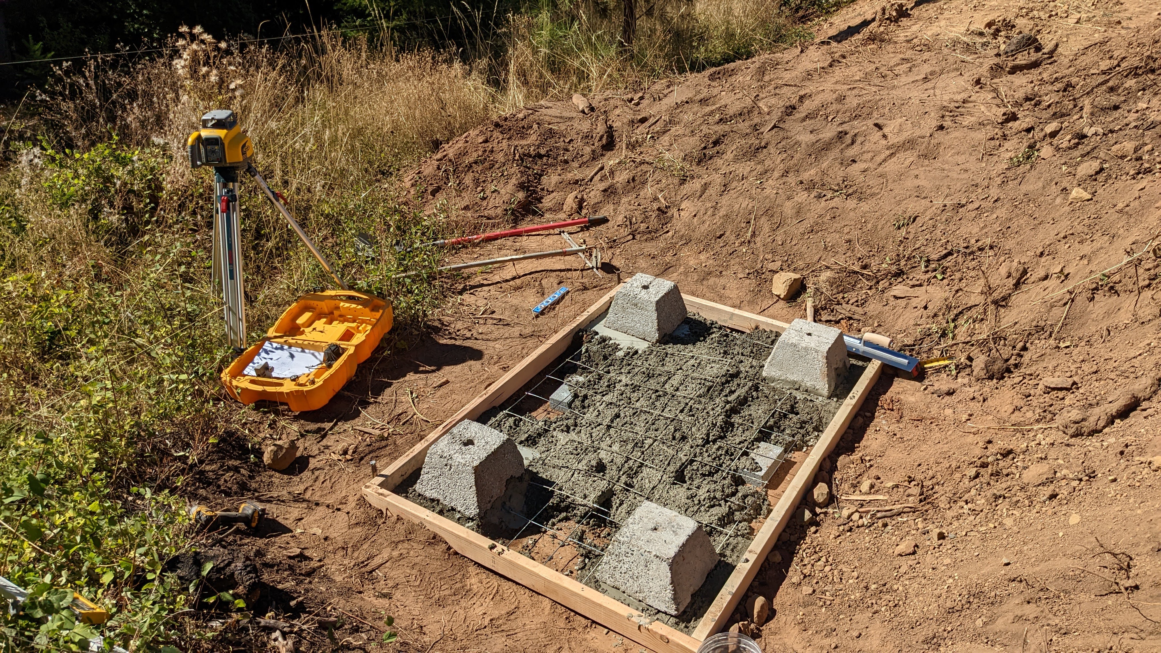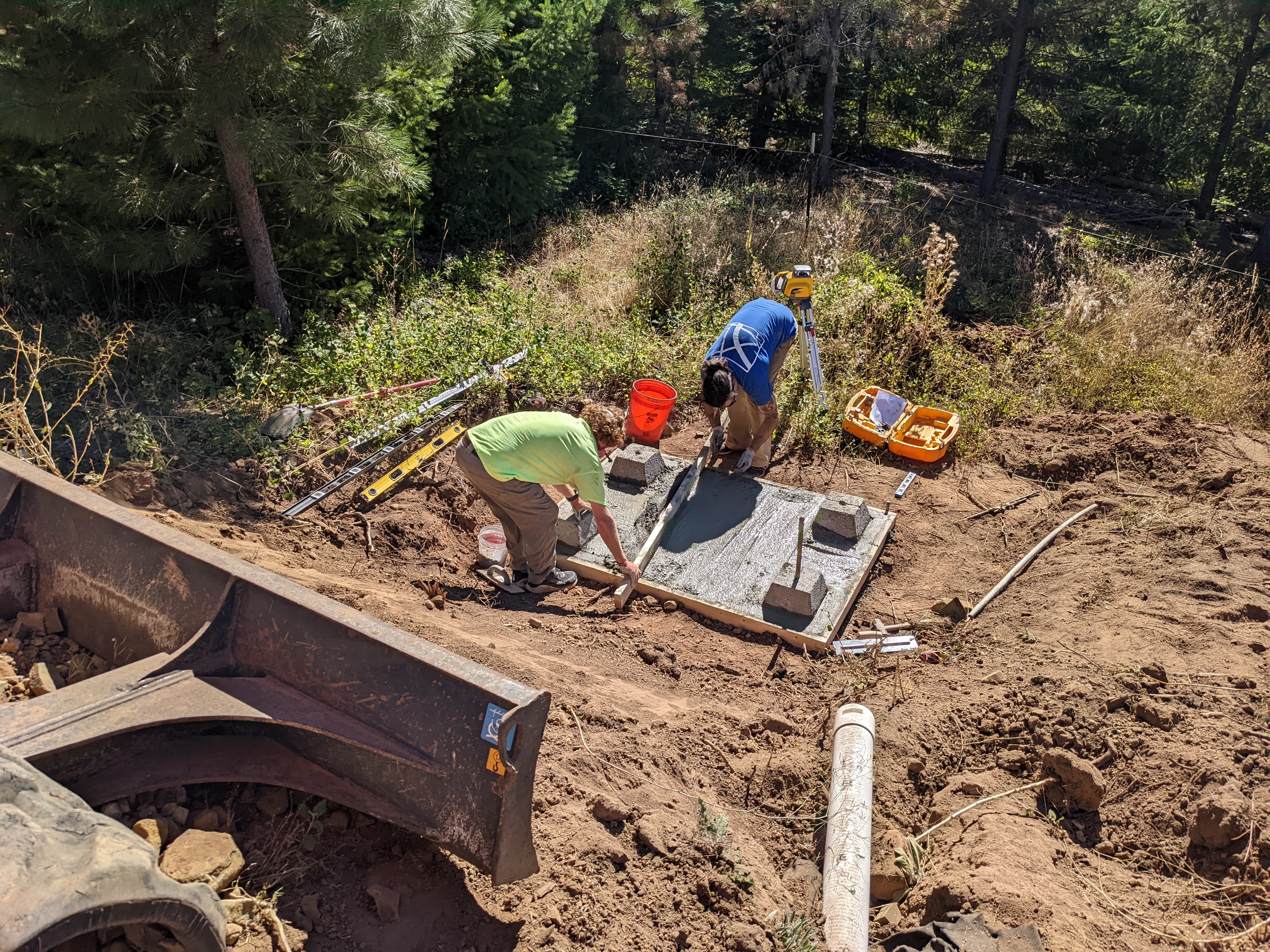 While Aiden was fabricating the stand, Sam and John poured a concrete pad for the base. The pad is about 4ft x 7ft and almost 4 inches thick. It took 16 bags of concrete that Sam and John had to mix by hand! They mixed it in the excavator bucket for easy pouring.