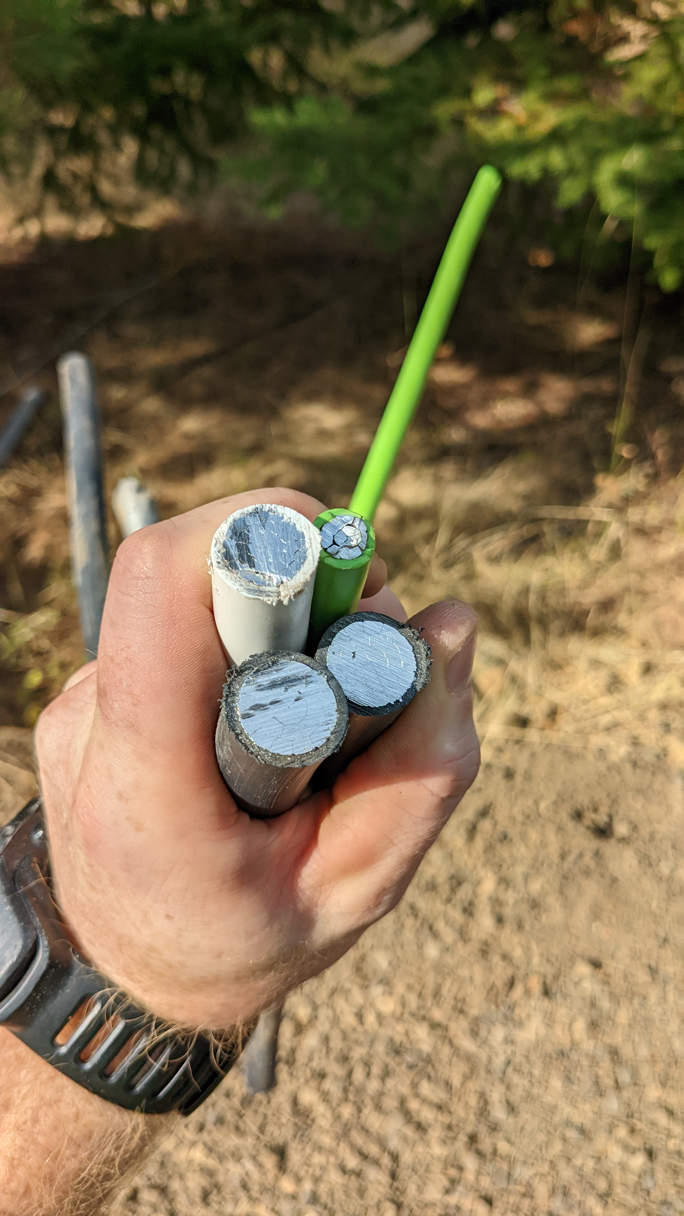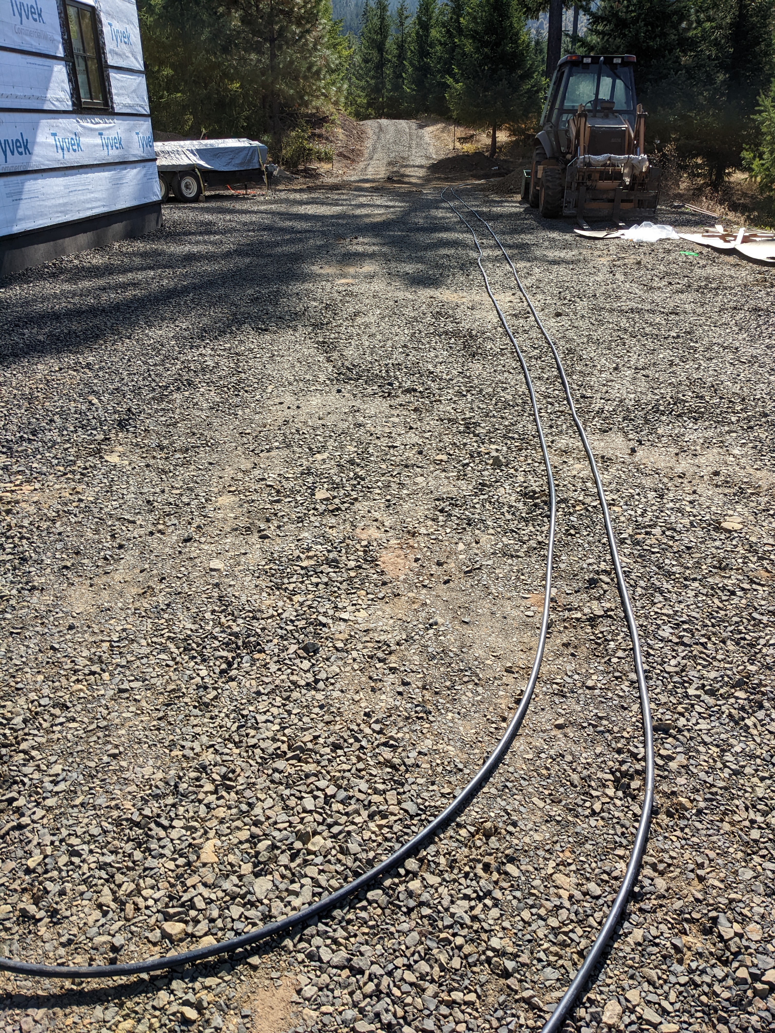 The meter base gets power from the transformer. Sam had buried empty conduit for this when the transformer was installed a few years ago. Now we just had to locate the conduit and dig it up. Good thing we had the cats to help dig!