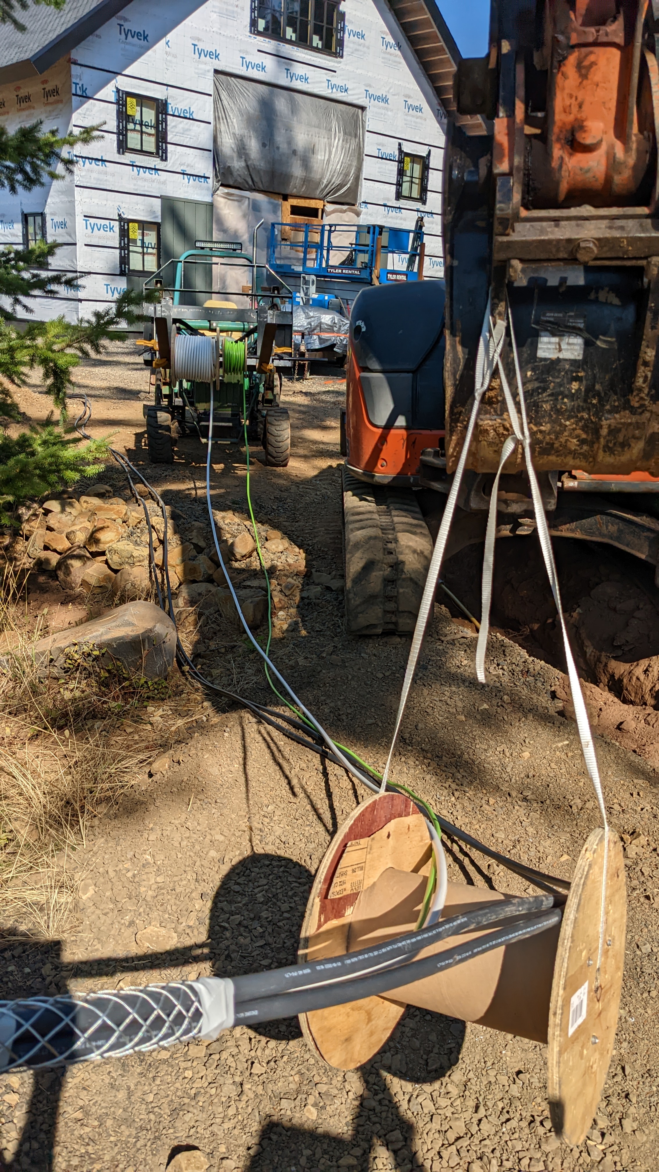 Sam stayed outside to feed the wire down the conduit. He positioned the excavator above the transfer switch and hand-fed the wires down the conduit (with the help of some spools he rigged).