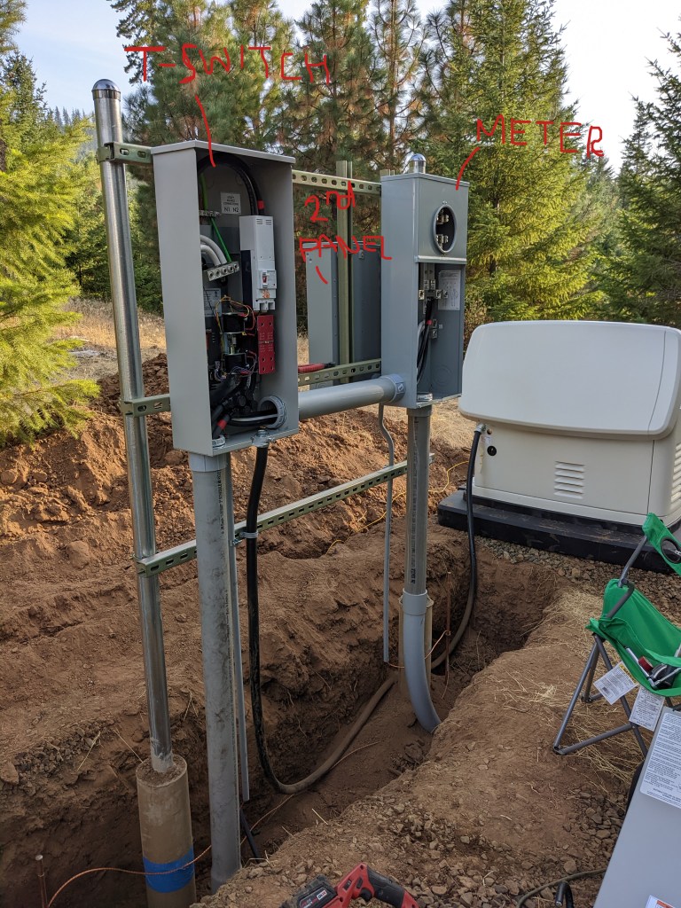 The power company runs wire from the transformer to the meter as the final step. In the meantime, Sam was able to set everything else up. Power from the meter is split to a service entrance rated transfer switch and a second main panel.