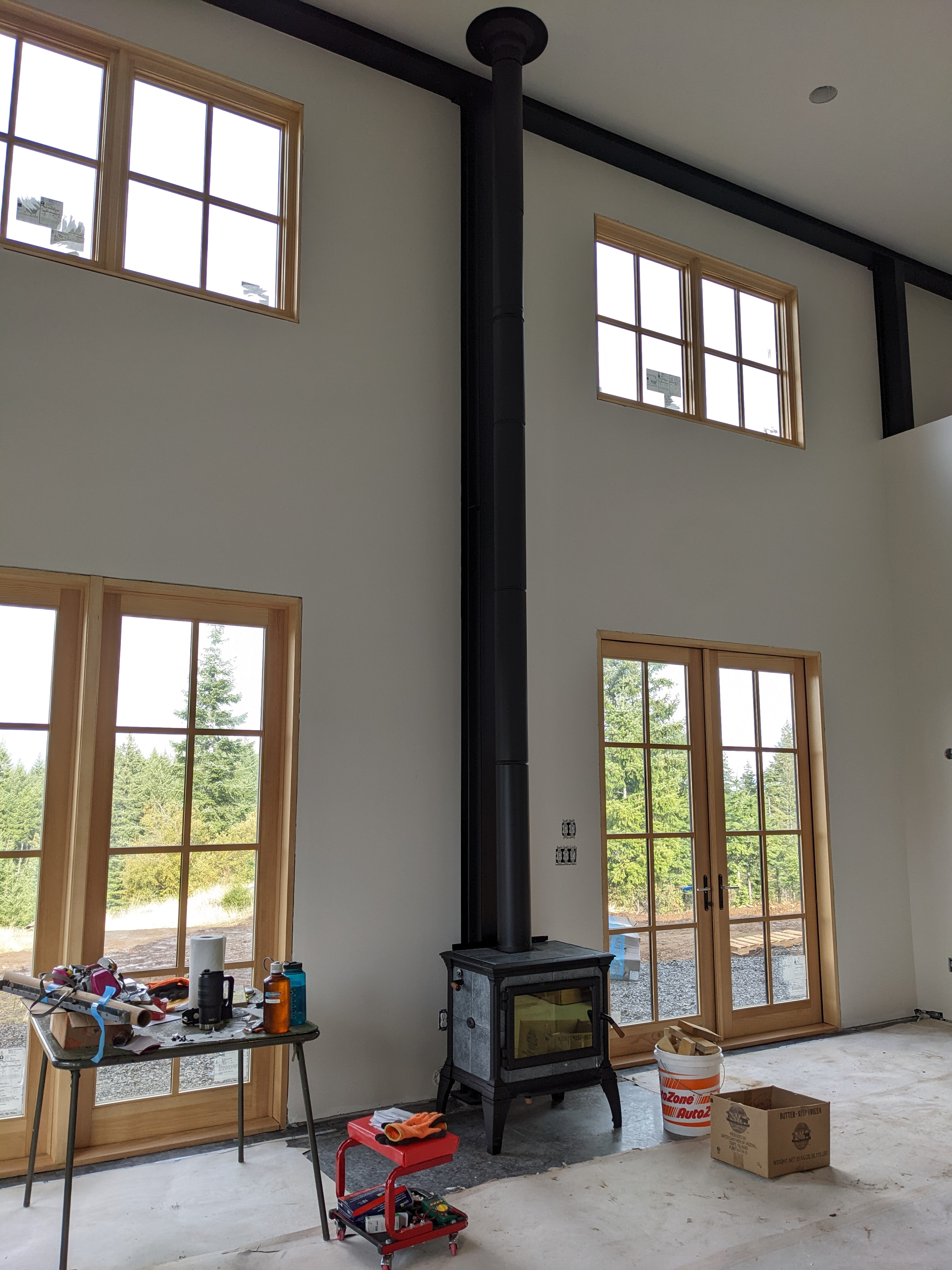 Steve and I set up a peeling station inside the apartment, which is now equipped with a wood stove! (Look how straight that chimney is!)