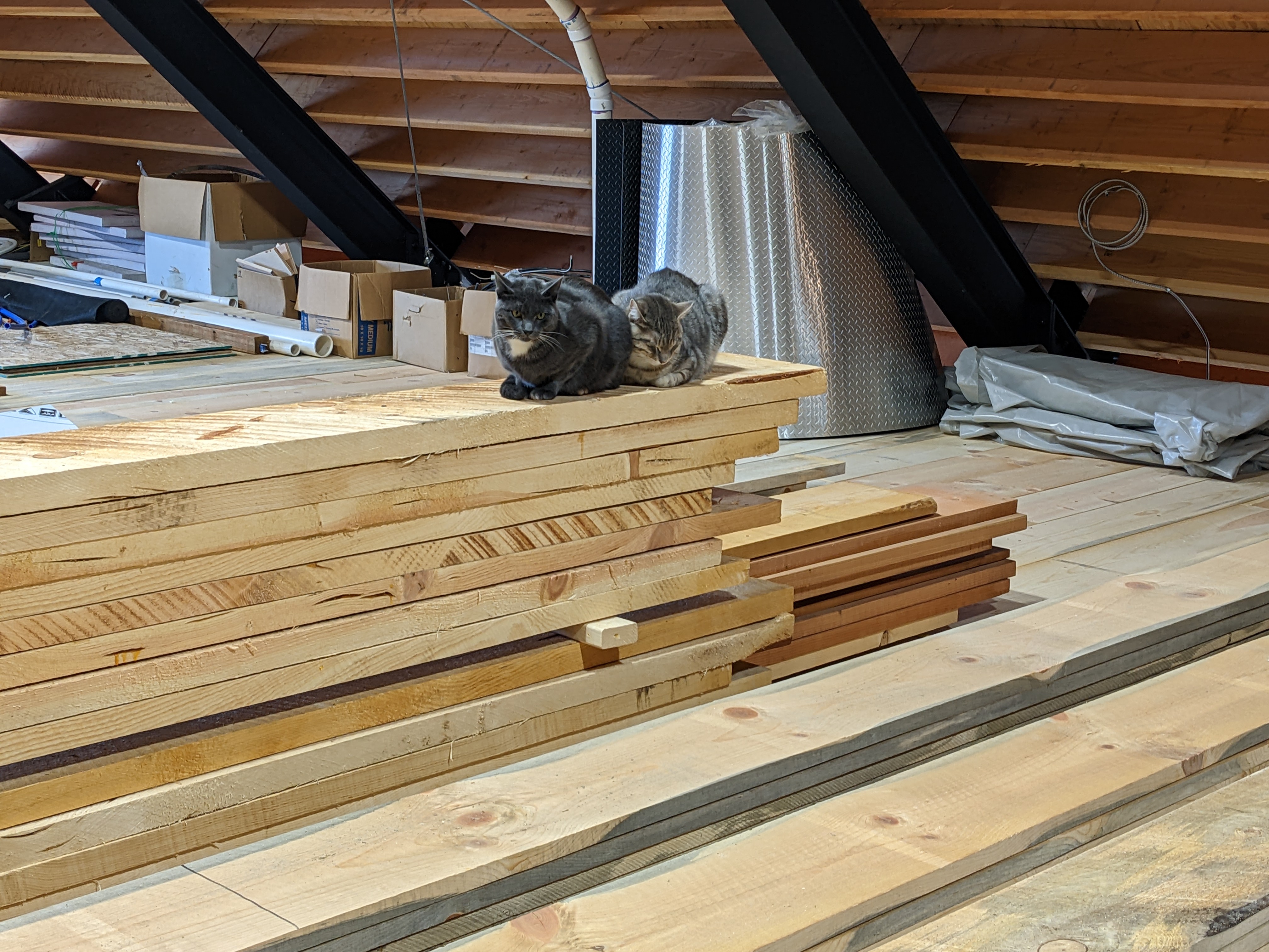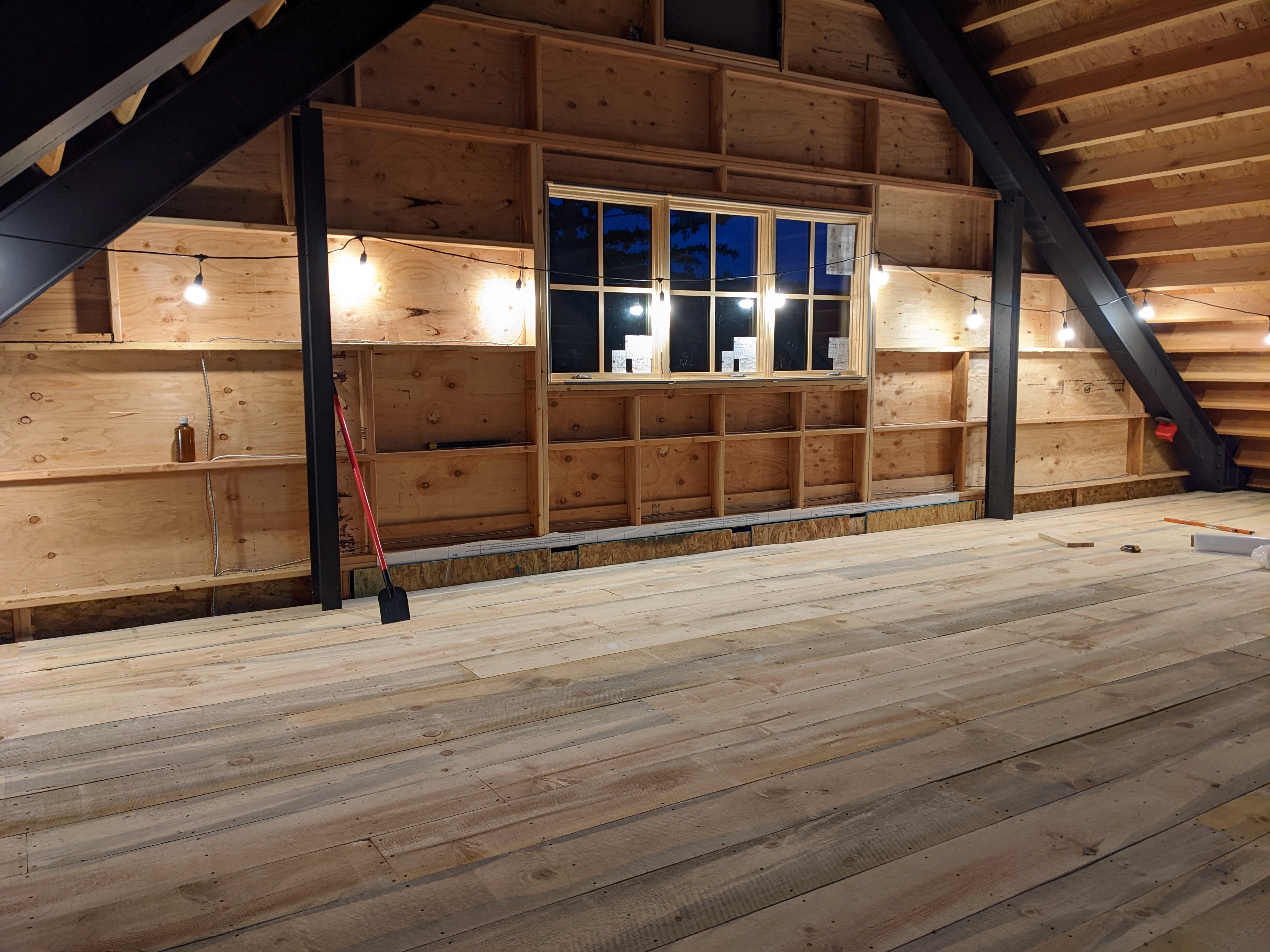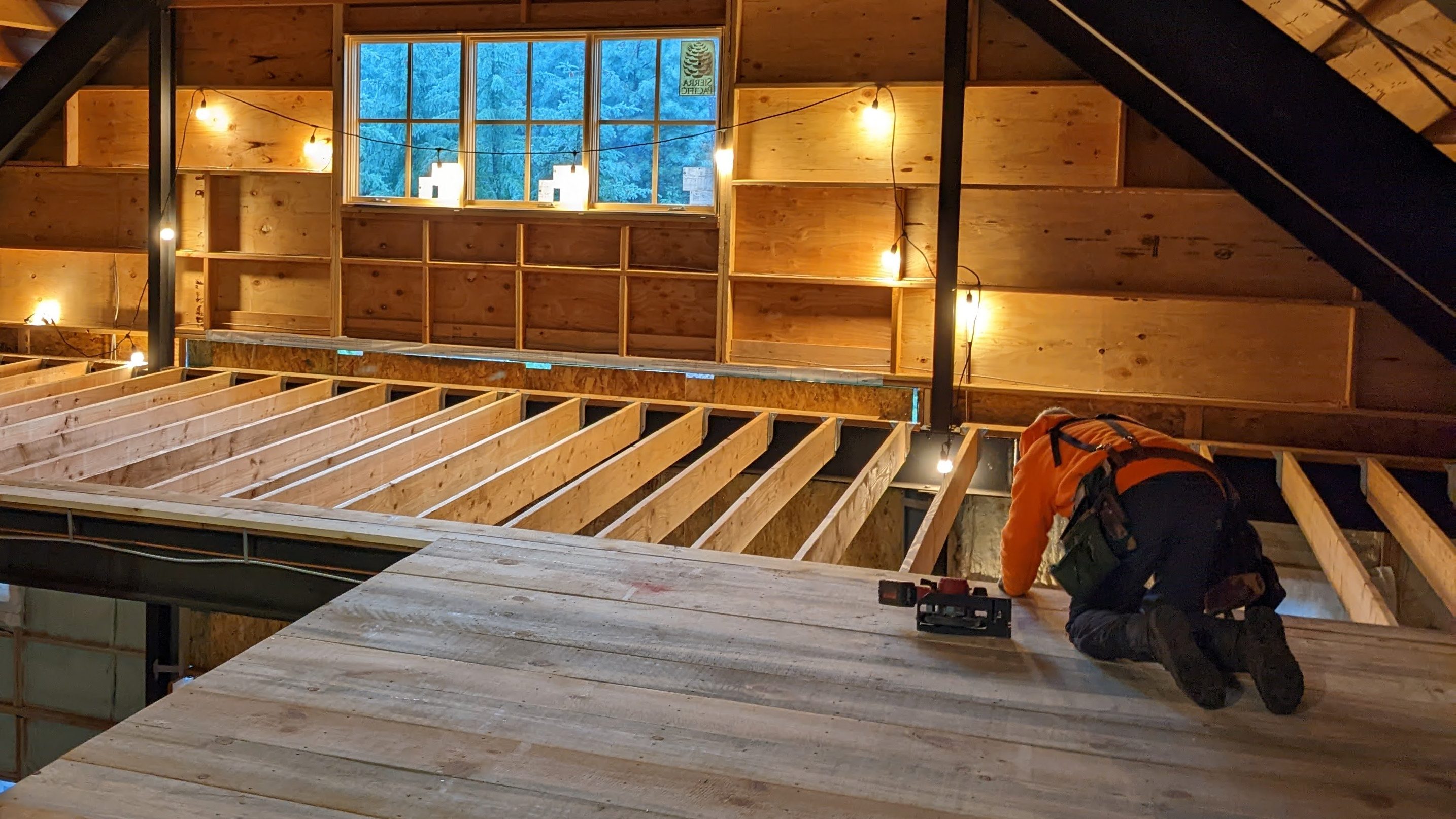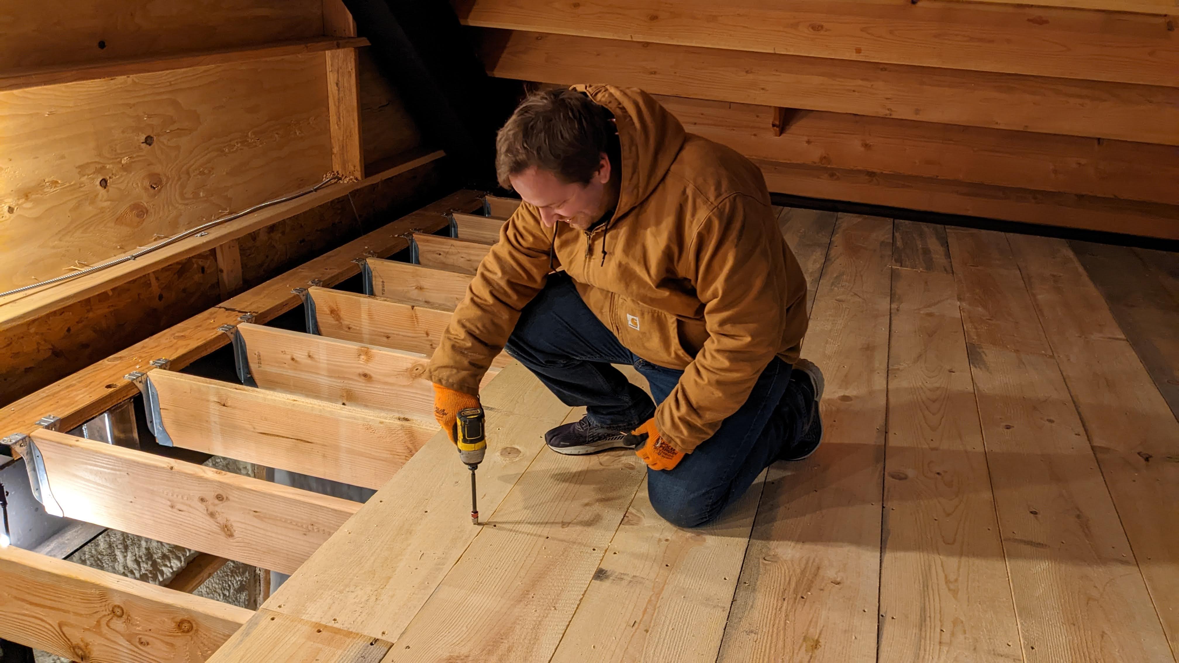 All of us were ready to tire out some different body parts, so we turned our focus to the attic floor. We still had three bays (of seven) left to go, and the last bay was still in need of floor joists. We dusted off the nail guns, dug out the remaining Simpson brackets, cut a few boards, and hung the joists.
