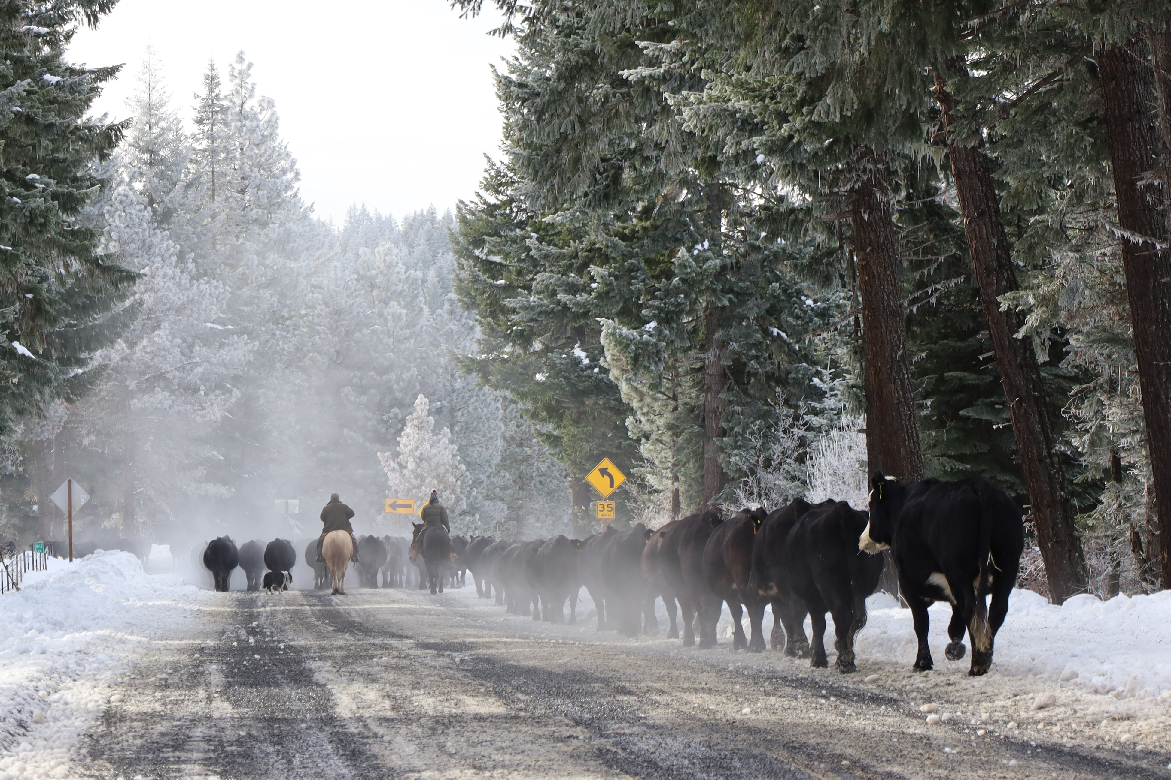 The water system wasn’t hooked up nor was the heat. Plus our our temporary doors weren’t sealed, and the insulation in the shop was incomplete. We were not prepared for winter! We weren’t the only ones who got caught with our pants down. All the cows weren’t home yet! They had to parade down the road since the snow was too deep along their trail.
