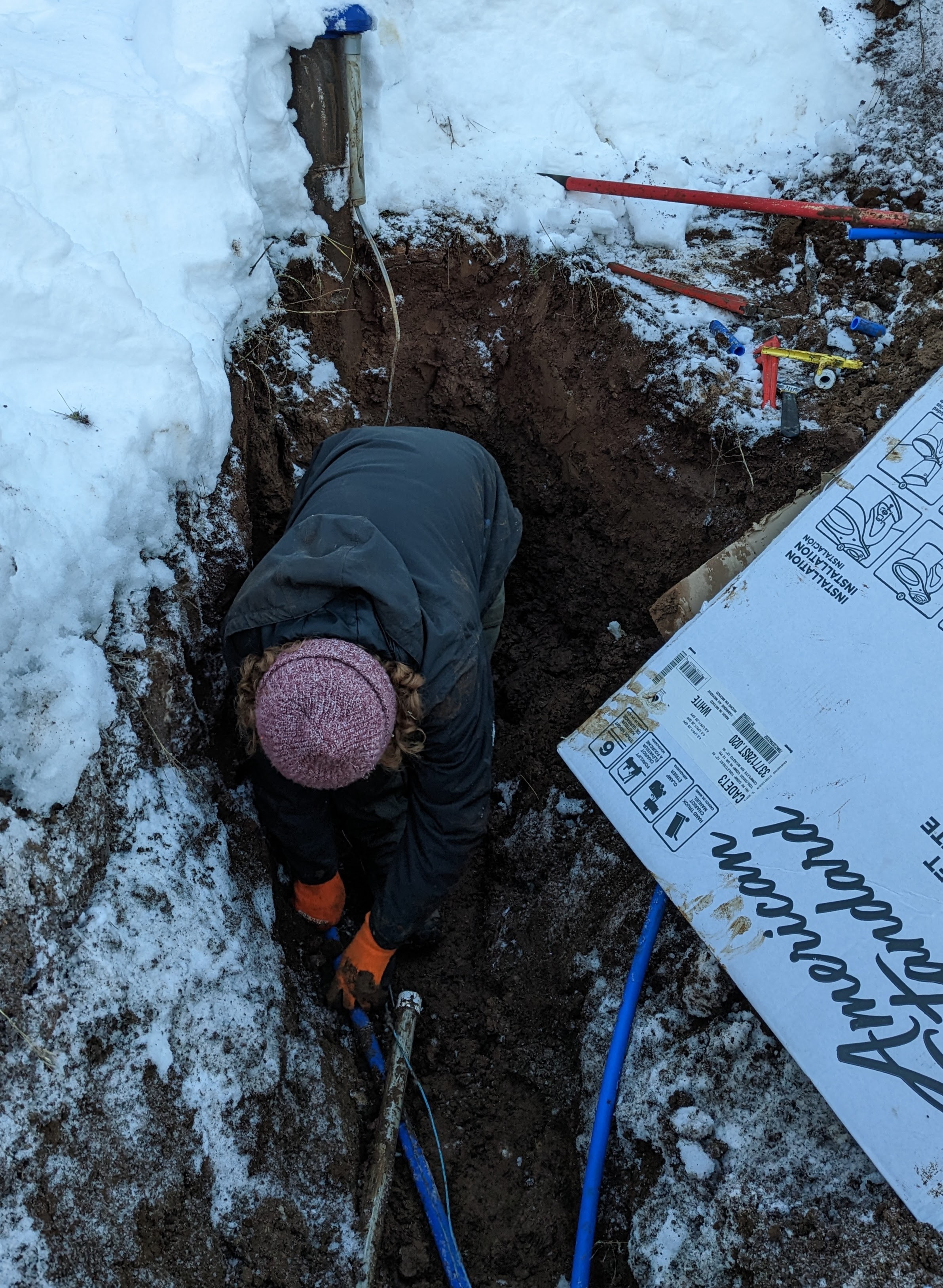 At this point we were ready to decommission our temporary water system, which consisted of a water tank and faucet outside near the well. We had to disconnect the old tank and run water and electrical lines to the new tank in the mechanical room. Disconnecting everything wasn’t so simple. The pipes were buried 3 feet underground, with another few feet of snow on top.