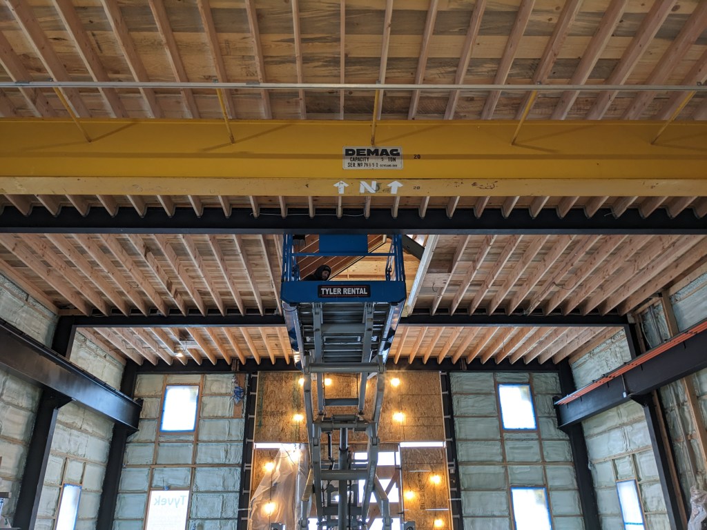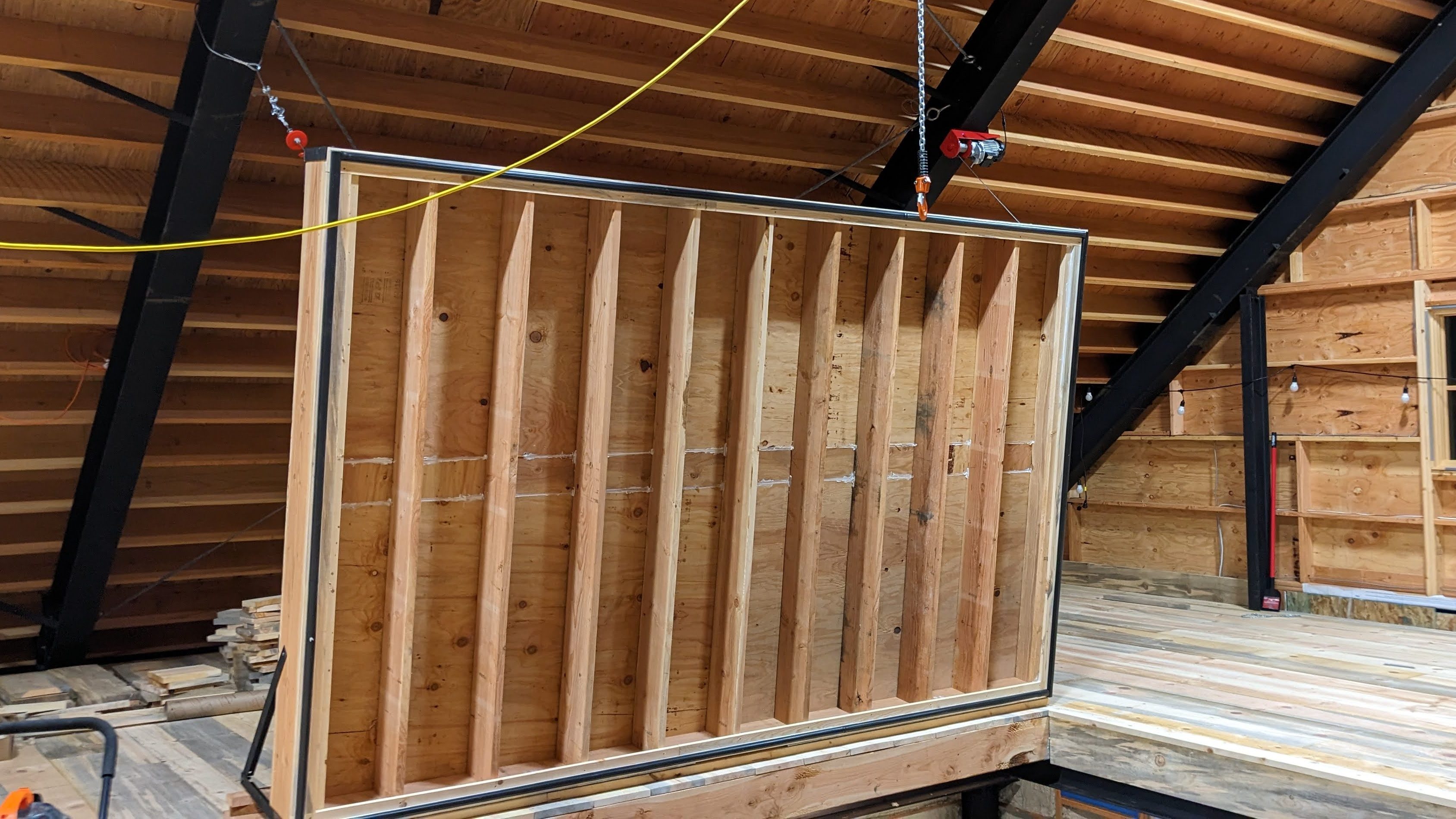 The lifting mechanism is a small Chinese electric lifting hoist. (See tiny red thing with a cable in the background.) Hopefully its price is not an indication of useful life. We mounted the hoist to the steel frame of the building. It was a bit tricky finding a mounting location that was both efficient for lifting and somewhat out of the way.
