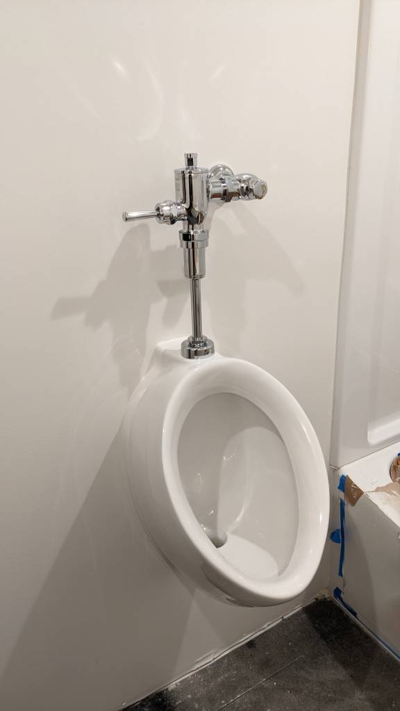 The shop bathroom is still a work in progress, but it’s almost fully functional (with the exception of the shower). The tiny space is home to a toilet, urinal, shower/tub, and “manity”.