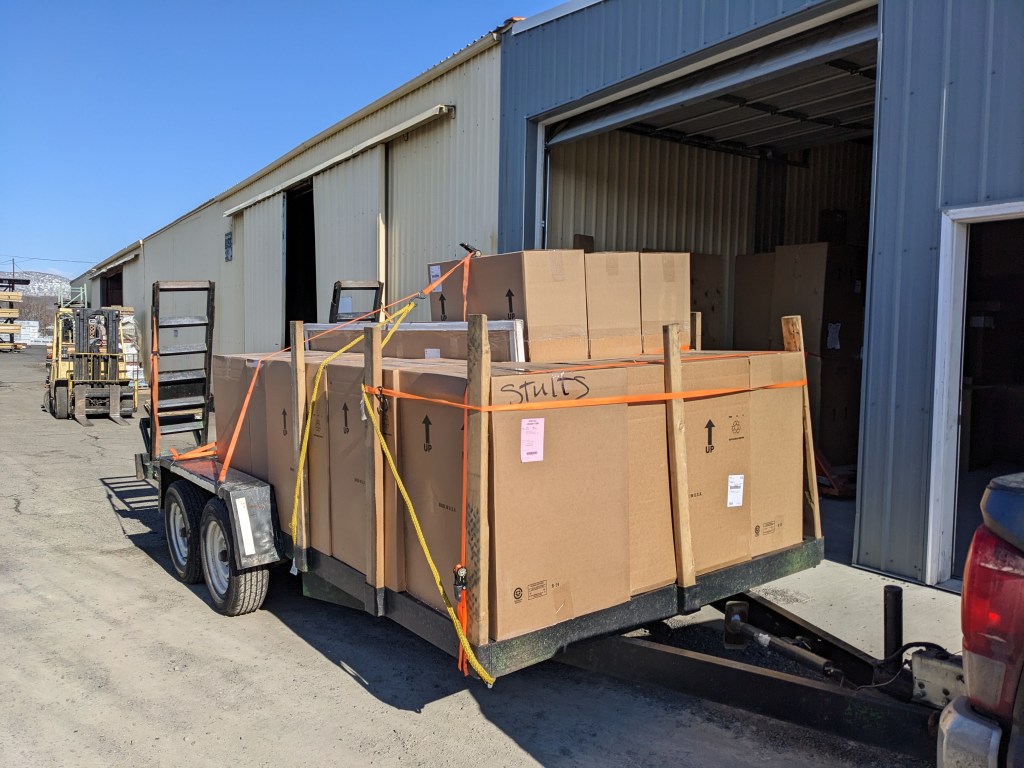 Our kitchen cabinets arrived! Selecting a brand was just as lengthy of a process as designing the kitchen layout. We went with a brand called DeWils, made here in WA. They only took 4 months to arrive (faster than some!). We picked them up in The Dalles and fit all 15 boxes onto the trailer.