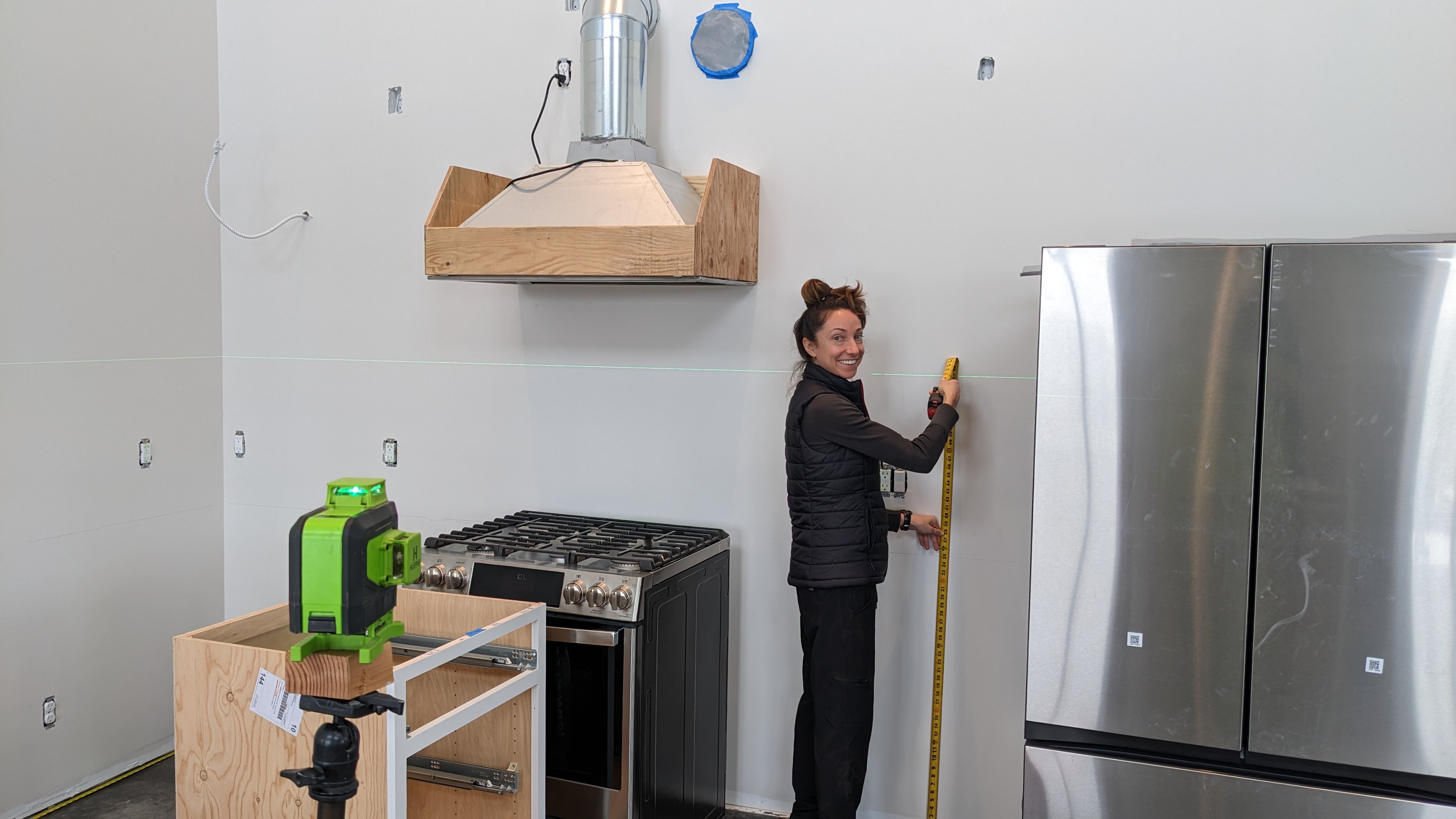 Next, we set up the laser and marked a line near the tops of the base cabinets. This step was important, since the floor isn’t flat. We set a similar line for the upper cabinets. Then we located the studs in the wall. We also looked through our photos and noted a few locations dense with wires where we shouldn’t drill.