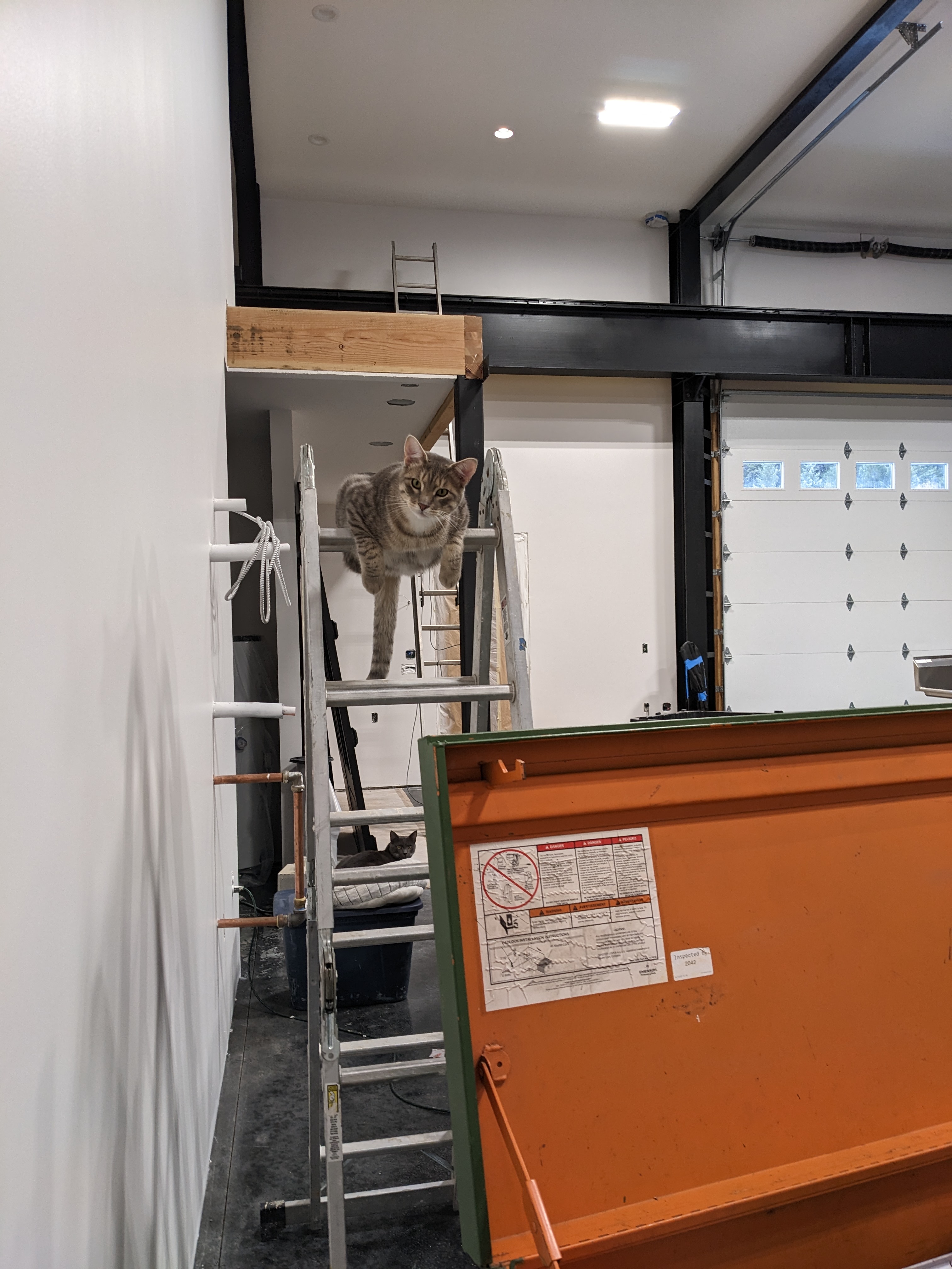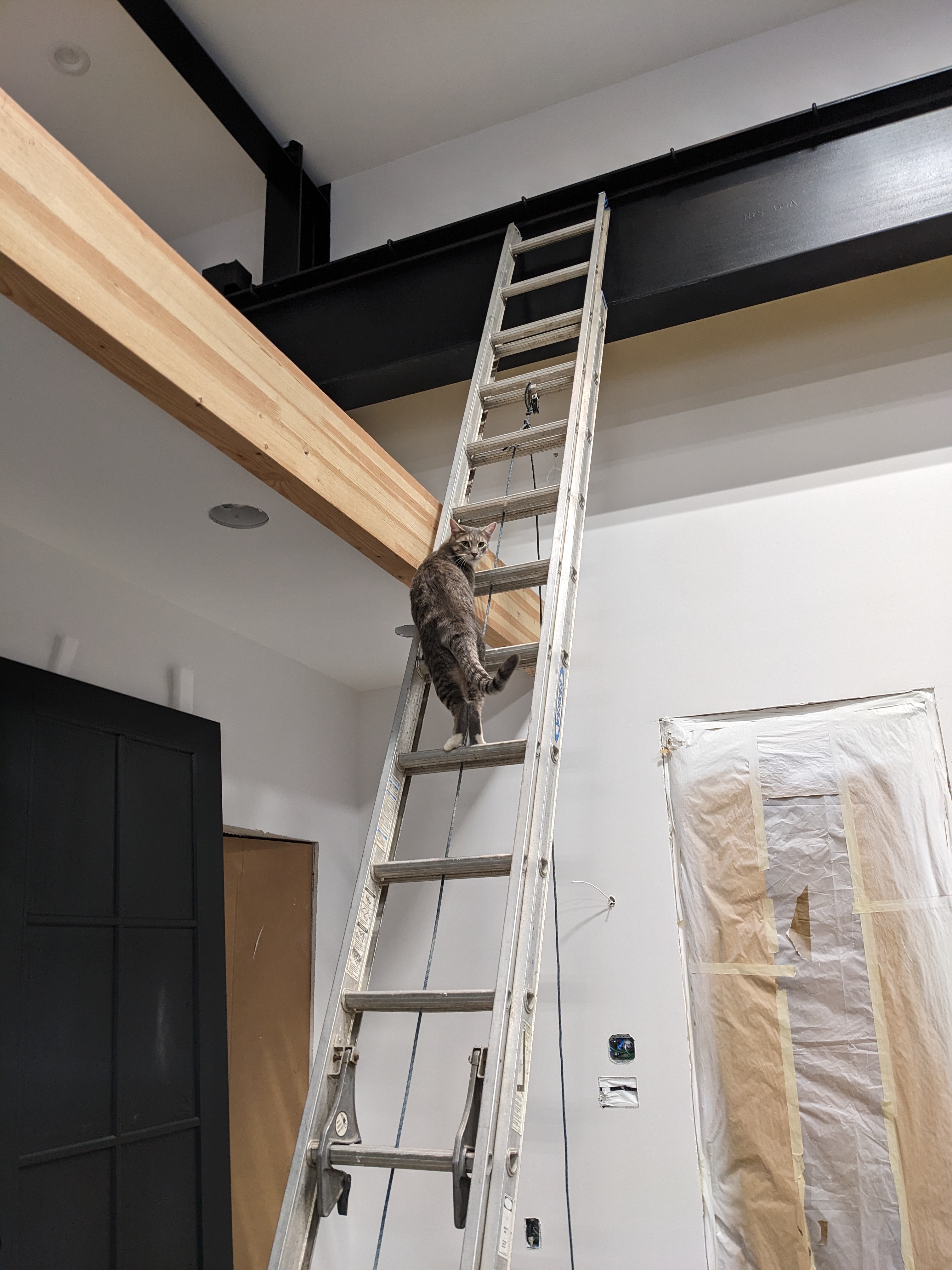 We finished the upper cabinets in a day. They passed Buster’s inspection. Have I mentioned his love of ladders? These were all taken on the same day.