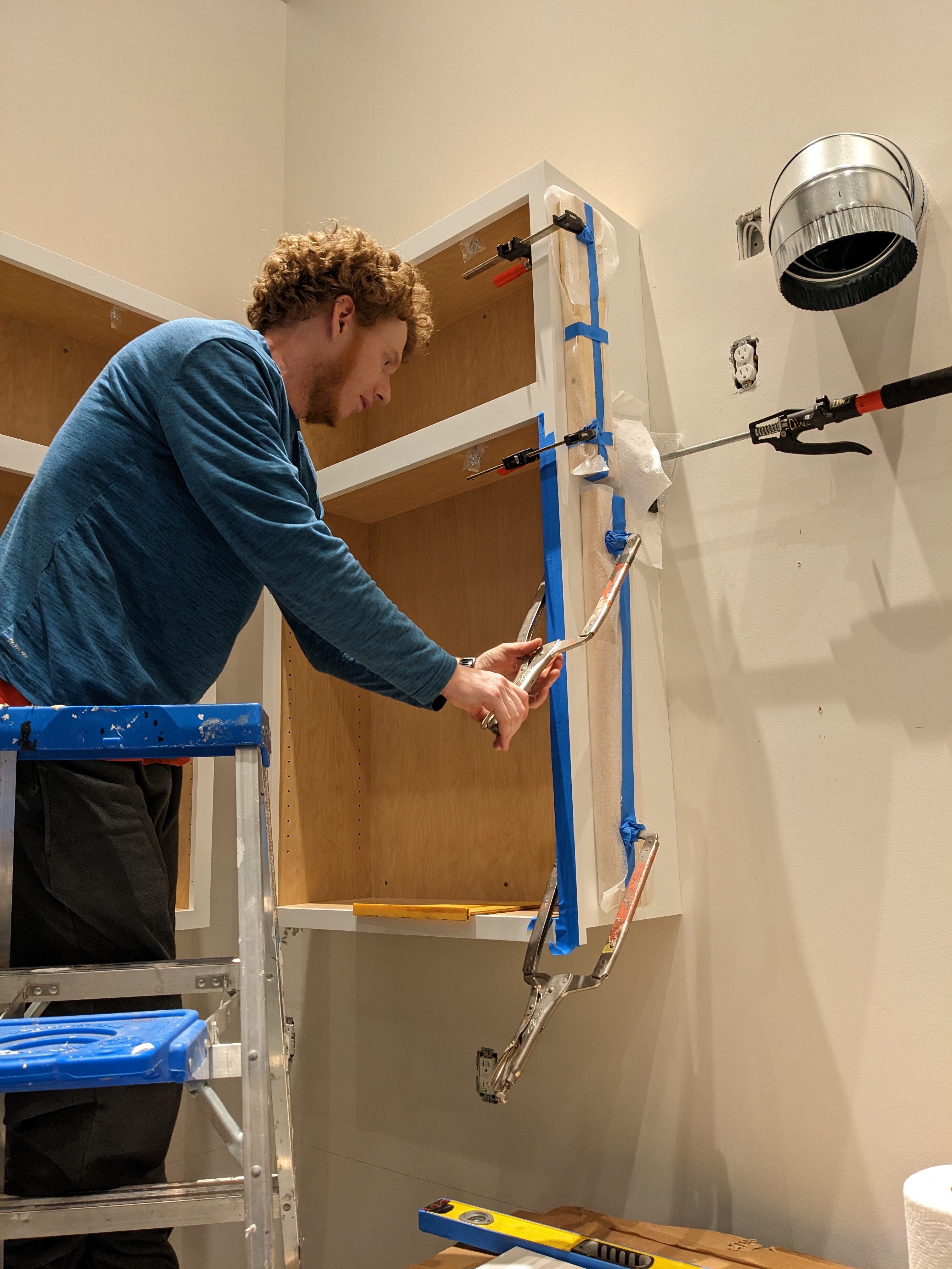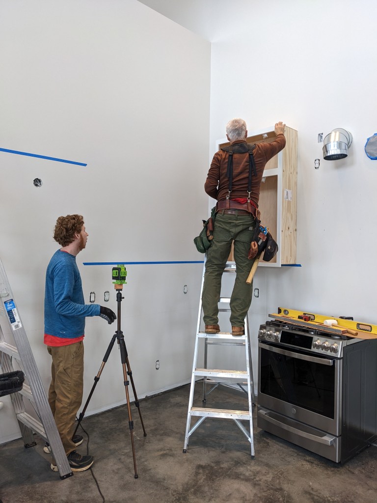 We were ready for Douglas! He was only available for 3 days, so we didn’t want to waste a minute. We began with the upper cabinets, starting in the corner. The first cabinet was very easy to install.