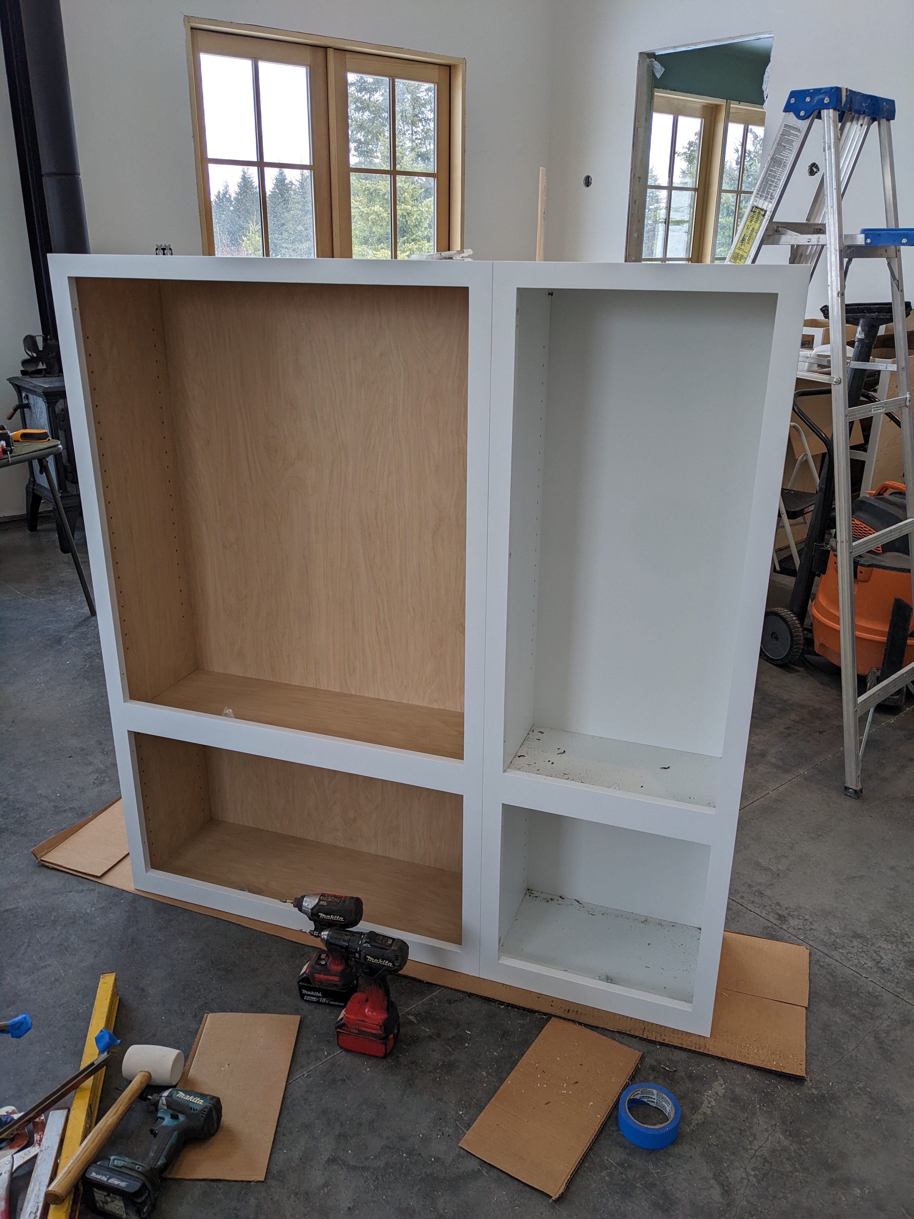 As soon as the cabinets arrived, we called Douglas, the carpenter who helped with the attic floor. He had a small window in his schedule to help us with the cabinet installation. Sam and I spent a few days making preparations. It took awhile just to unbox everything. Then we removed all of the doors, drawers, and shelves from each cabinet. While I was labeling the 10th drawer we took out, I realized they sent the wrong drawer fronts! Luckily everything was sorted out for us, and the new drawer fronts were shipped quickly.
