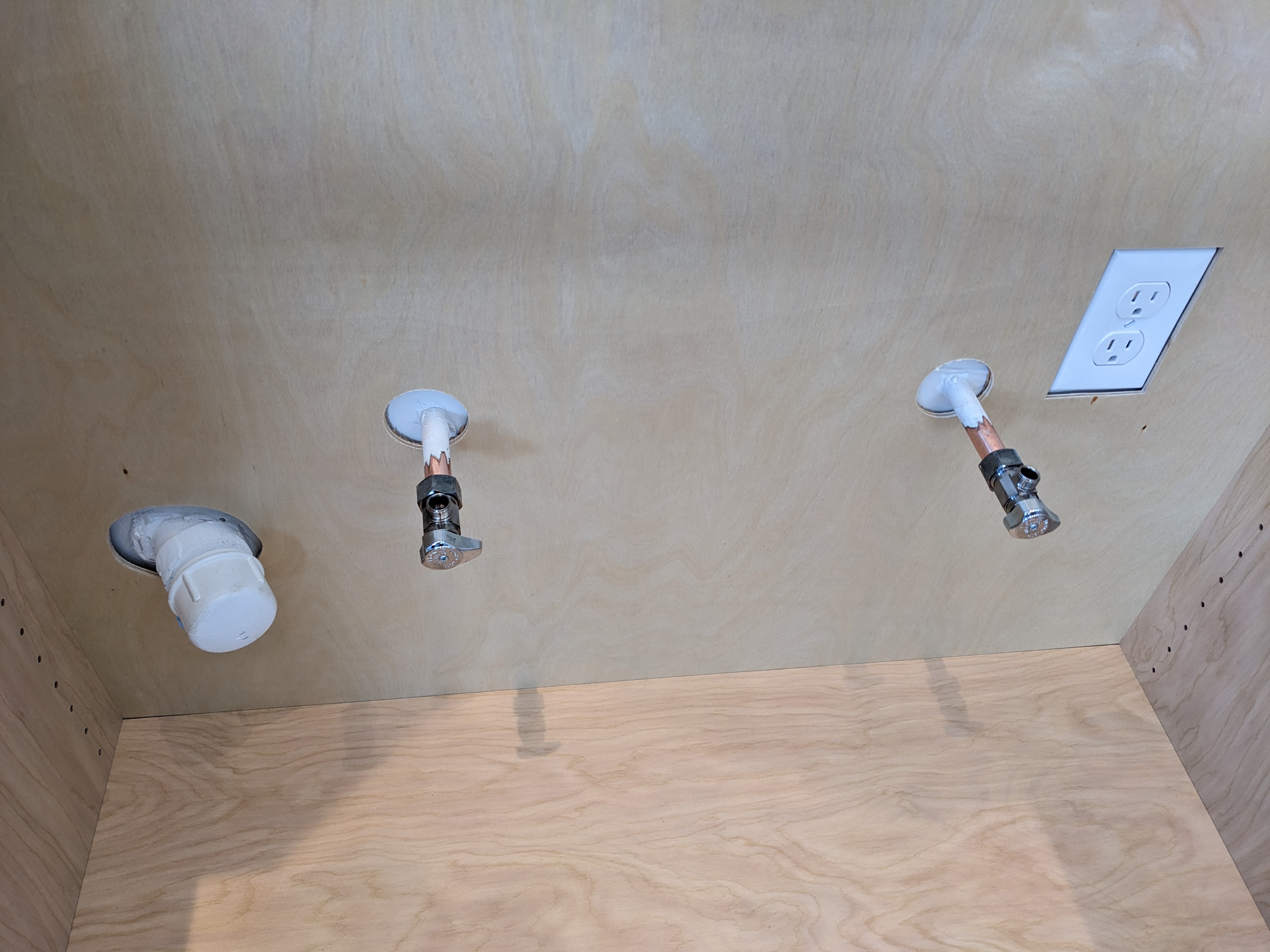 Some custom cutouts were required for receptacles and pipes. The sink cabinet had a lot going on. Sam and I cut some holes out while Douglas did more nuanced carpentry in the corners. I thought Douglas might be more impressed with our work.