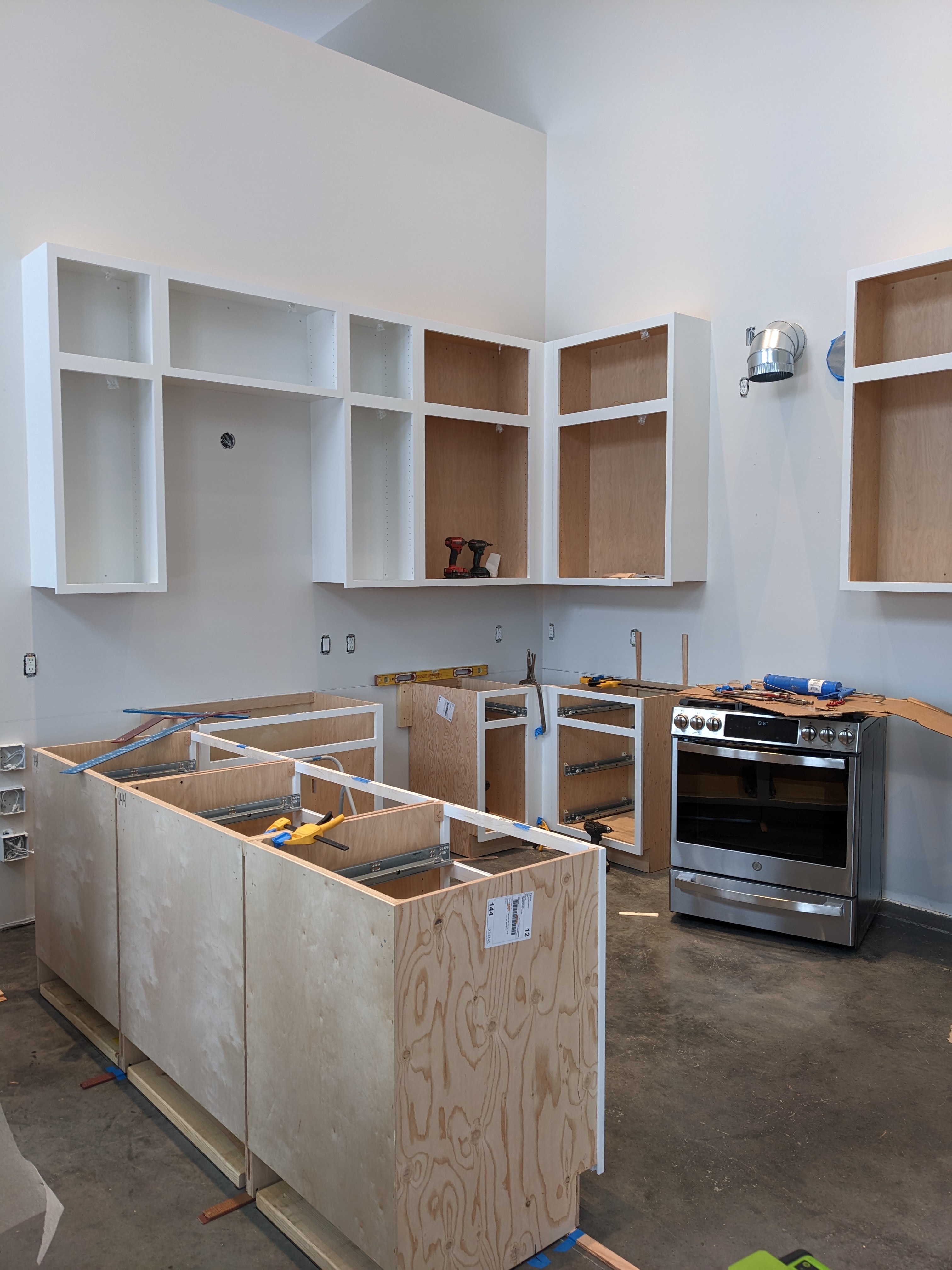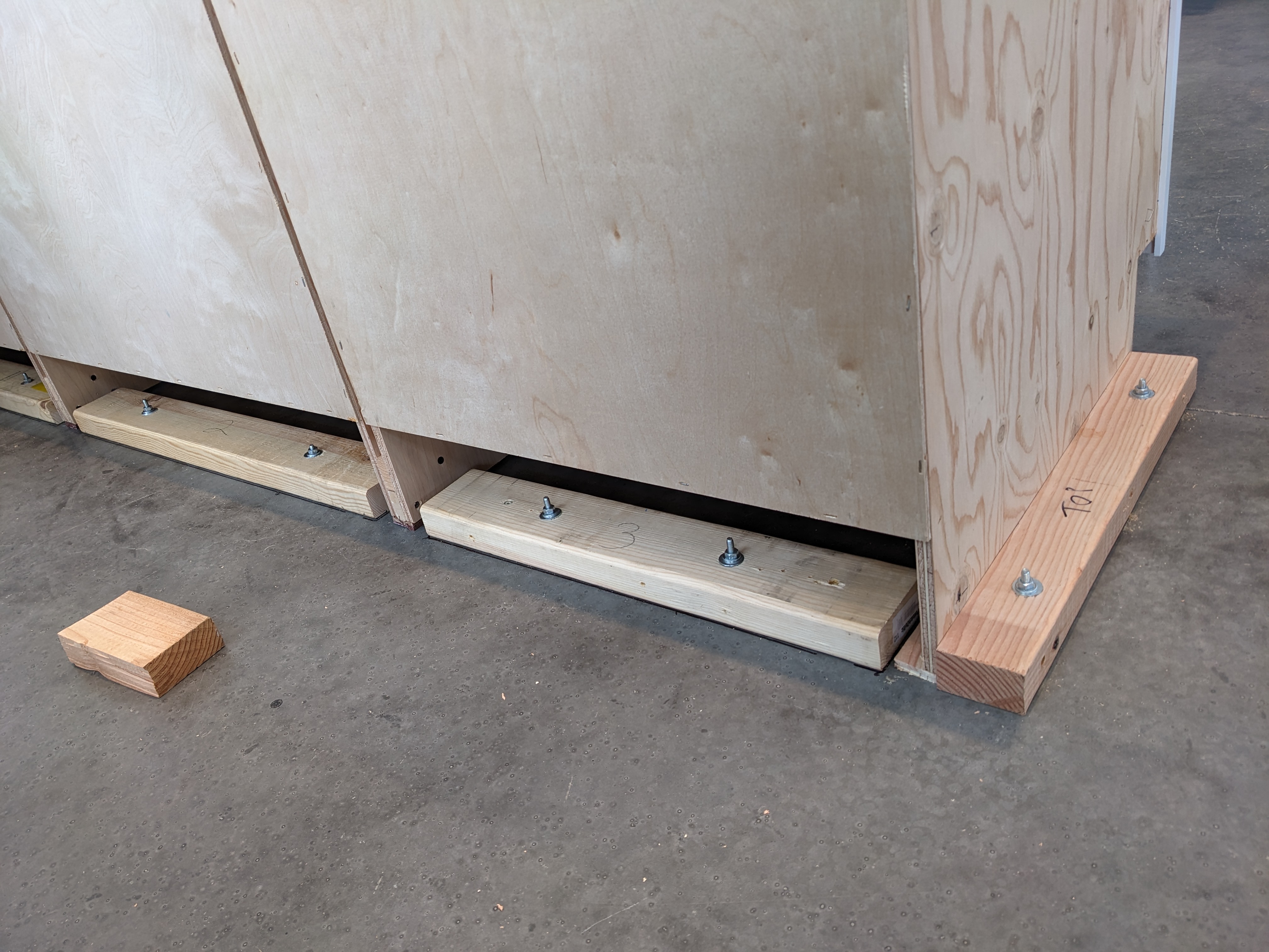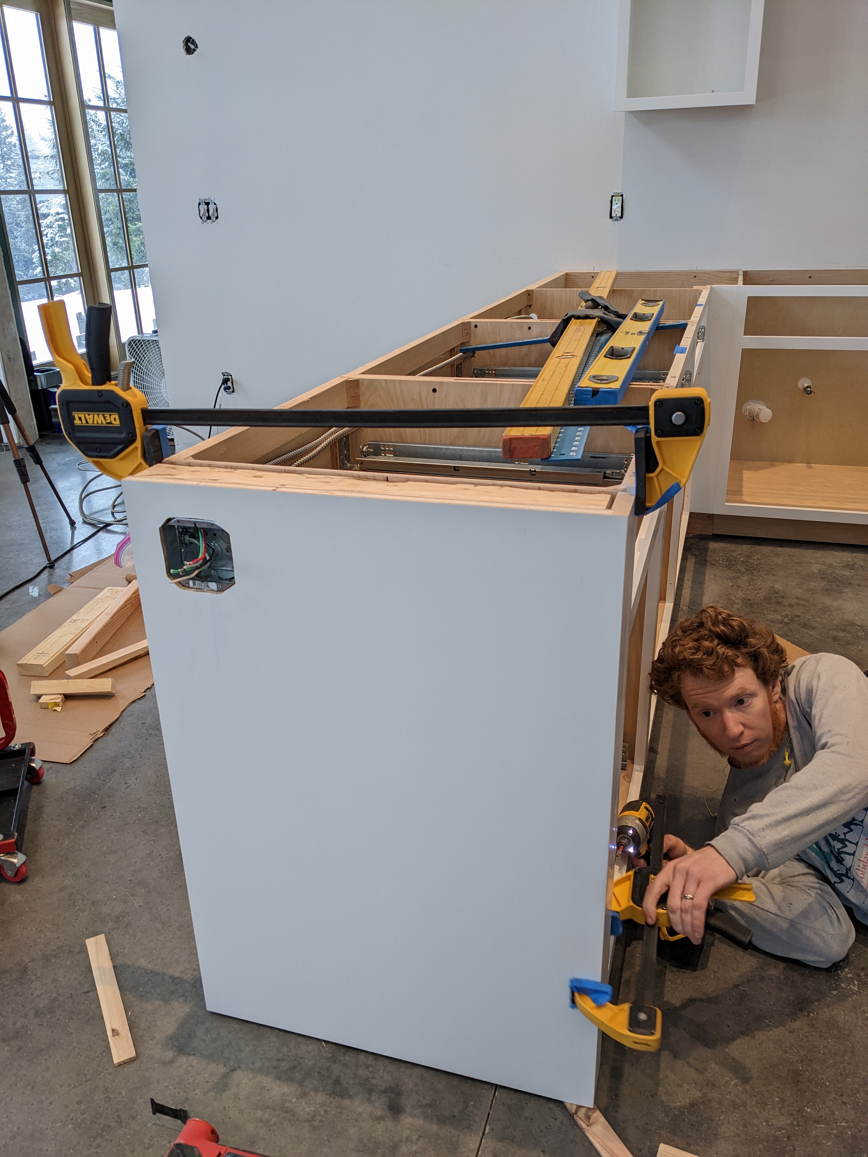 Base cabinets typically screw into the wall and each other. Islands and peninsulas are more challenging. We screwed the three peninsula cabinets to each other first. Then we wiggled the mass around until we were content with its location. We had to compromise between it being parallel to one wall and 90 degrees to the other wall. Then we drilled some holes in the floor to anchor some blocks down.