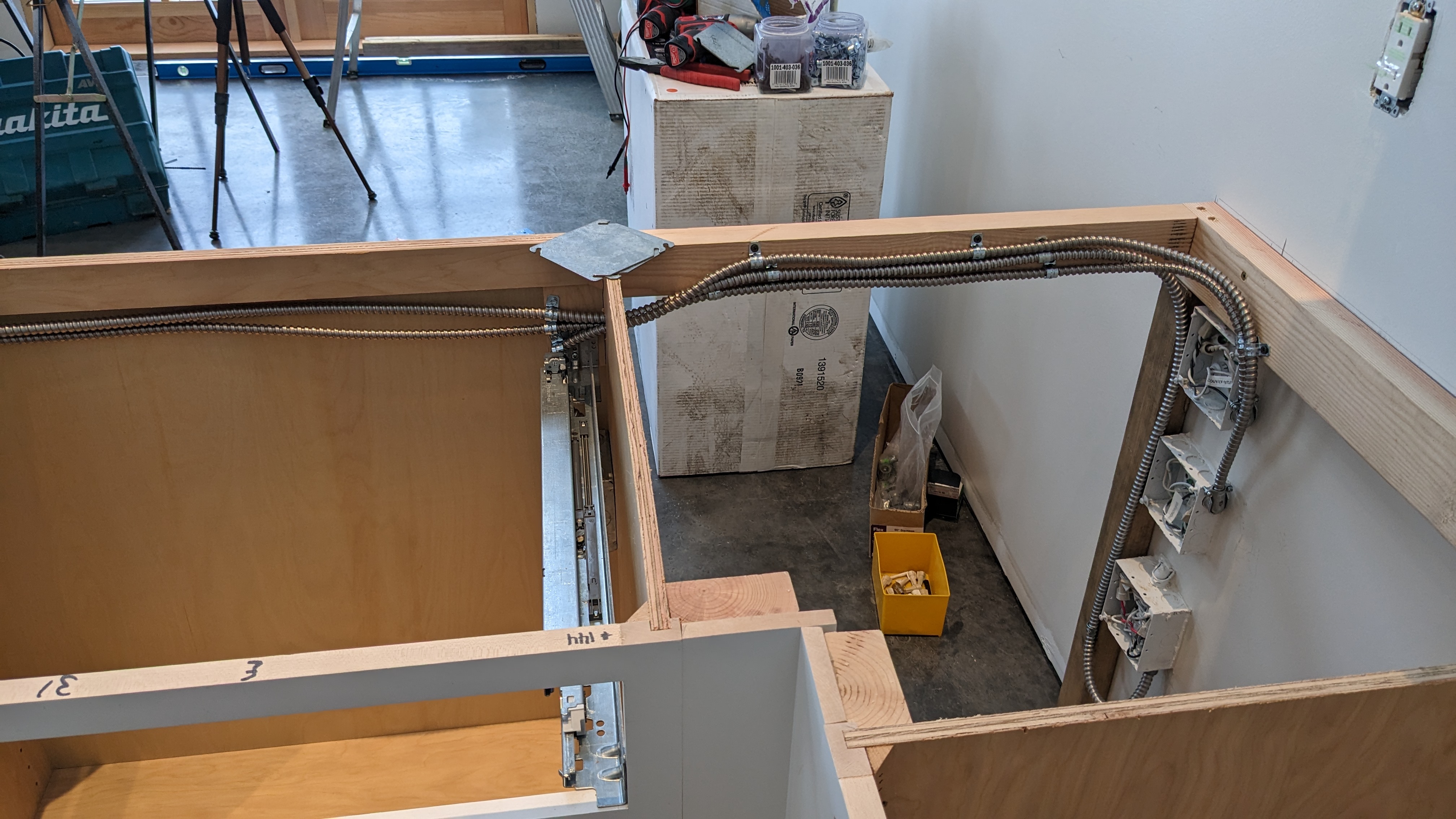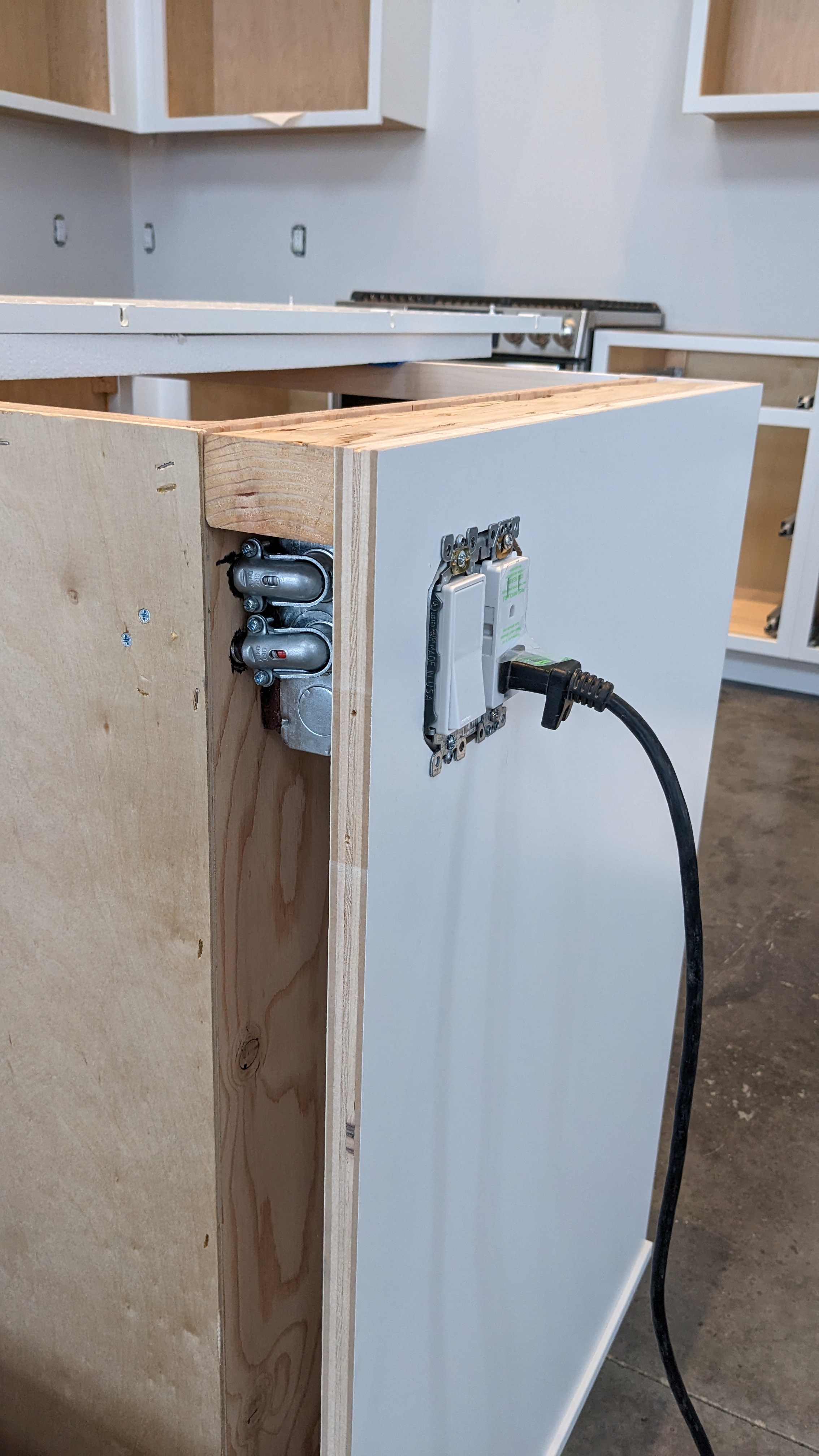 The last panel went on the end of the peninsula to hide the electrical box for an outlet and switch. But first, we had to install the electrical box which meant drilling holes through all our new cabinets. We ran the wires near the top so the drawers should hide everything.