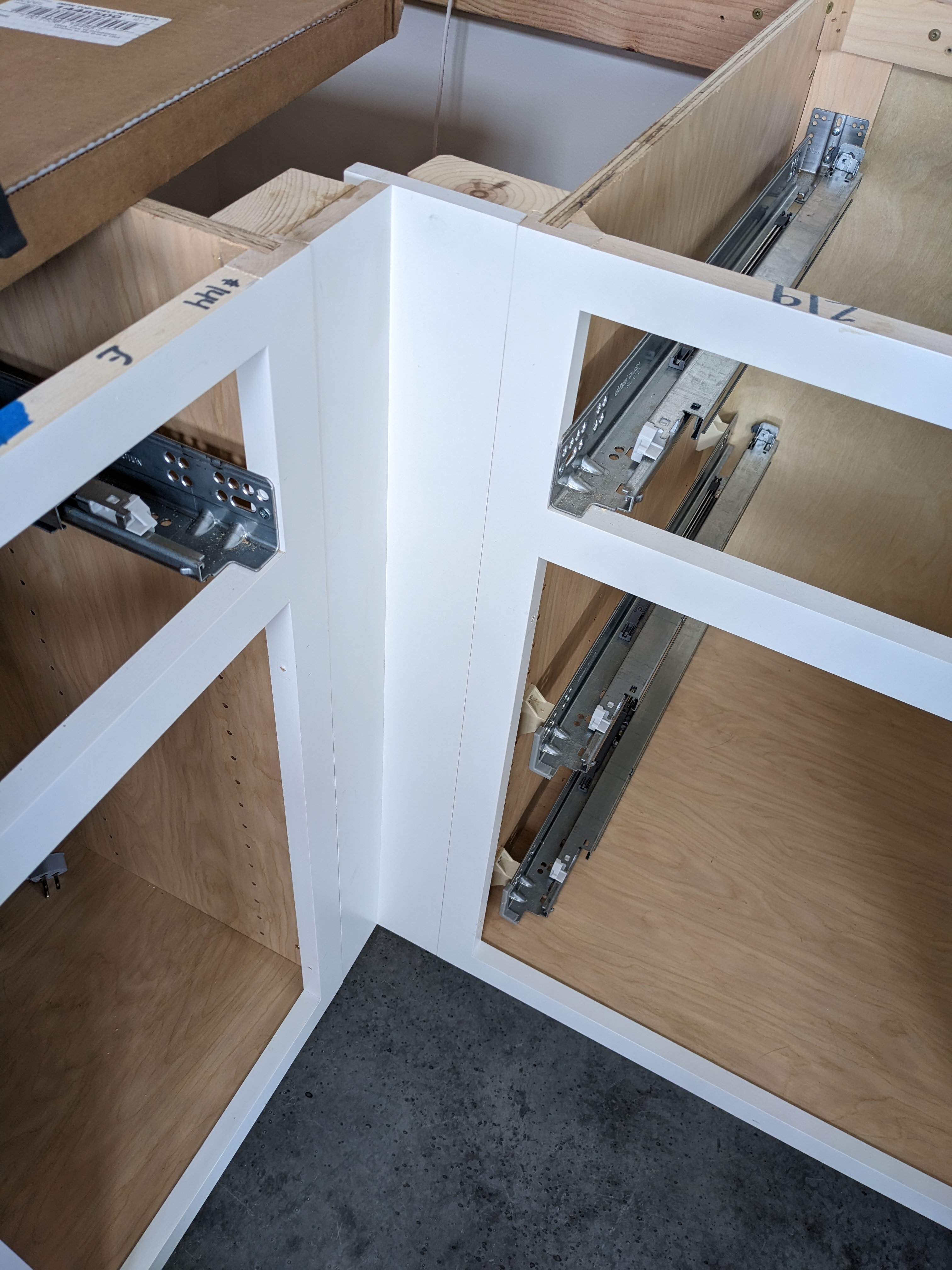 The filler boards were too thin to attach to anything, plus nothing was square. Douglas put some blocking in behind them first. Then he spent a few hours cutting and finessing all the little pieces to fit nicely. Another difficultly was concealing the fasteners. Here is what the corner situation looked like on the base cabinets.