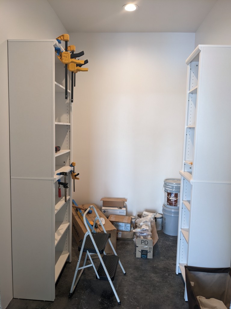 We were on a roll with cabinets after the big kitchen installation, so I ordered some shelves for our closet. There’s a big world of closet systems that I wasn’t aware of. I settled on a fairly inexpensive line from ClosetMaid. They shipped Ikea-style in flat heavy boxes. Unlike my previous experiences with Ikea furniture, these were made better and took longer to assemble.
