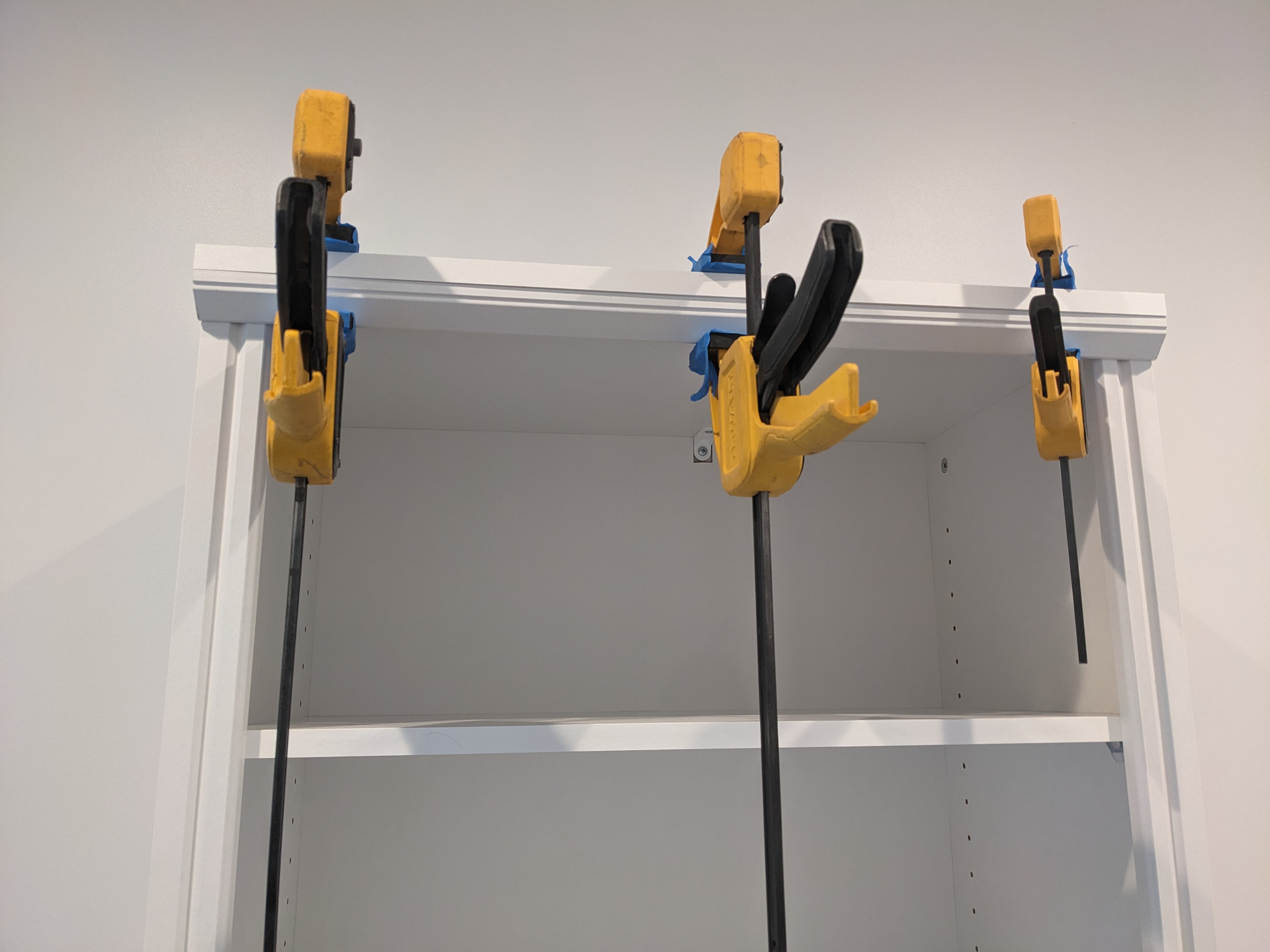 Since my shelf tower was wider, the wall shelves had to be cut to fit. The walls weren’t square so we cut them at an angle. By pure luck, nothing on Sam’s side needed to be modified. The 4 foot shelves fit perfectly in the 113.5″ long space.